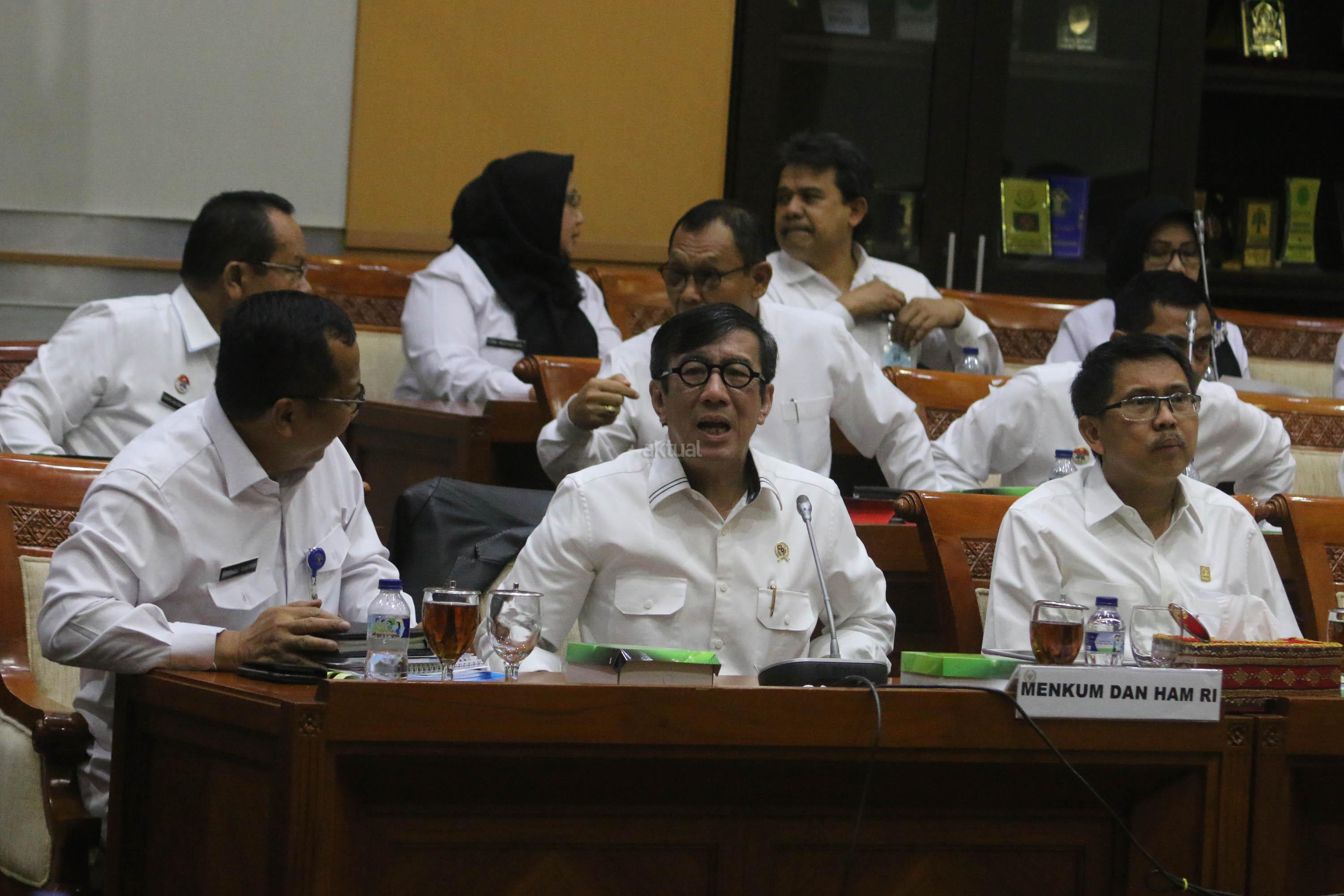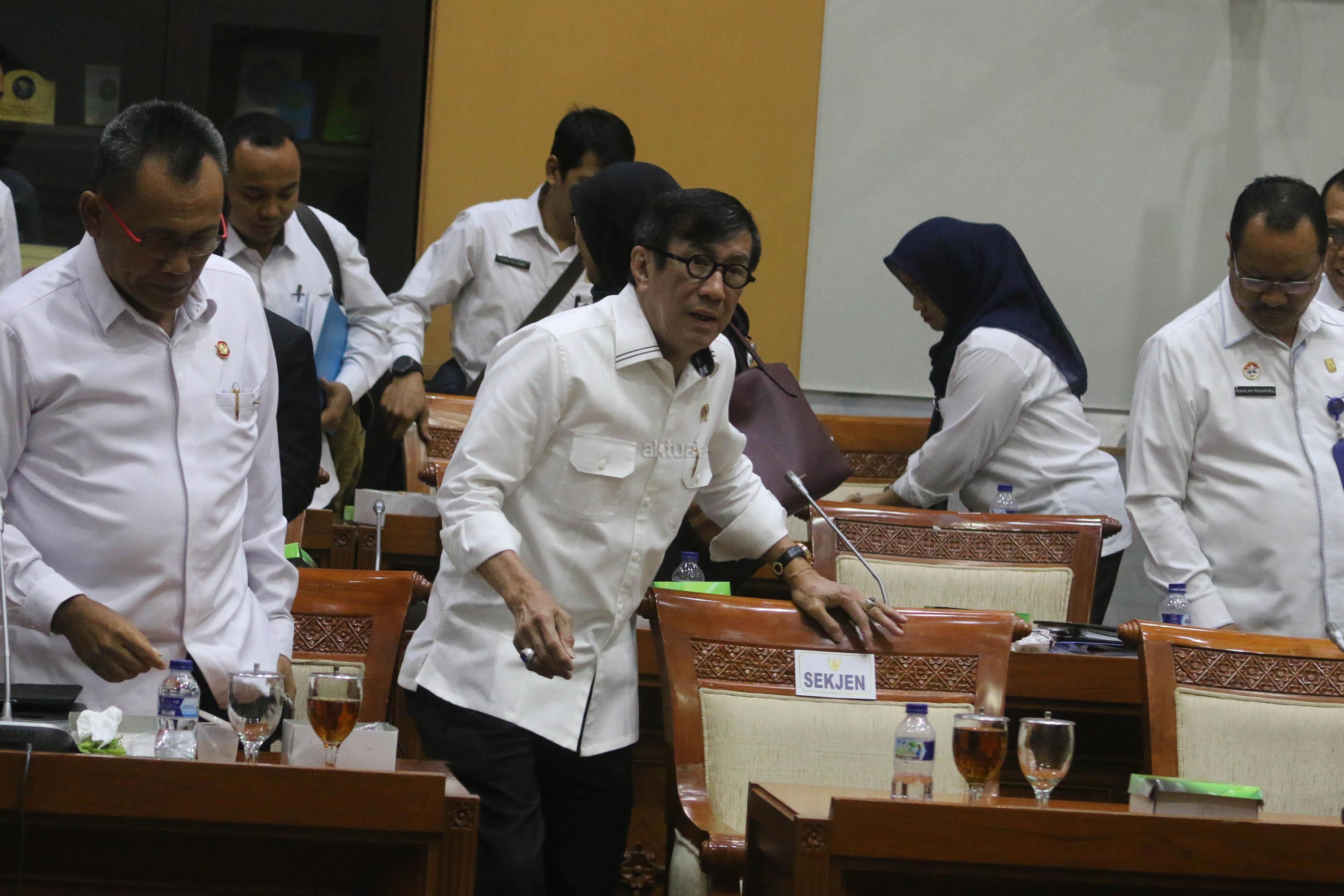 Menteri Hukum dan HAM Yasonna Laoly (tengah) menghadiri Rapat Kerja dengan Komisi III DPR di Gedung Nusantara II, Kompleks Parlemen, Jakarta, Rabu (12/7). Rapat kerja tersebut membahas pemanfaatan teknologi terkait pengawasan orang asing, pelaksanaan perlindungan hak kekayaan intelektual, dan program-program kerja prioritas tahun 2018 serta target yang akan dicapai. AKTUAL/Tino Oktaviano