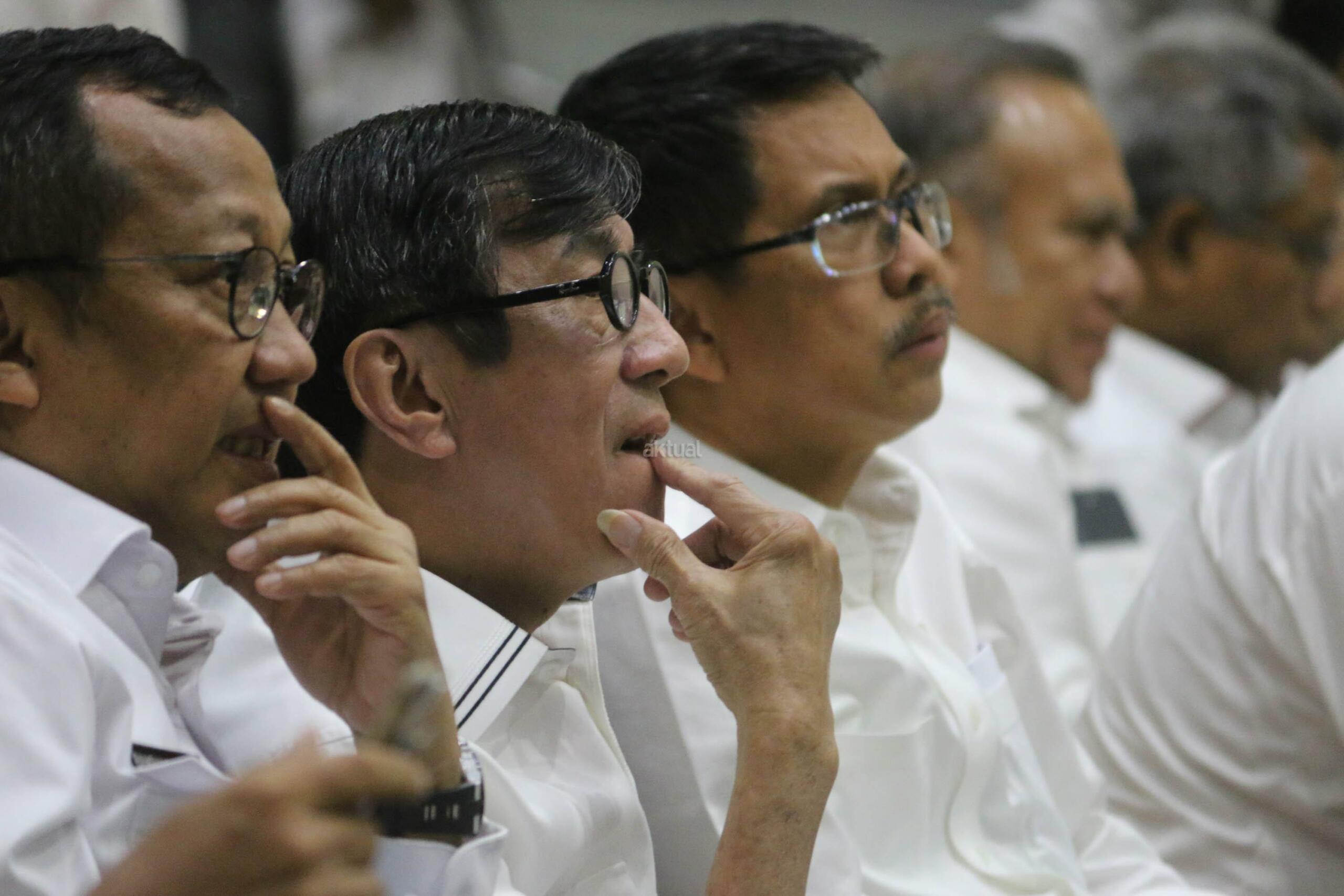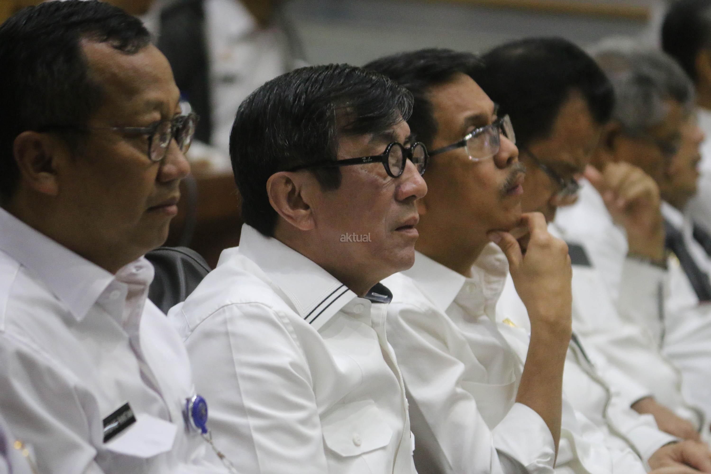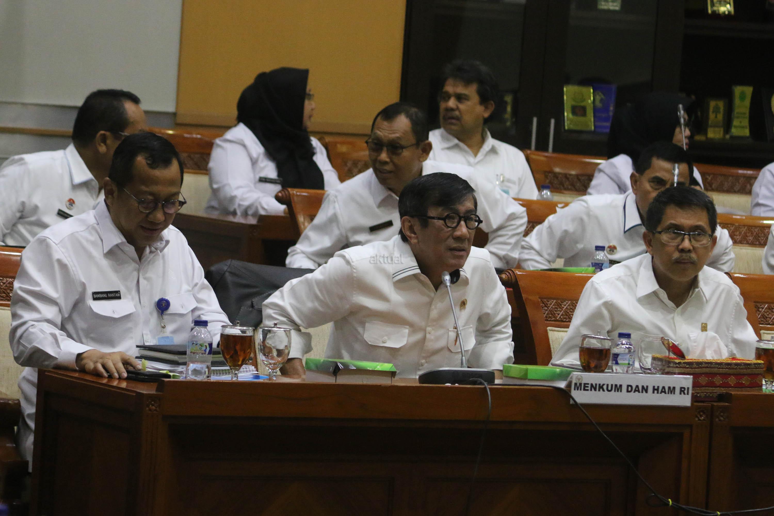 Menteri Hukum dan HAM Yasonna Laoly (kedua dari kiri), mengikuti Rapat Kerja dengan Komisi III DPR di Gedung Nusantara II, Kompleks Parlemen, Jakarta, Rabu (12/7). Rapat kerja tersebut membahas pemanfaatan teknologi terkait pengawasan orang asing, pelaksanaan perlindungan hak kekayaan intelektual, dan program-program kerja prioritas tahun 2018 serta target yang akan dicapai. AKTUAL/Tino Oktaviano