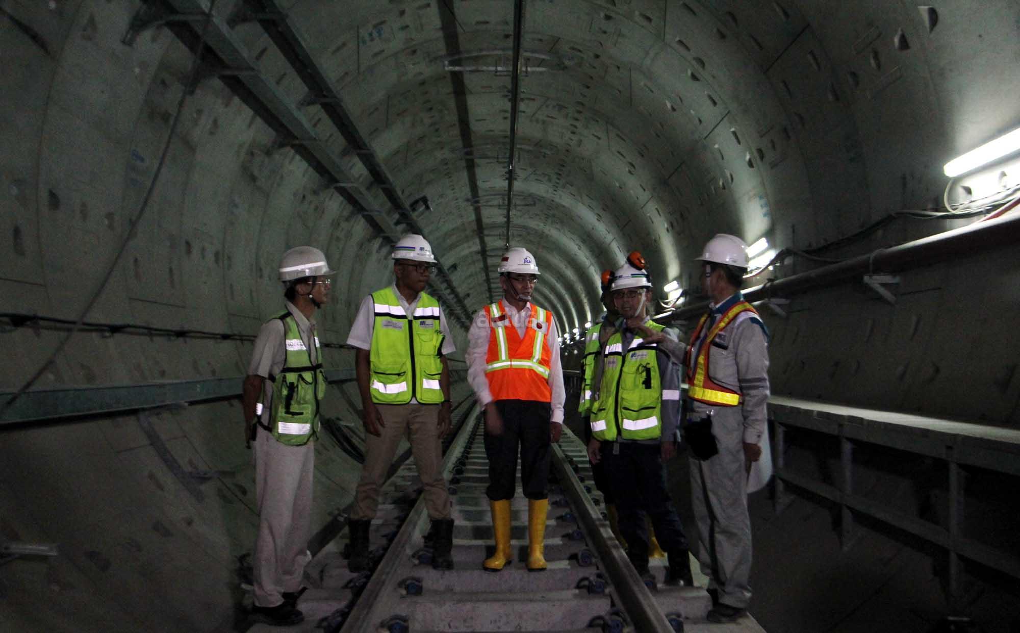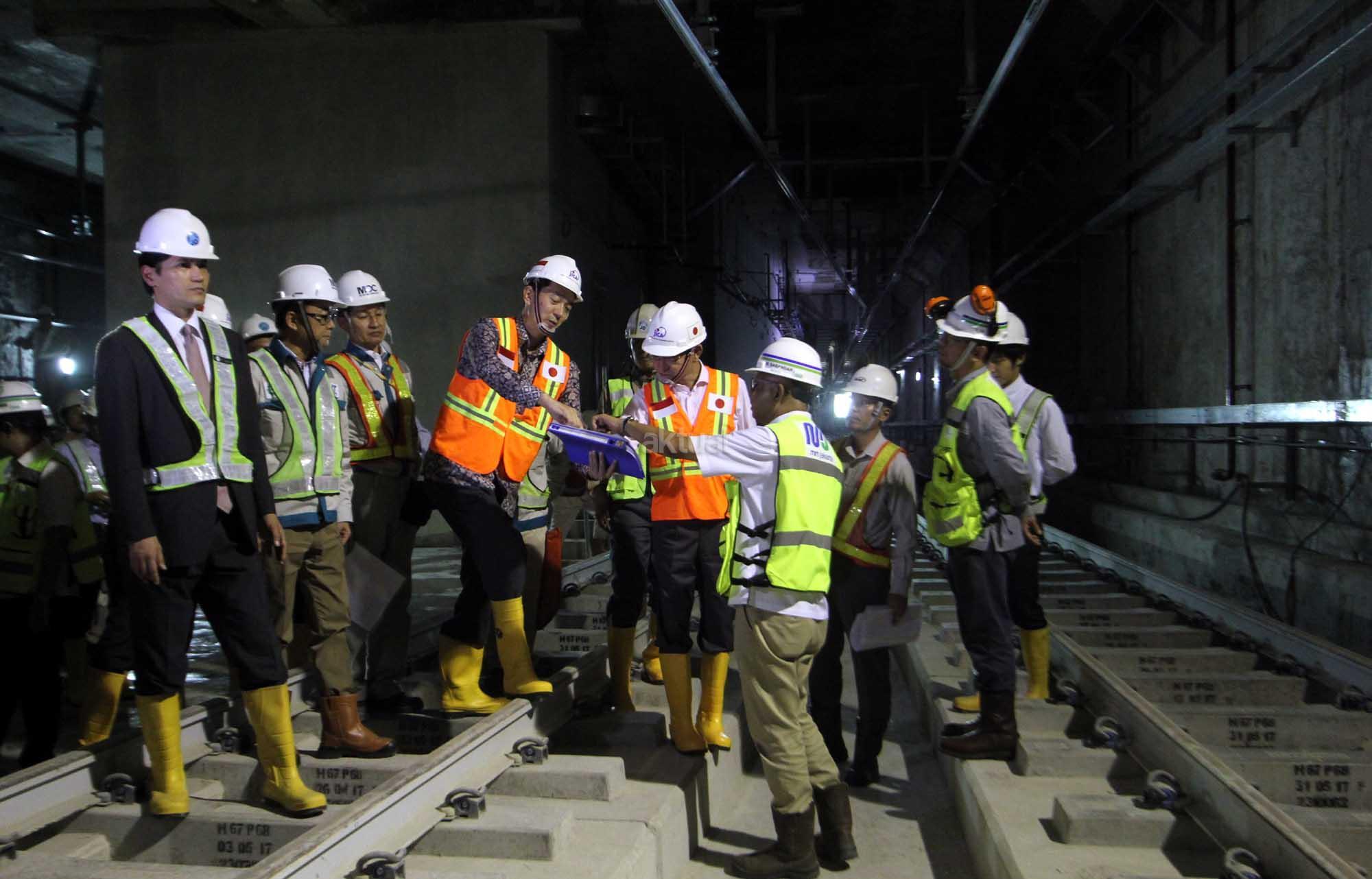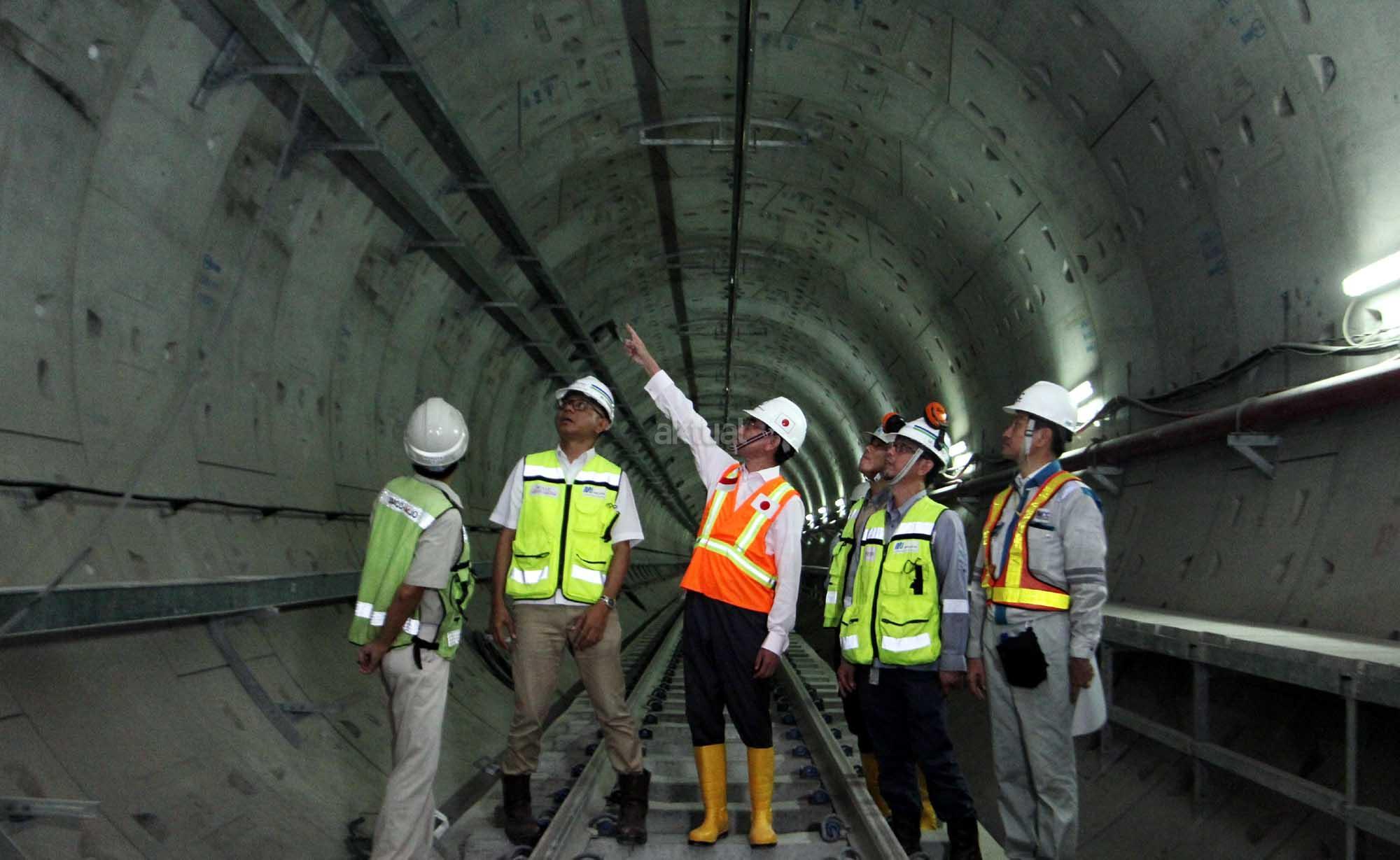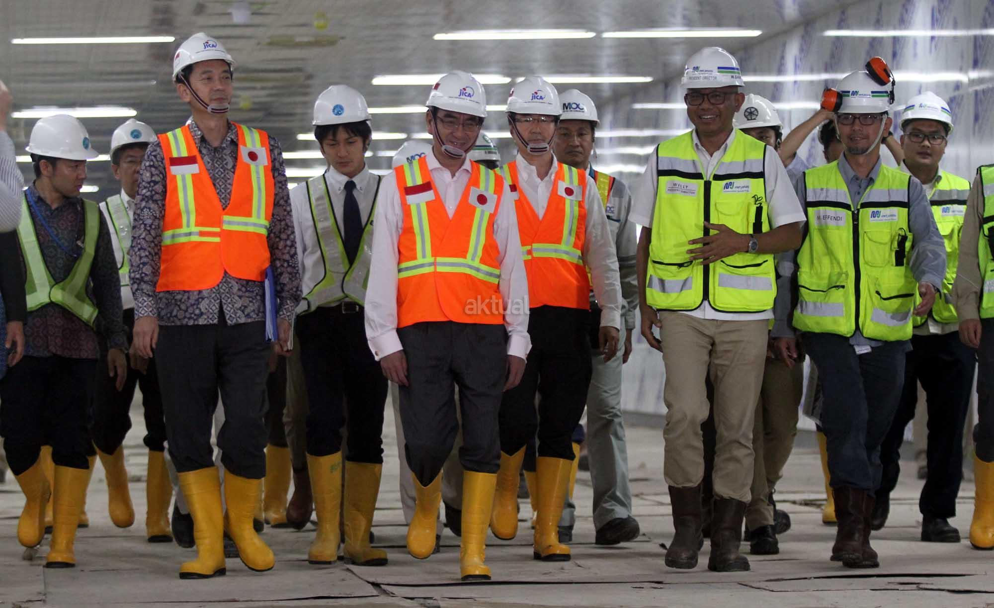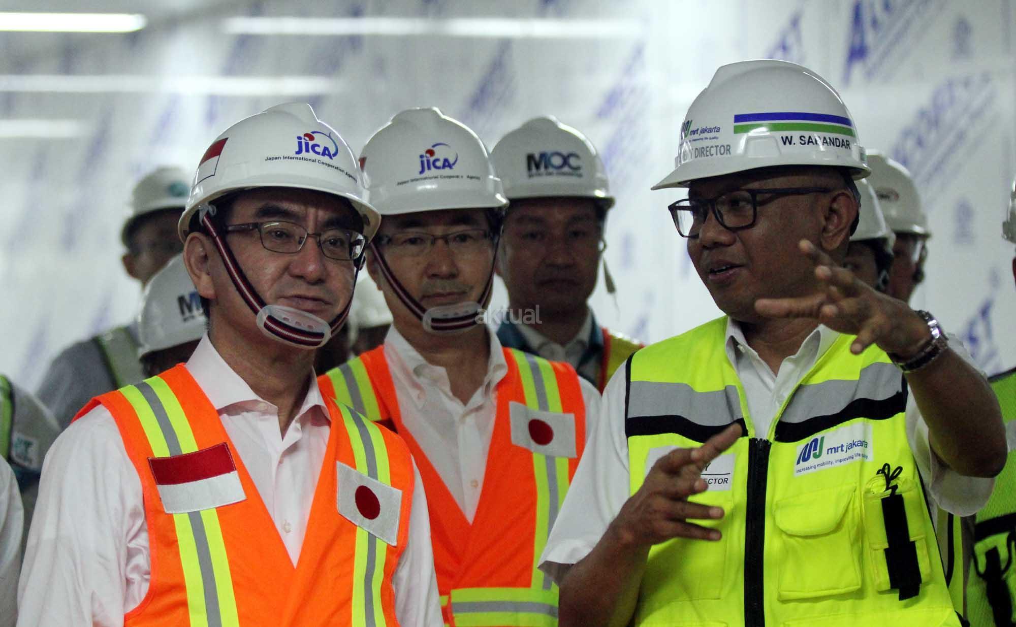 Menteri Luar Negeri Jepang Taro Kono (tengah) mendengarkan penjelasan Direktur Utama PT MRT Jakarta William P Sabandar (kedua kiri) saat melakukan kunjungan ke proyek Mass Rapid Transit (MRT) di Stasiun Bundaran HI, Jakarta, Senin (25/6). Kunjungan Menlu Jepang ke Indonesia tersebut bertepatan dengan peringatan 60 tahun hubungan diplomatik Indonesia-Jepang. AKTUAL/Tino Oktaviano