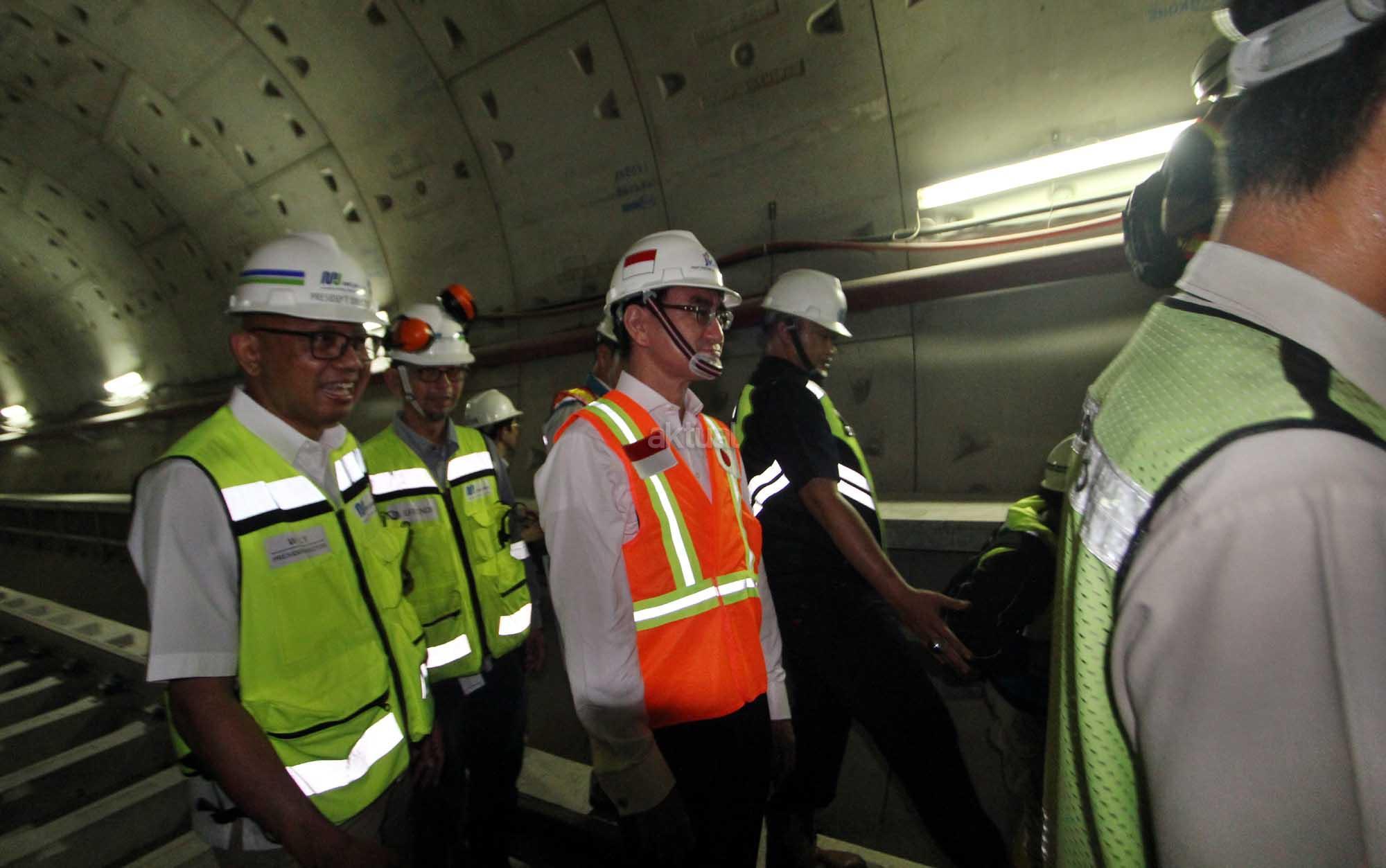 Menteri Luar Negeri Jepang Taro Kono (kiri) mendengarkan penjelasan Direktur Utama PT MRT Jakarta William P Sabandar (kanan) saat melakukan kunjungan ke proyek Mass Rapid Transit (MRT) di Stasiun Bundaran HI, Jakarta, Senin (25/6). Kunjungan Menlu Jepang ke Indonesia tersebut bertepatan dengan peringatan 60 tahun hubungan diplomatik Indonesia-Jepang. AKTUAL/Tino Oktaviano