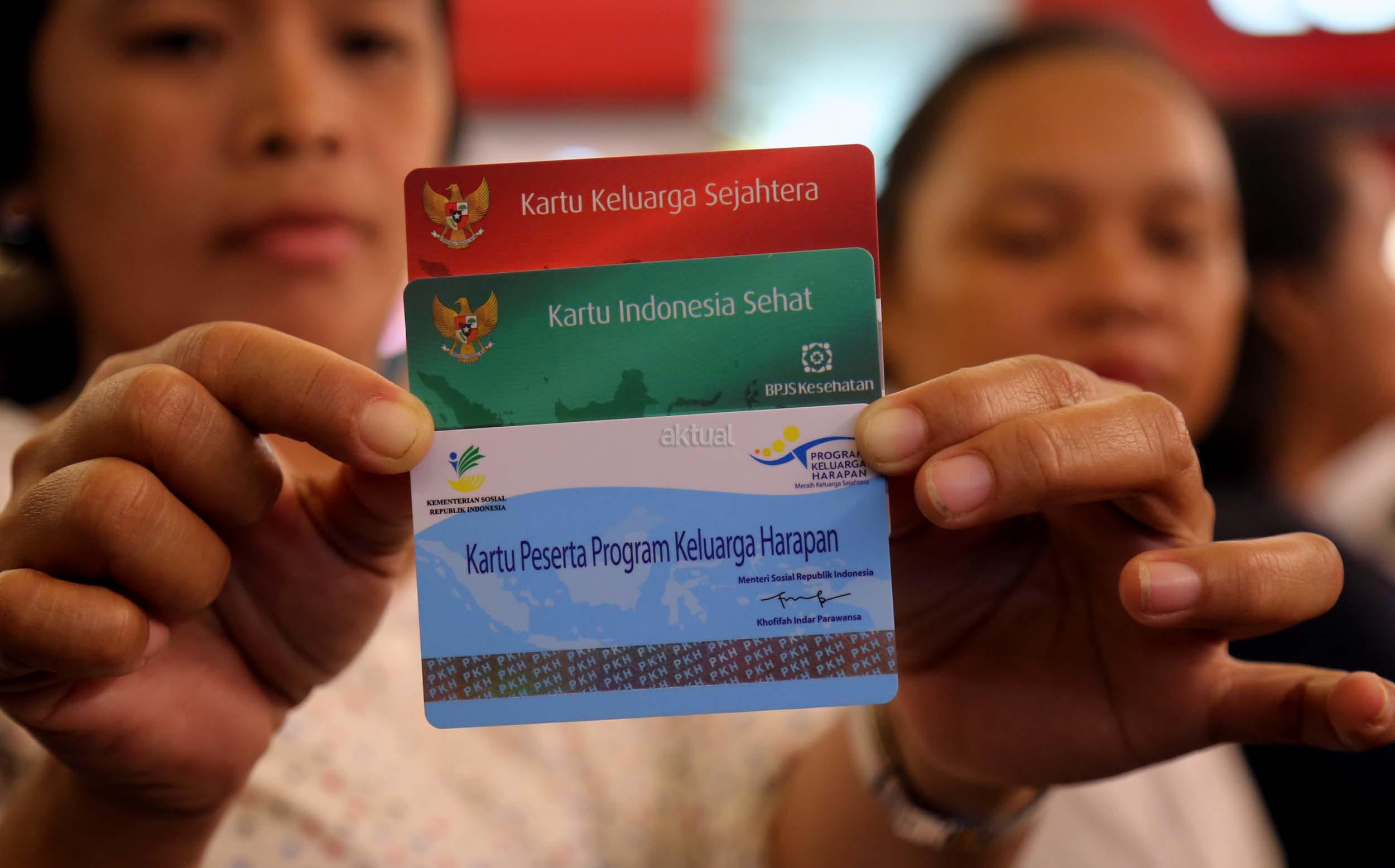 Seorang warga menunjukan tiga kartu ( Kartu Keluarga Sejahtera, Kartu Indonesia Sehat, Kartu Peserta Program Keluarga Harapan) pada saat pemberian bantuan sosial kepada Program Keluarga Harapan (PKH) di Jakarta, Rabu (27/4/2016). Sebanyak 187 Kepala Keluarga yang berada di kelurahan Kwitang menerima pencairan dana PKH.