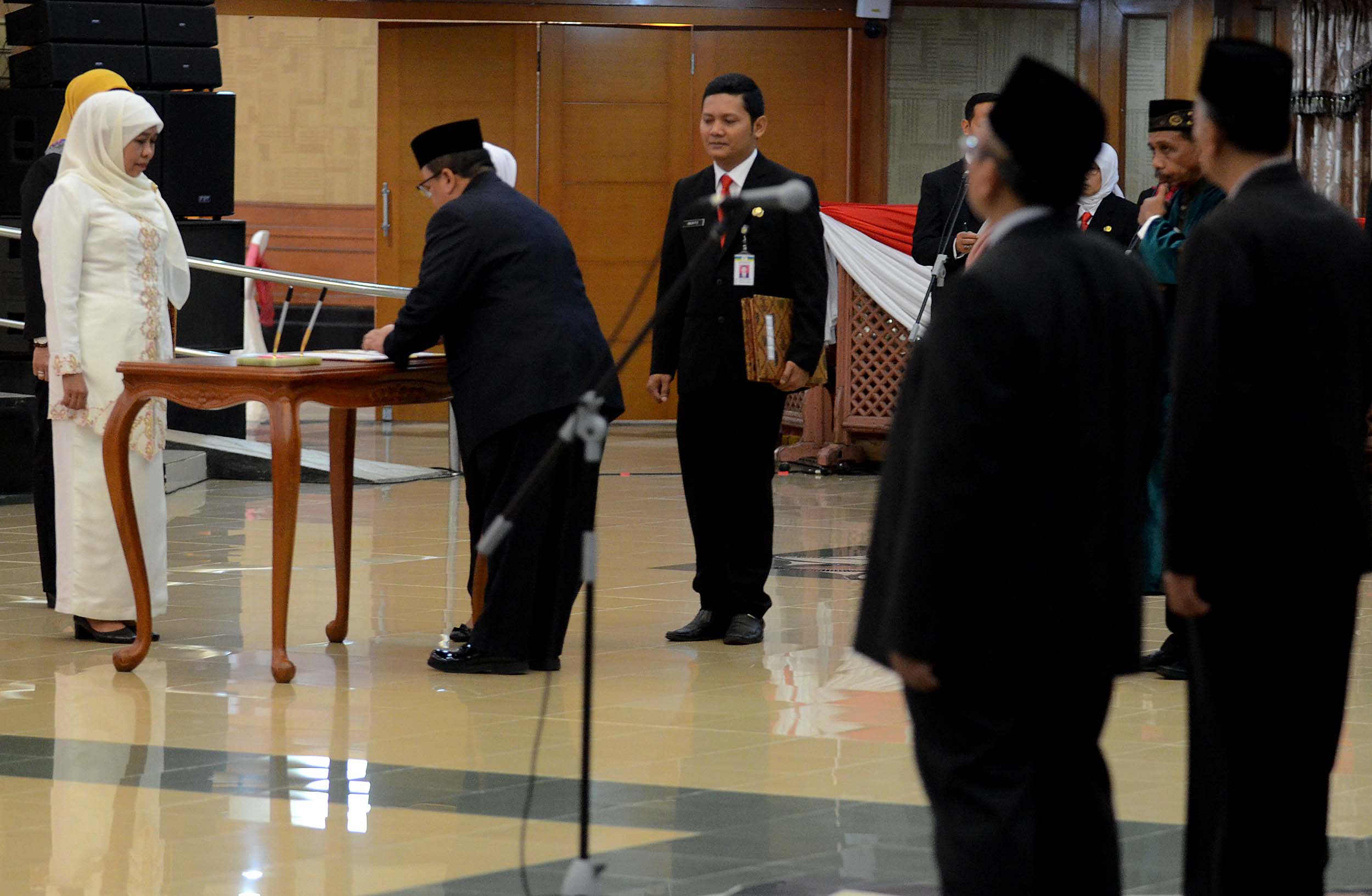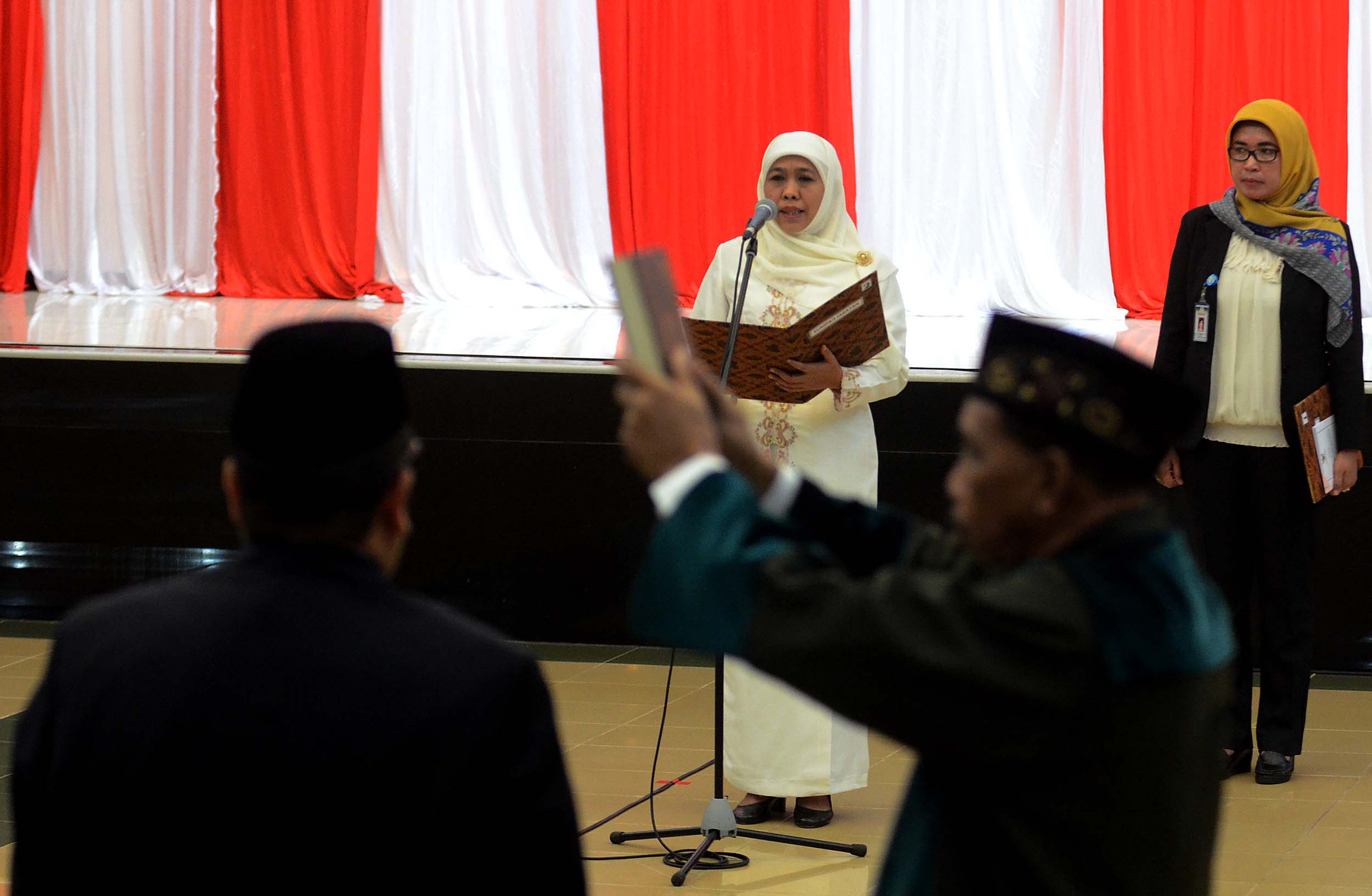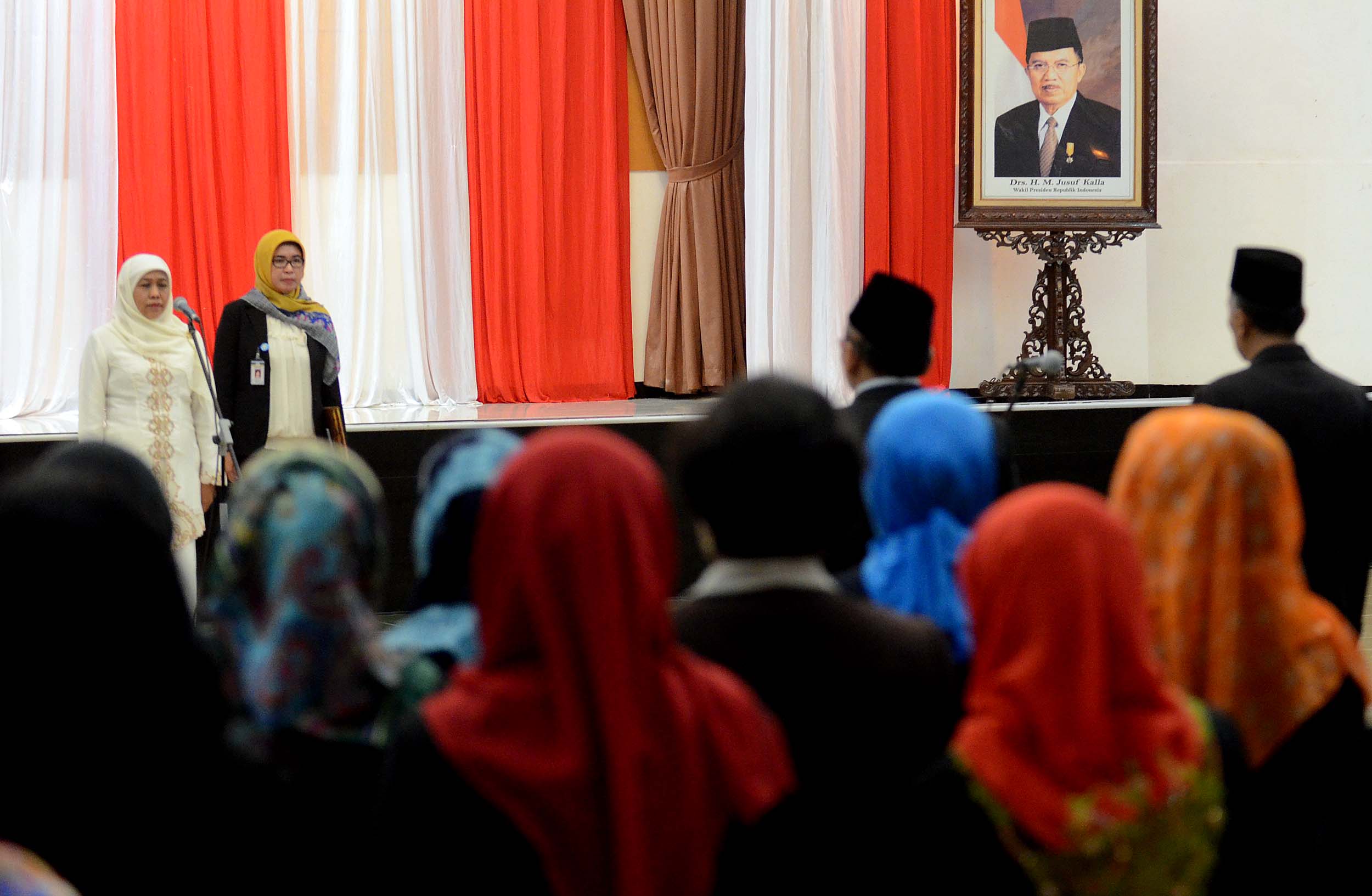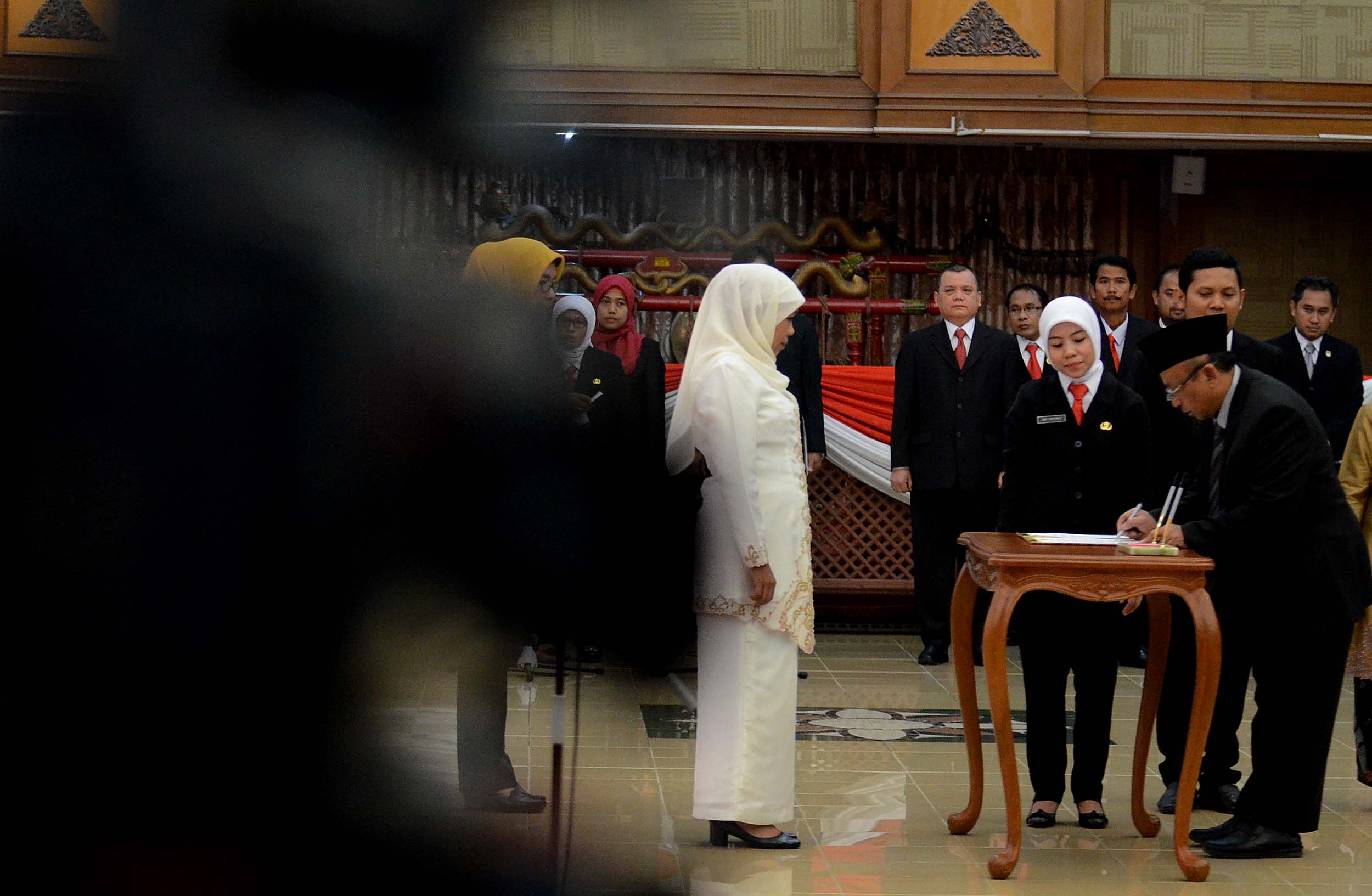 Menteri Sosial Khofifah Indar Parawansa melantik tiga Pejabat Tinggi Madya Kemensos di Gedung Aneka Bhakti, Kemensos, Jakarta, Rabu (3/8/2016). Ketiga pejabat tinggi madya yang dilantik adalah Harry Soeratin sebagai Sekretaris Jenderal, Marjuki sebagai Dirjen Rehabilitasi Sosial dan Edi Suharto sebagai Kepala Badan Pendidikan, Penelitian dan Penyuluhan Sosial.