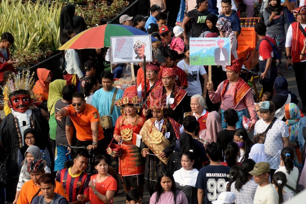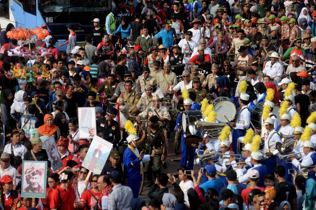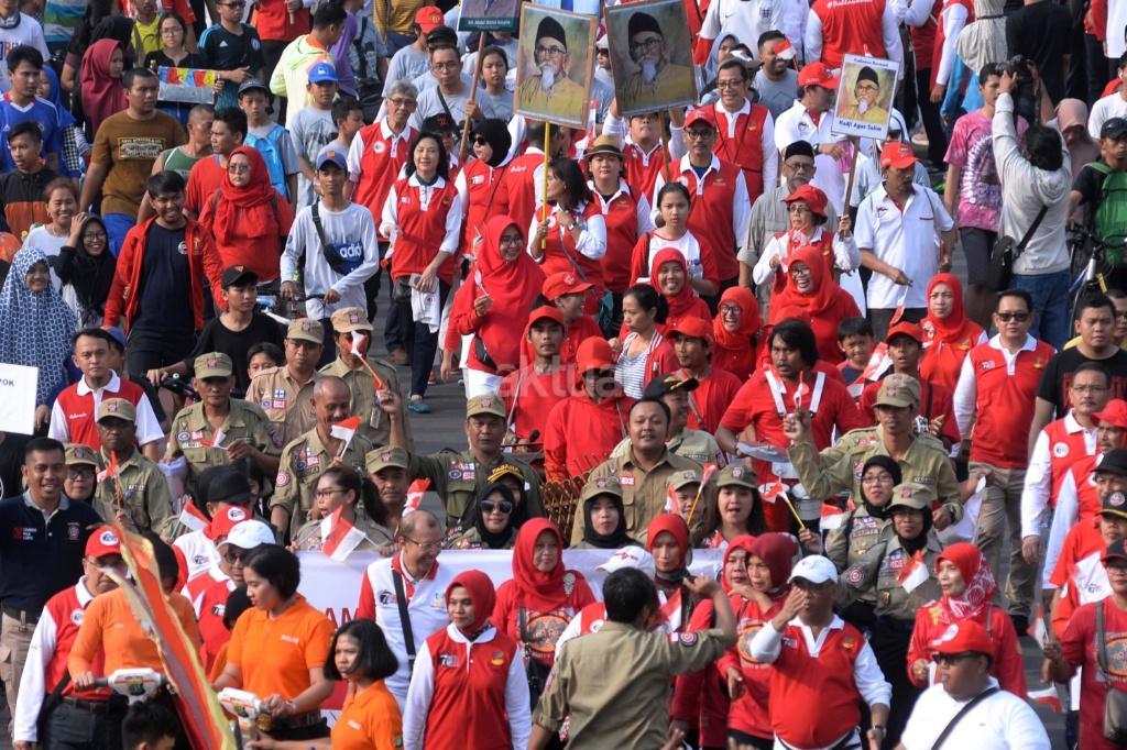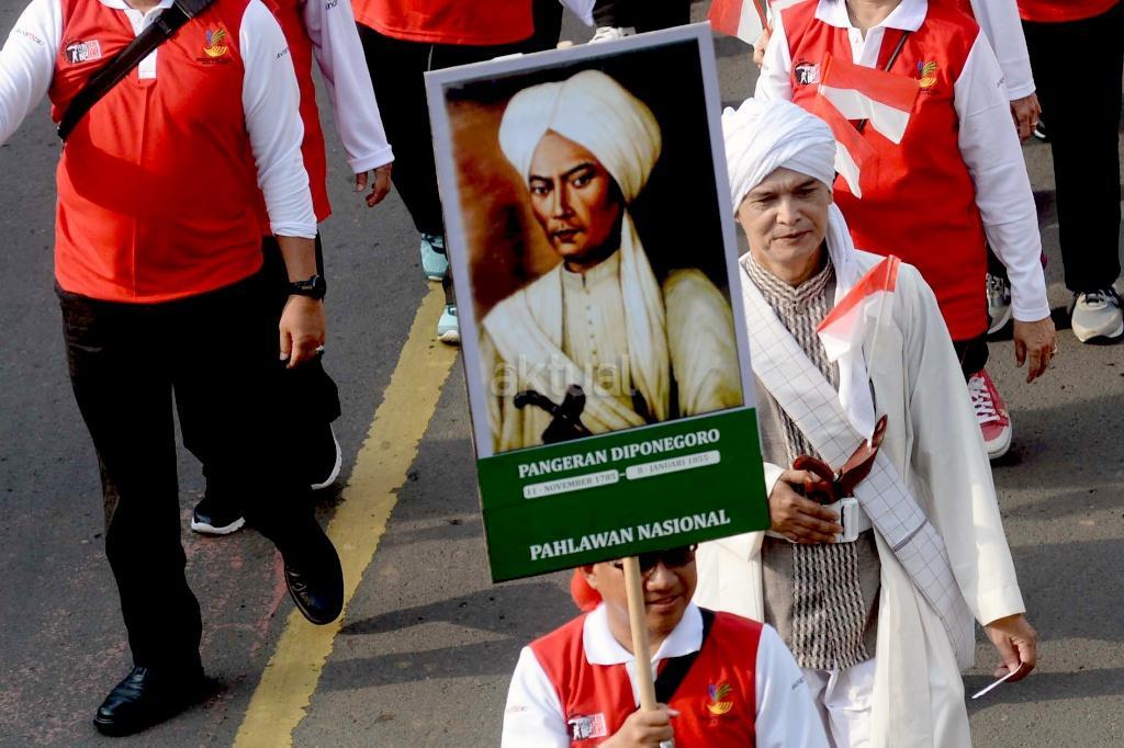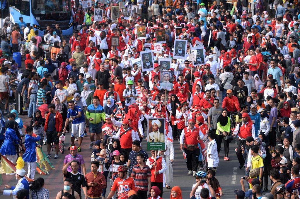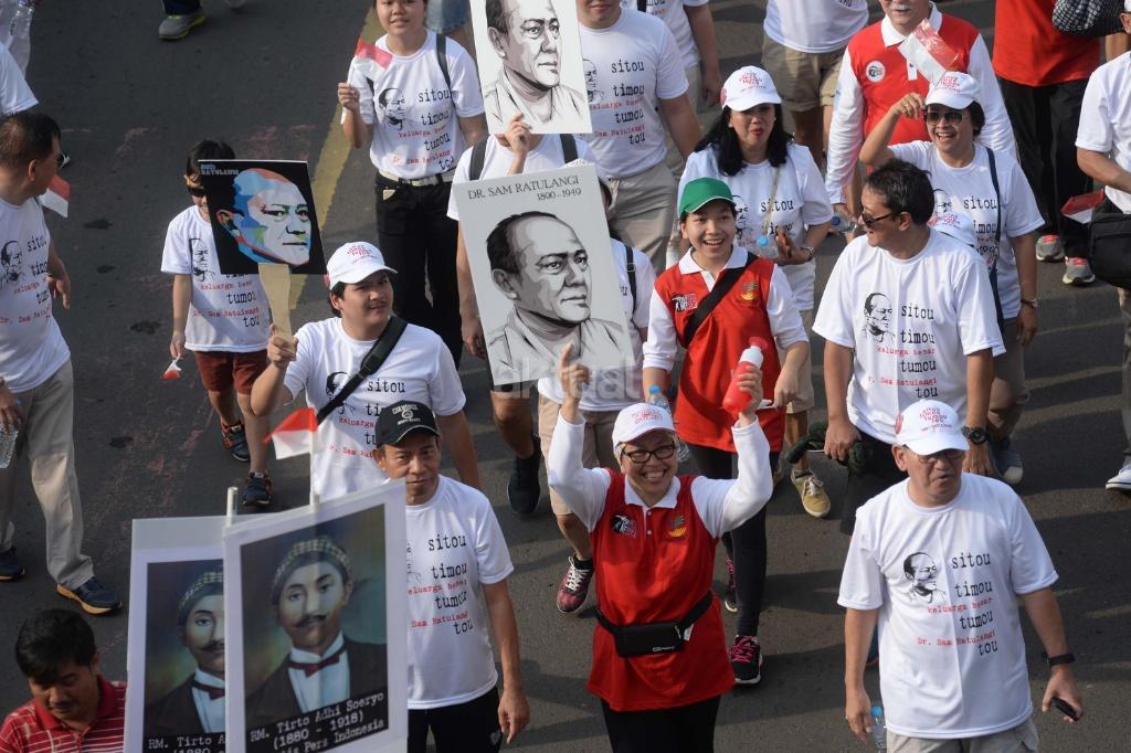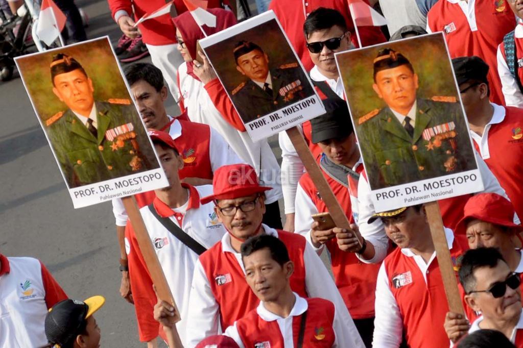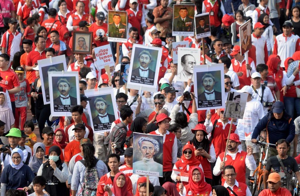 Ribuan peserta gerak jalan kebangsaan membawa poster-poster pahlawan dikawasan CFD, Jakarta, Minggu (5/11/2017). Pergelaran gerak jalan kebangsaan dalam mennyambut jelang peringatan hari pahlawan yang jatuh pada tanggal 10 November. AKTUAL/Munzir