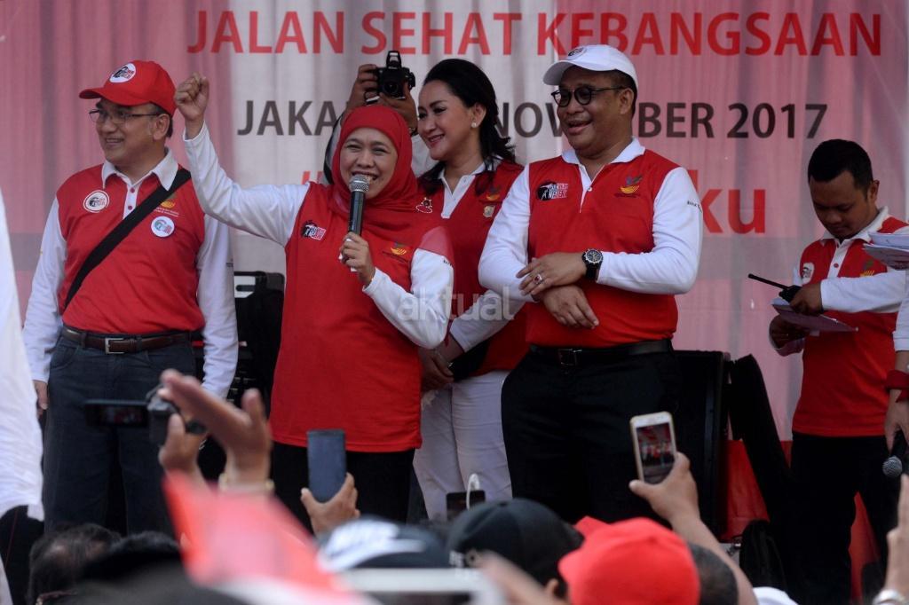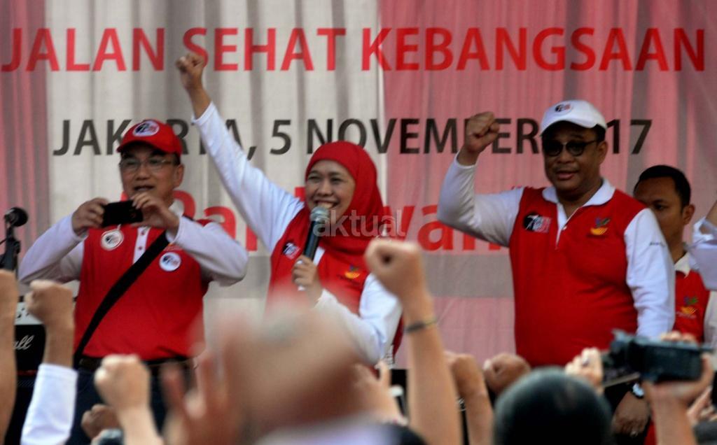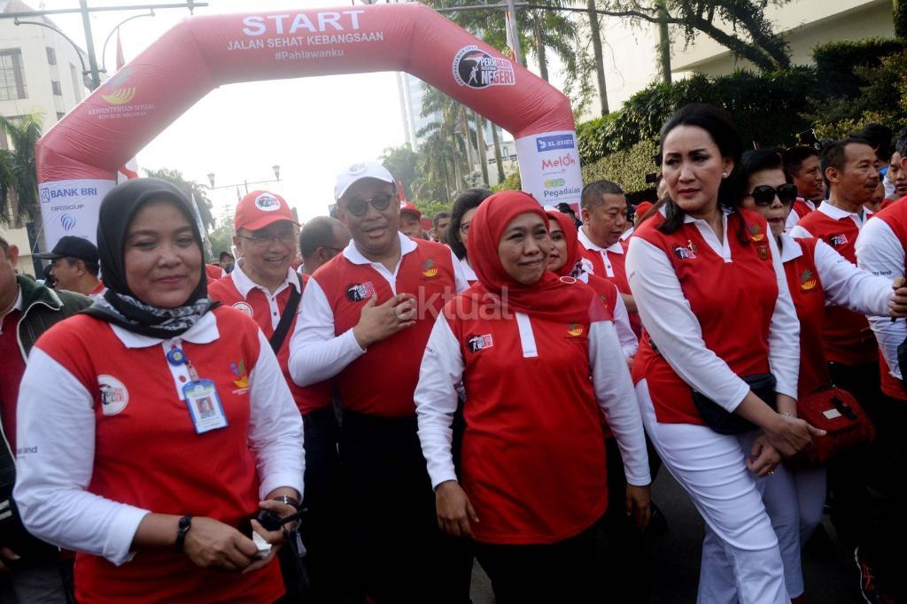 Menteri Sosial Khofifah Indar Parawansa mengikuti acara gerak jalan kebangsaan di kawasan CFD, Jakarta, Minggu (5/11/2017). Pergelaran gerak jalan kebangsaan dalam mennyambut jelang peringatan hari pahlawan yang jatuh pada tanggal 10 November. AKTUAL/Munzir