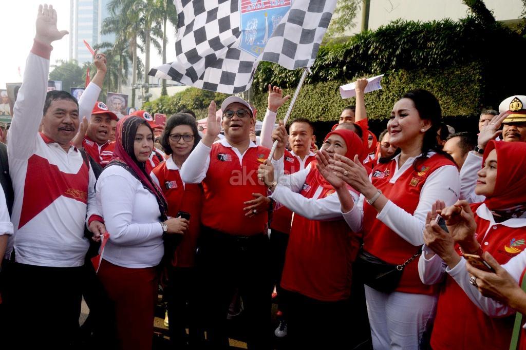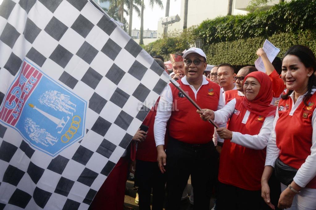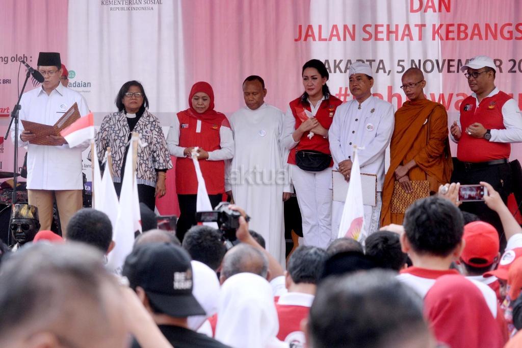 Menteri Sosial Khofifah Indar Parawansa melepas peserta gerak jalan kebangsaan di kawasan CFD, Jakarta, Minggu (5/11/2017). Pergelaran gerak jalan kebangsaan dalam mennyambut jelang peringatan hari pahlawan yang jatuh pada tanggal 10 November. AKTUAL/Munzir