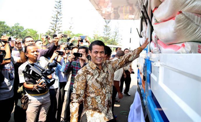 Menteri Pertanian (Mentan) Amran Sulaiman dan Kepala Badan Urusan Logistik (Bulog) Djarot Kusumayakti melepas pasar murah beras premium dan daging sapi di Gudang Bulog, Jakarta, Selasa (22/9/2015). Bulog melepas 30 truk yang terdiri dari 21 truk beras sejumlah 140 ton yang kami sebar ke pasar-pasar tradisional DKI, dan pasar induk Cipinang