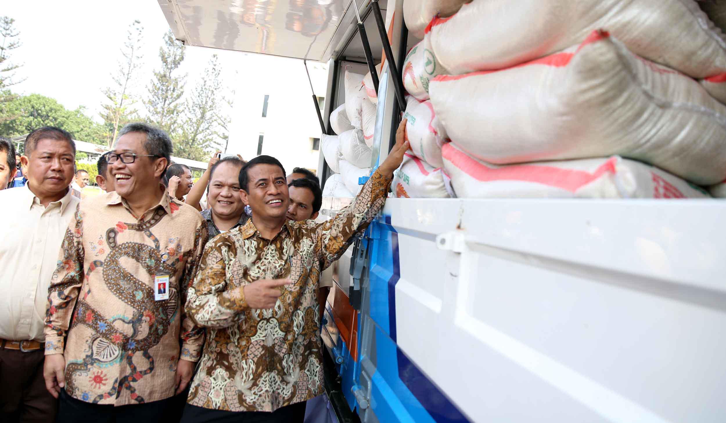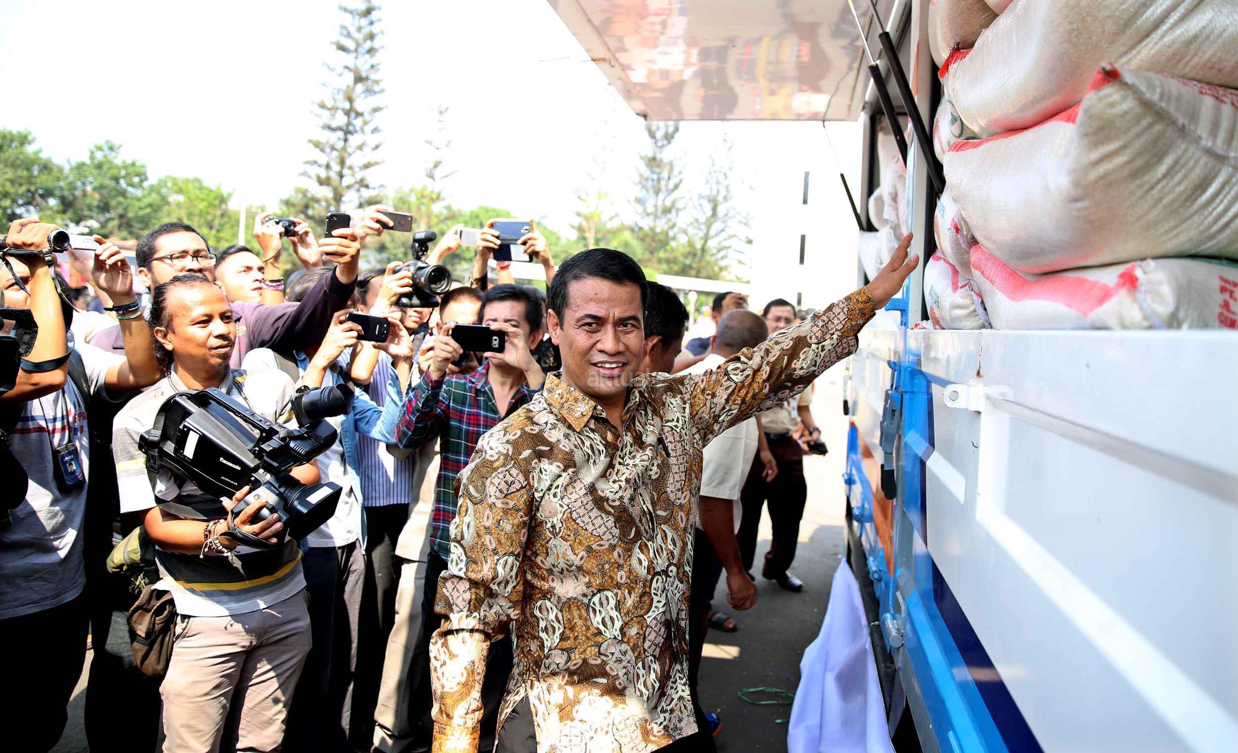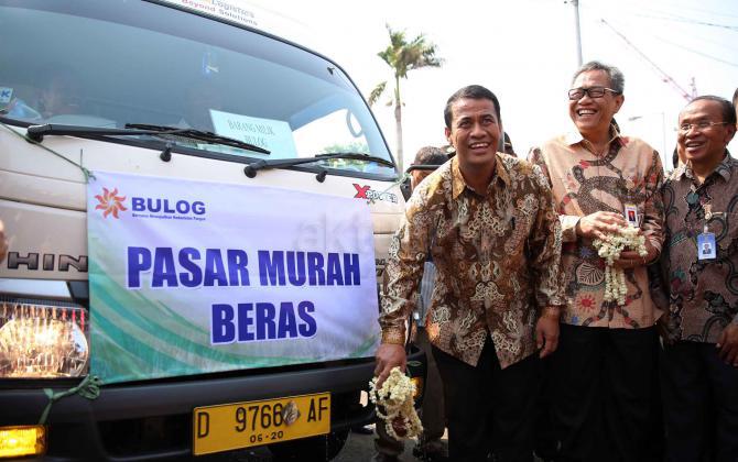 Menteri Pertanian (Mentan) Sulaiman dan Kepala Badan Urusan Logistik (Bulog) Djarot Kusumayakti melepas pasar murah beras premium dan daging sapi di Gudang Bulog, Jakarta, Selasa (22/9/2015). Bulog melepas 30 truk yang terdiri dari 21 truk beras sejumlah 140 ton yang kami sebar ke pasar-pasar tradisional DKI, dan pasar induk Cipinang.