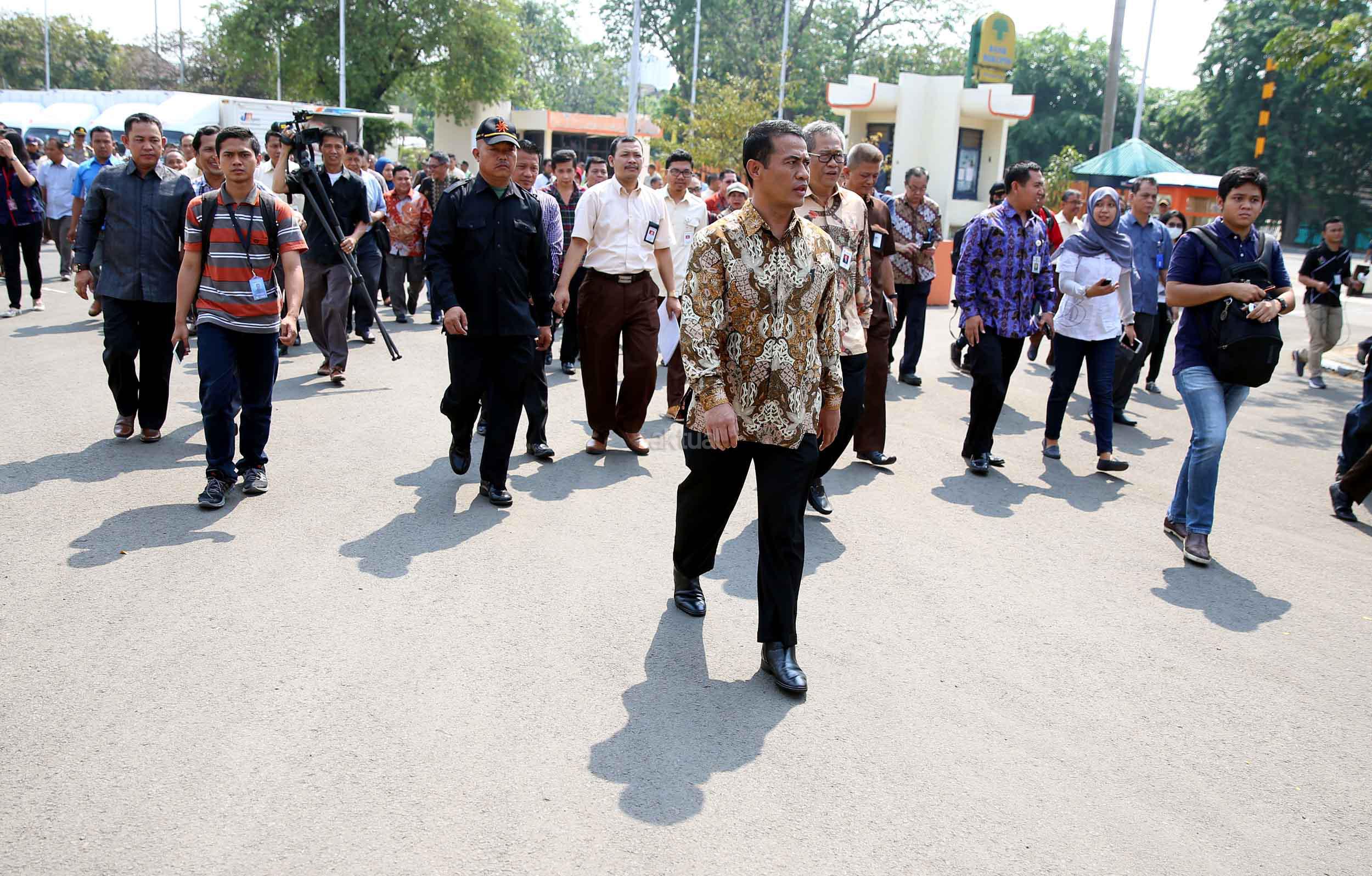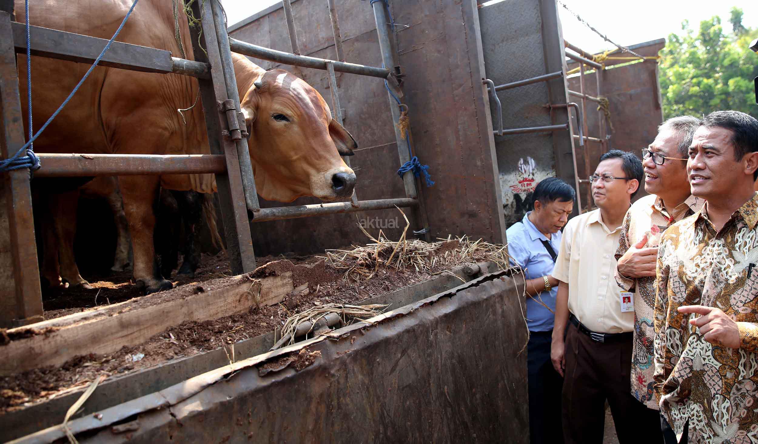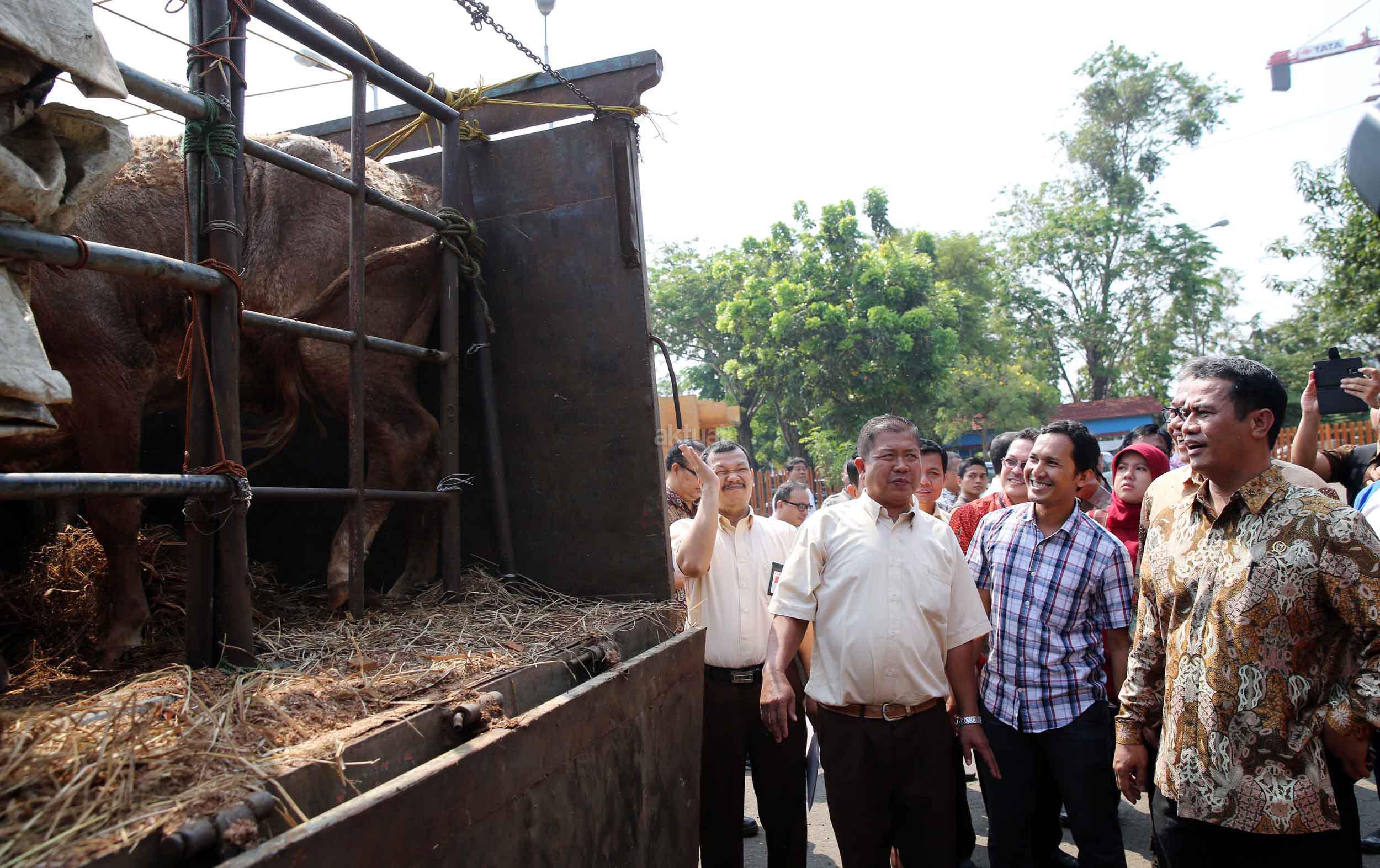 Menteri Pertanian (Mentan) Sulaiman dan Kepala Badan Urusan Logistik (Bulog) Djarot Kusumayakti melepas pasar murah beras premium dan daging sapi di Gudang Bulog, Jakarta, Selasa (22/9/2015). Bulog melepas 30 truk yang terdiri dari 21 truk beras sejumlah 140 ton yang kami sebar ke pasar-pasar tradisional DKI, dan pasar induk Cipinang.