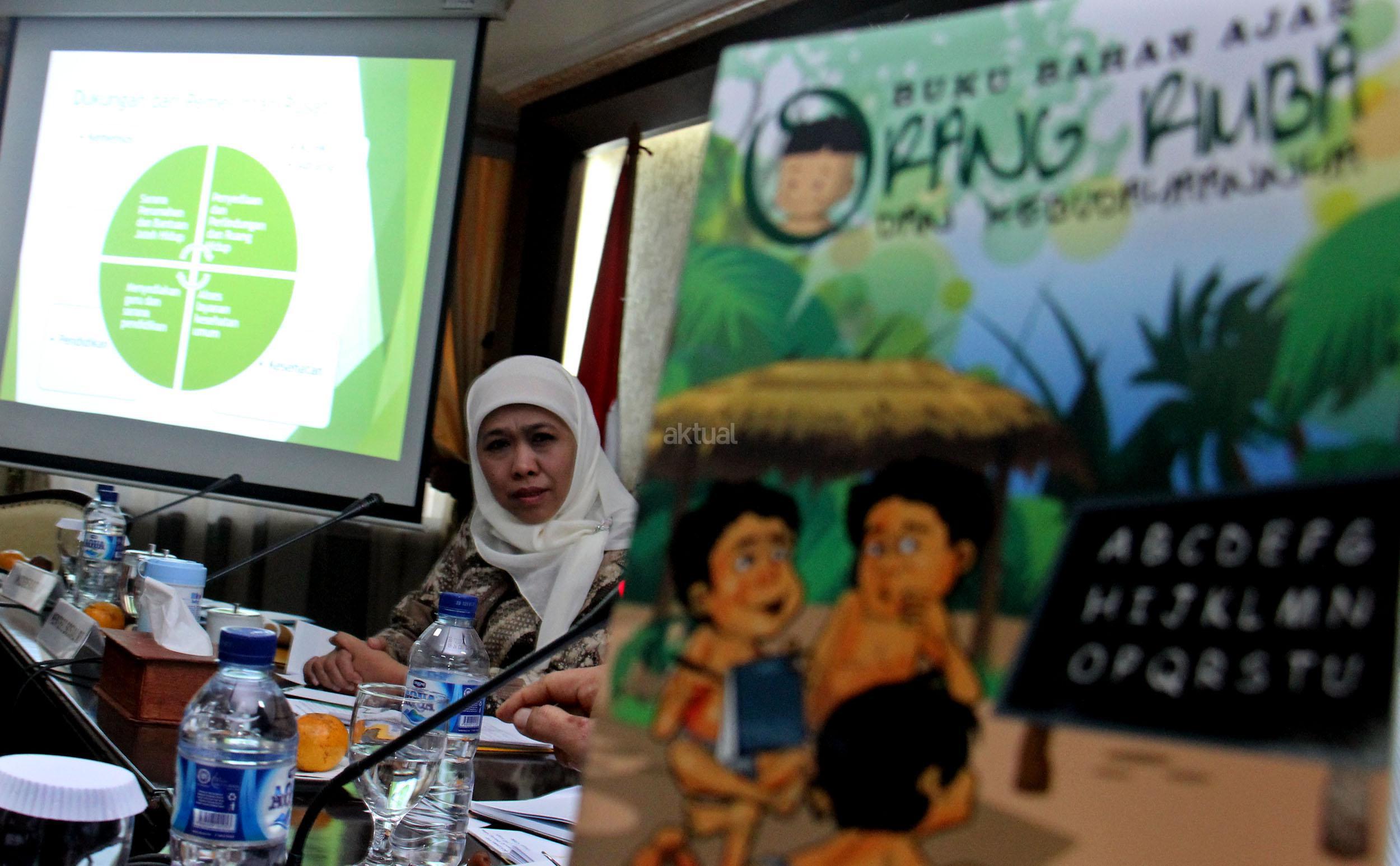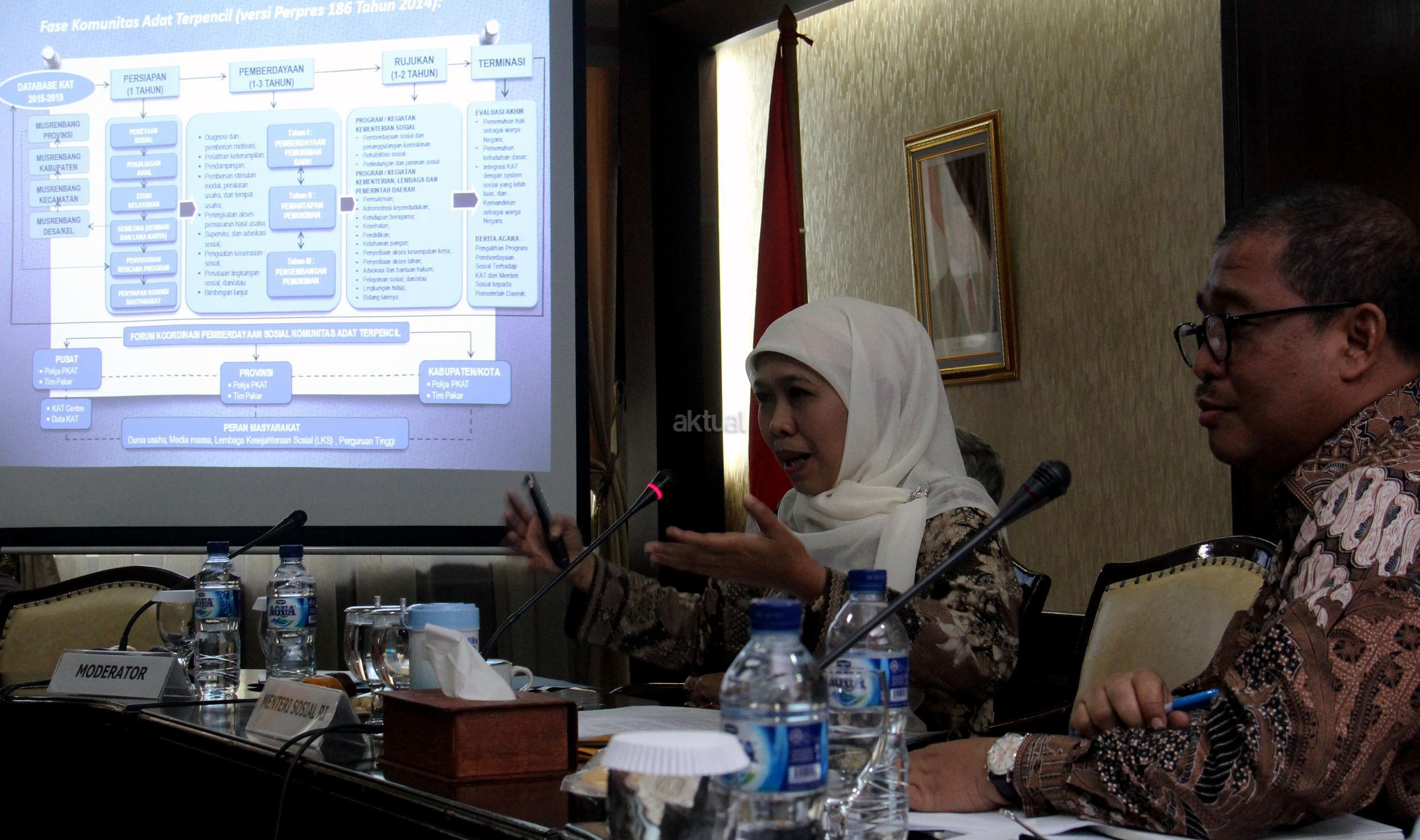 Menteri Sosial Khofifah Indar Parawansa (tengah ) saat memimpin rapat Forum Komunitas Adat Terpencil (KAT) di Kemensos, Jakarta, Rabu (4/11/2015). Dalam rapat Forum Koordinasi Komunitas Adat Terpencil (KAT) membahas Penjelasan Perpres No 186/2014 ttg Pemberdayaan KAT dan Pola Pemberdayaan Suku Anak Dalam, Studi Kasus terhadap Orang Rimba oleh KKI-Warsi Jambi.