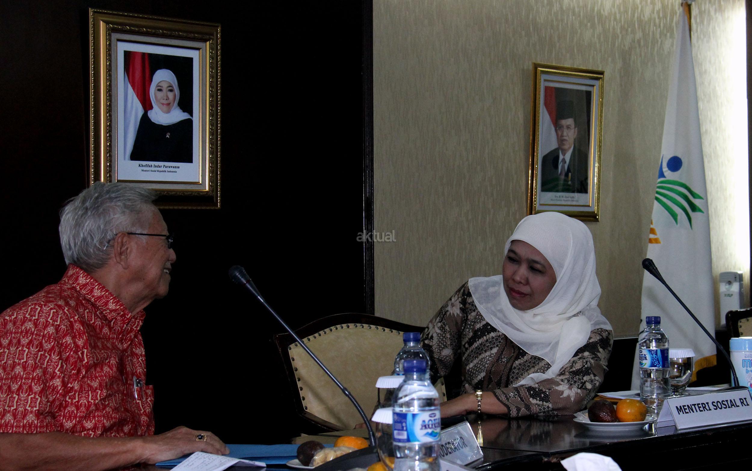 Menteri Sosial Khofifah Indar Parawansa saat berbincang dengan Peneliti UI DR. S. Budi Santoso dalam membahas Komunitas Adat Terpencil (KAT) di Kemensos, Jakarta, Rabu (4/11/2015). Dalam rapat Forum Koordinasi Komunitas Adat Terpencil (KAT) membahas Penjelasan Perpres No 186/2014 ttg Pemberdayaan KAT dan Pola Pemberdayaan Suku Anak Dalam, Studi Kasus terhadap Orang Rimba oleh KKI-Warsi Jambi.