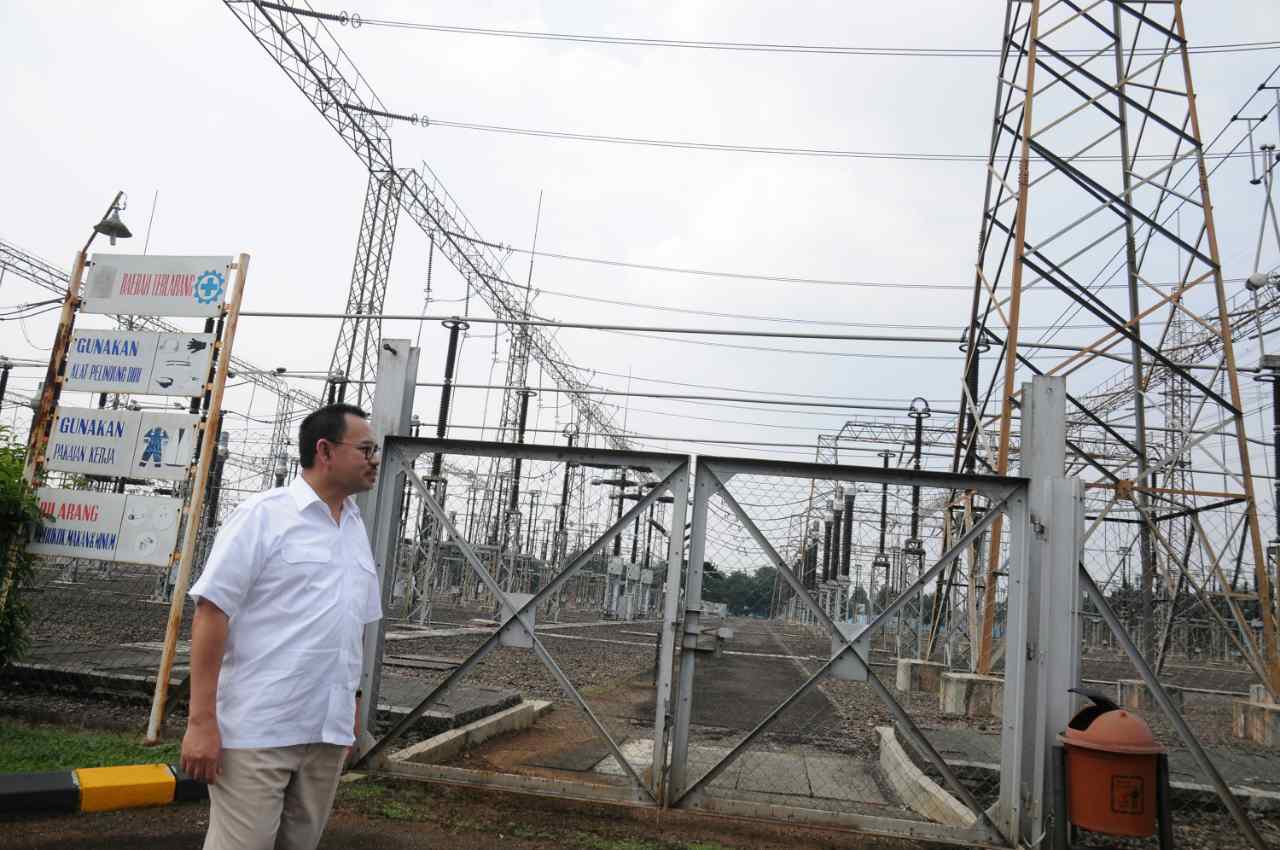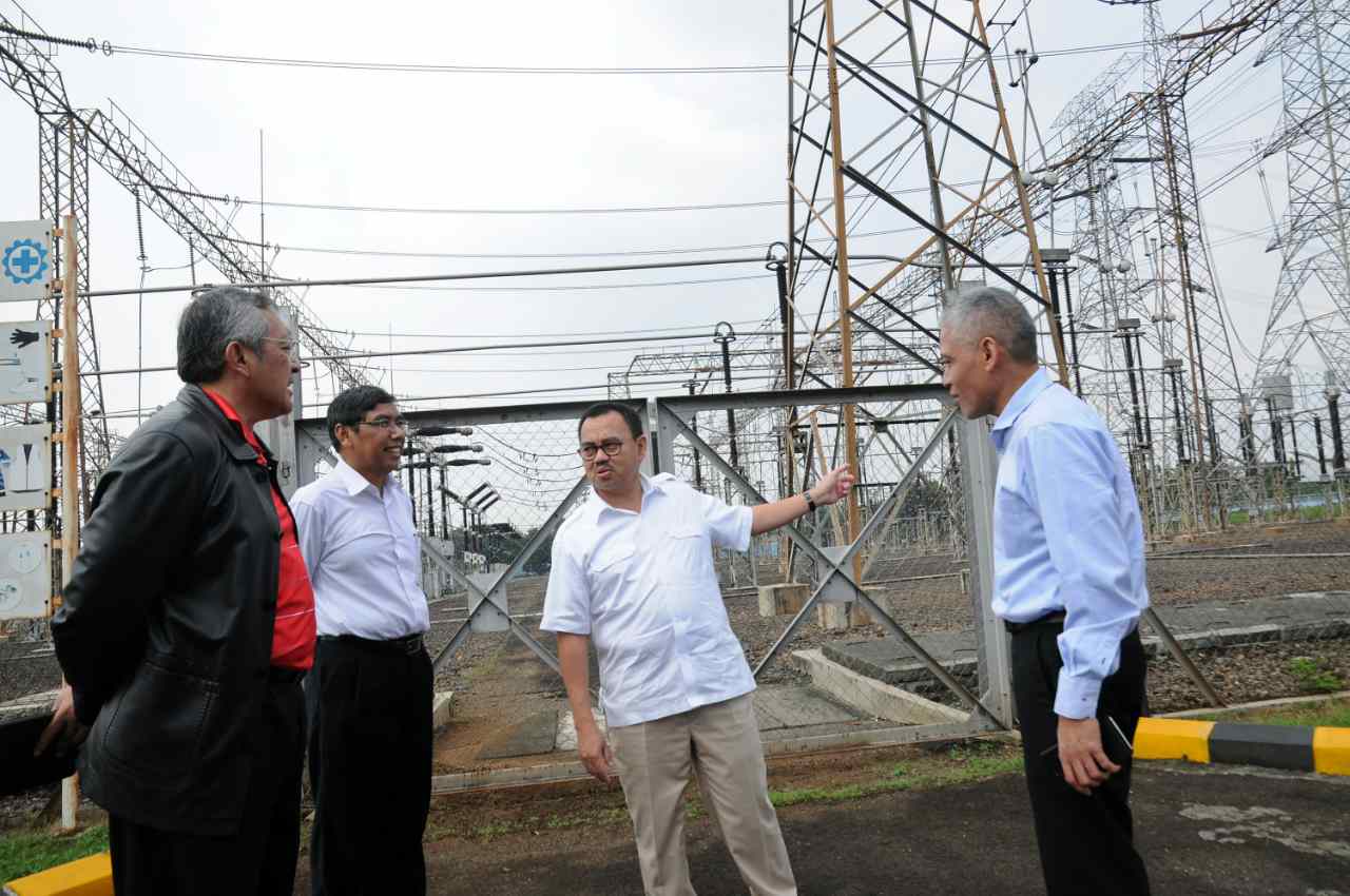 Menteri Energi dan Sumber Daya Mineral (ESDM) Sudirman Said (kedua kanan) didampingi jajaran meninjau Gardu Induk PLN Gandul, di Depok, Jawa Barat, Minggu (3/7). Menteri ESDM meninjau dua Gardu Induk PLN di Gandul, Depok dan Cawang, Jakarta Timur guna memastikan ketersediaan pasokan listrik jelang Idulfitri dan meminta kepada petugas untuk memantau kelancaran aliran listrik secara terus menerus selama 24 jam. ANTARA FOTO/Indrianto Eko Suwarso/ama/16