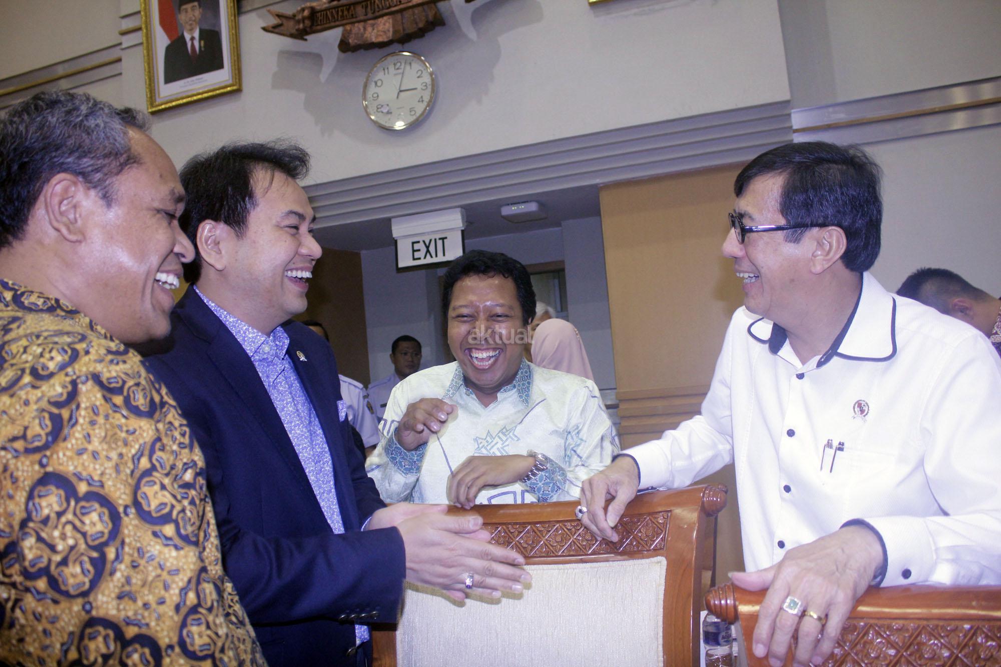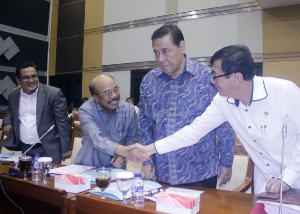 Menteri Hukum dan HAM, Yasonna Laoly (Kanan) bersama Pakar Hukum Pidana, Muladi (kanan) dan Jaksa Agung Muda Pidana Umum (Jampidum), Basyuni Masyarif (kiri) menghadiri Rapat Kerja (Raker) dengan Komisi III DPR di Kompleks Parlemen, Senayan, Jakarta, Senin (26/10/2015). Raker membahas mengenai Rancangan Undang-Undang (RUU) Kitab Undang-Undang Hukum Pidana (KUHP) serta Penyerahan Daftar Inventarisasi Masalah (DIM) dari masing-masing Fraksi di Komisi III kepada Pemerintah.