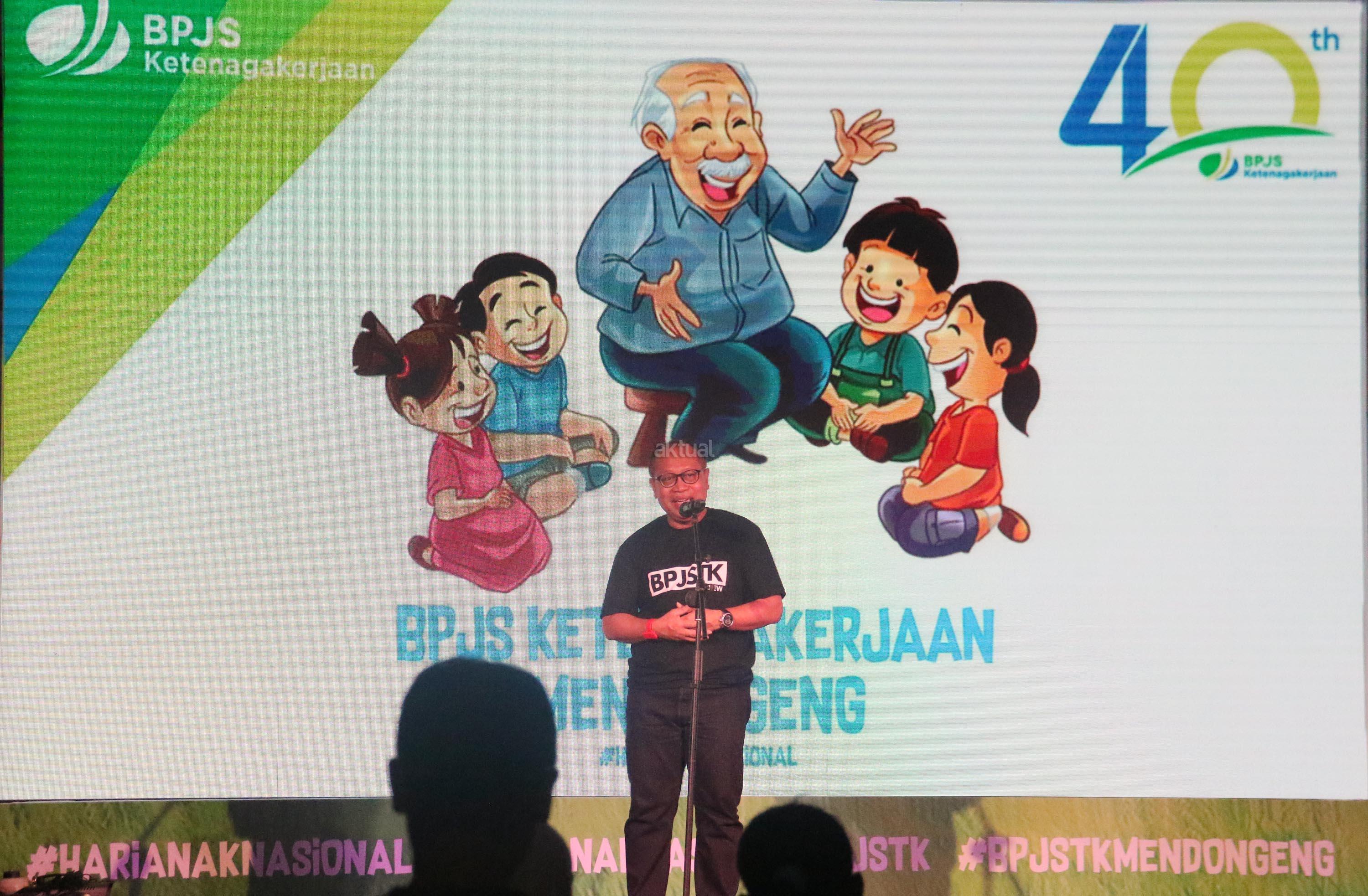 Direktur Utama BPJS Ketenaga kerjaan, Agus Susanto, berbicara dihadapan ratusan anak saat merayakan hari anak nasional di area bermain KidZania, Jakarta, Minggu (23/7/2017). Kegiatan tersebut digelar oleh BPJS Ketenagakerjaan dalam rangka memperingati Hari Anak Nasional dan sekaligus meluncurkan buku perlengkapan kurikulum untuk siswa SD, dan SMP yang berisi tentang dasar-dasar jaminan sosial. AKTUAL/Munzir