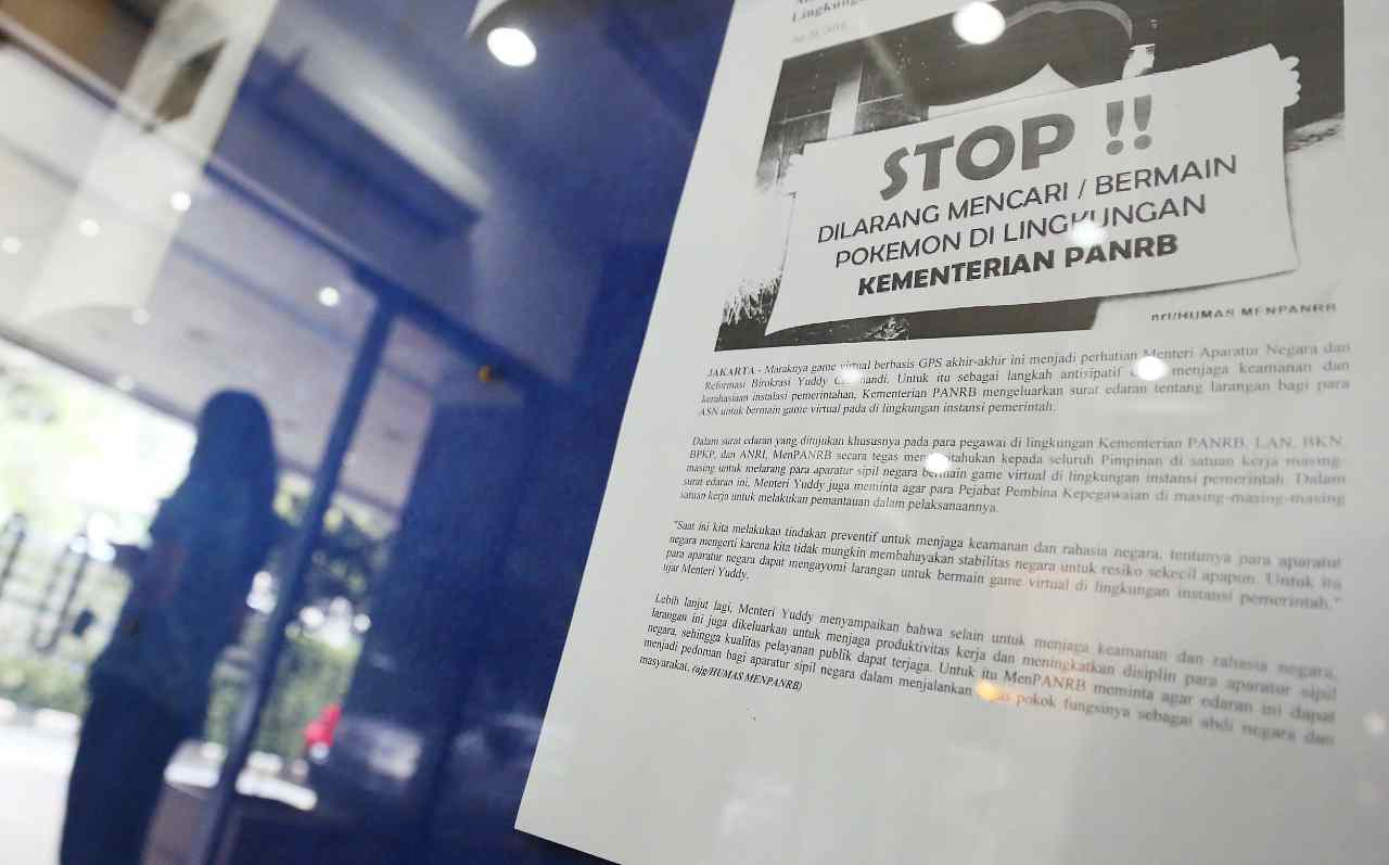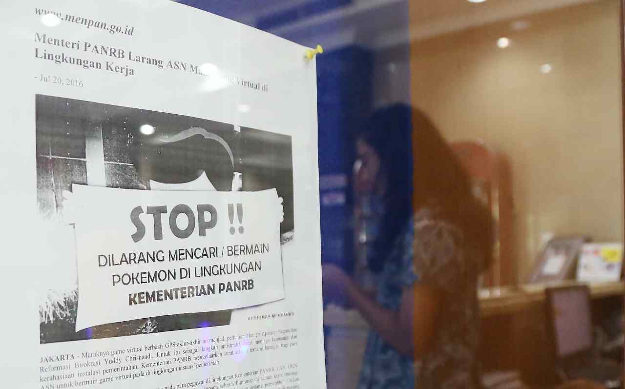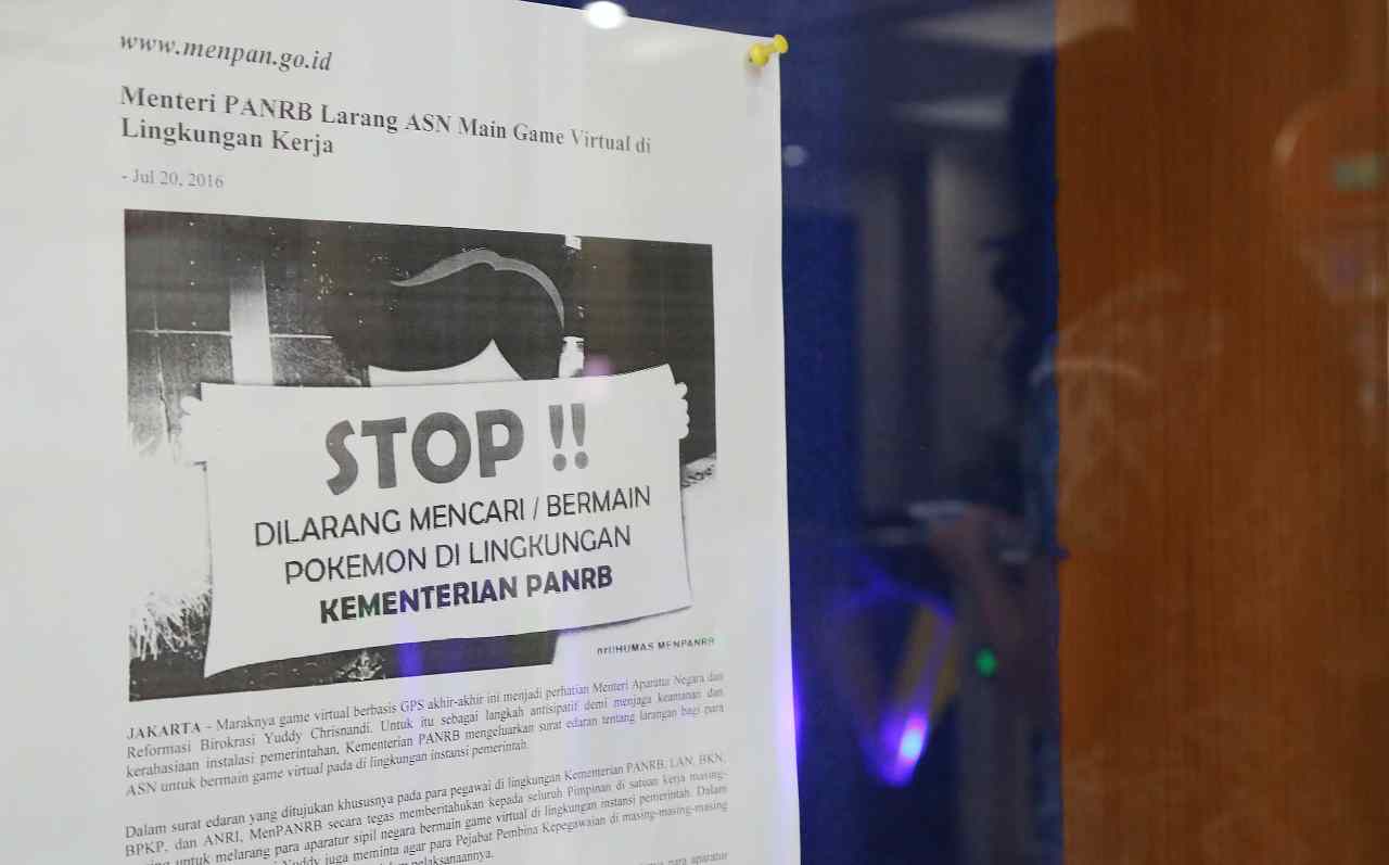 Selebaran berisi larangan bermain Pokemon terpampang di papan pengumuman yang berada di lobi Gedung Kementerian Pendayagunaan Aparatur Negara dan Reformasi Birokrasi (MenPANRB) di Jakarta, Jumat (22/7/2016). MenPANRB mengeluarkan surat edaran soal larangan bermain game virtual berbasis GPS di lingkungan kantor pemerintah. Saat ini game virtual berbasis GPS seperti Pokemon Go tengah booming, namun permainan berbasis GPS seperti ini dikhawatirkan pemerintah bisa mengancam keamanan.