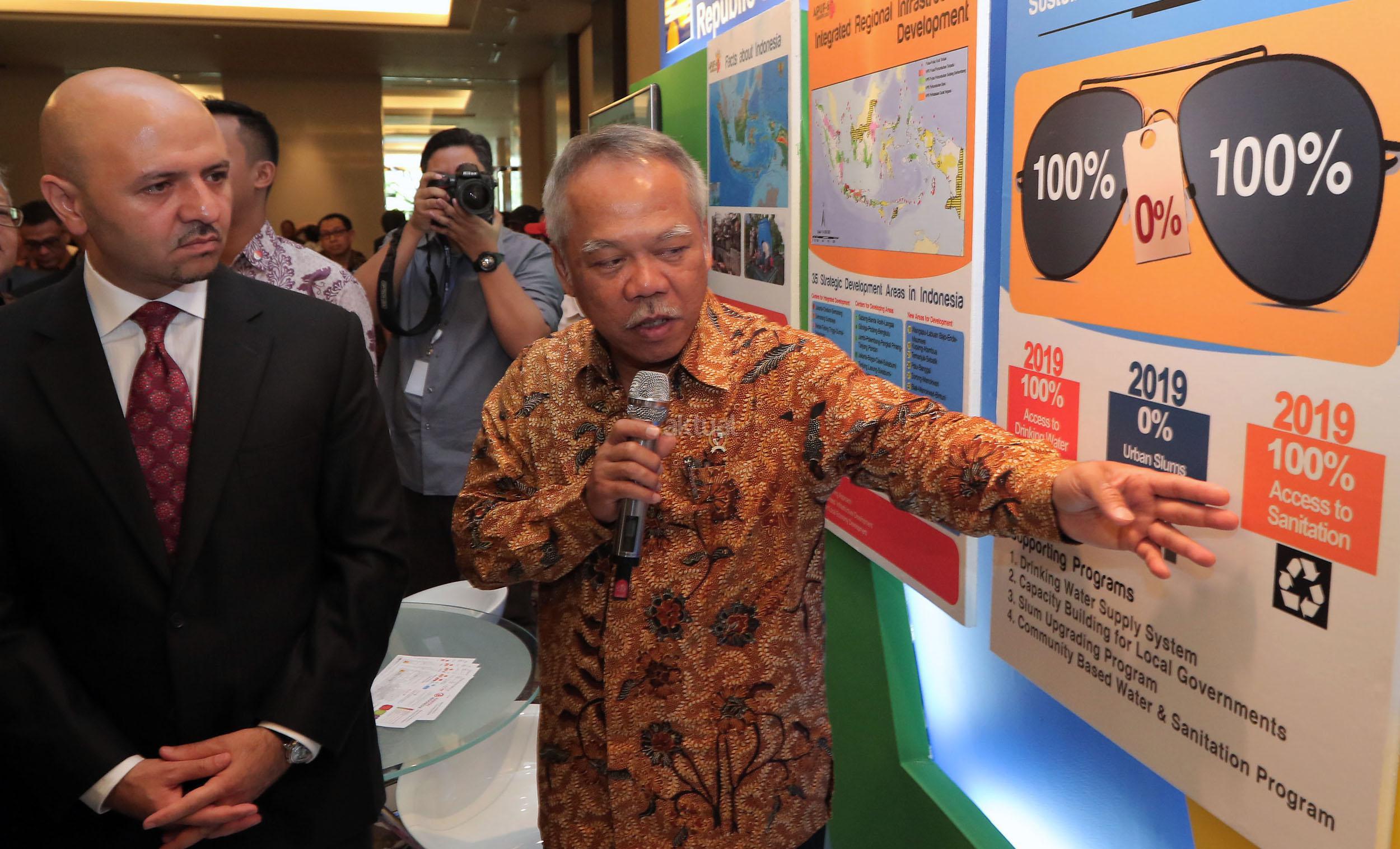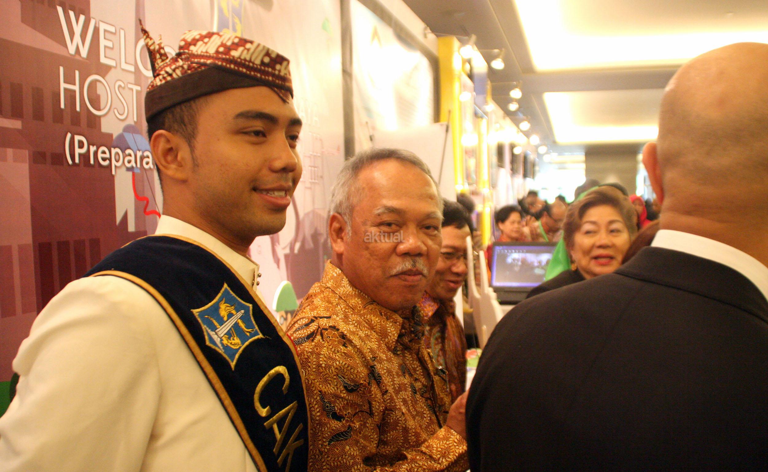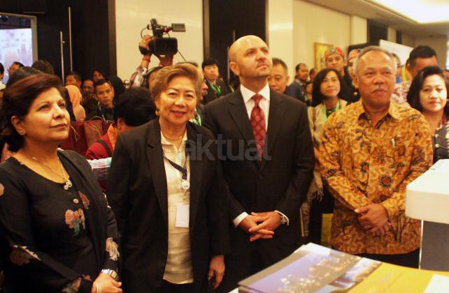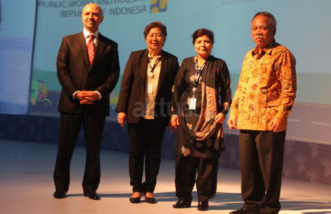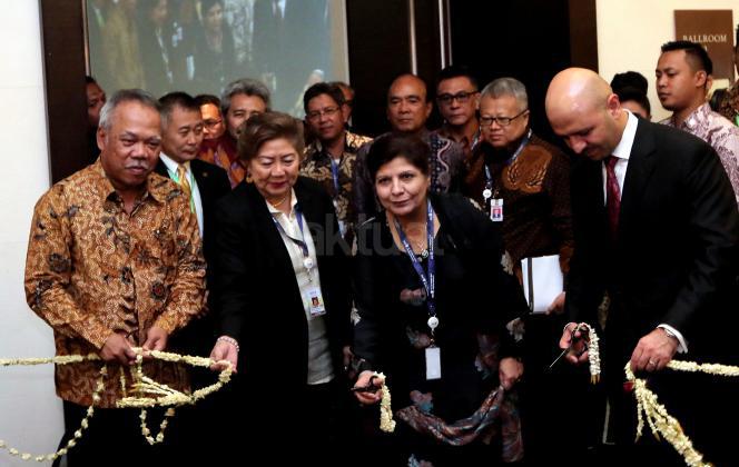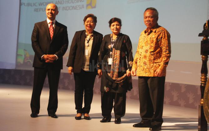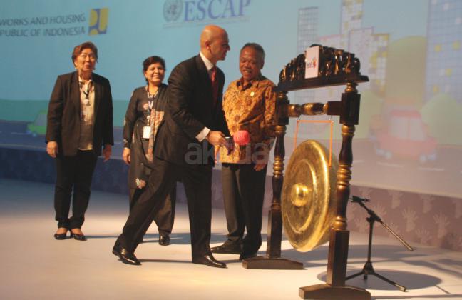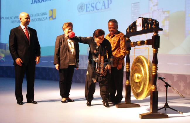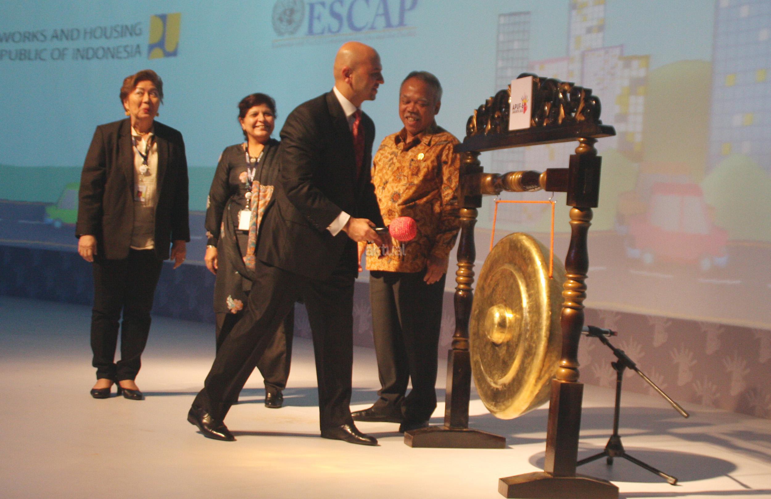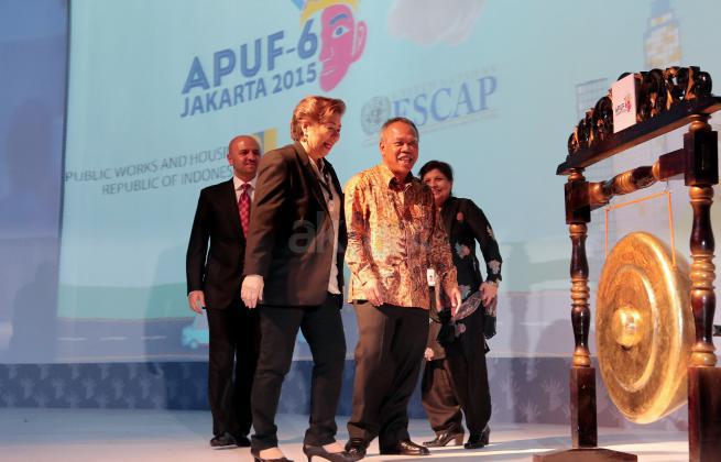 Menteri Pekerjaan Umum dan Perumahan Rakyat Basuki Hadimuldjono (kanan) didampingi Sekretaris Eksekutif Komisi Ekonomi dan Sosial untuk Asia dan Pasifik Shamsad Akhtar (kedua kanan), Ketua Forum Urban Asia Pasifik ke Enam Mary Jane Ortega (ketiga kanan), Menteri Pengembangan Perkotaan Afghanistan Sayed Sadat Mansor Naderi (kiri) memukul gong sebagai tanda dibukanya Asia Pasifik Urban Forum (APUF) ke-6 di Jakarta, Senin (19/10/2015). APUF-6 yang mengusung tema "Pembangunan Kota yang Berkelanjutan di Kawasan Asia-Pasifik: Menuju Agenda Baru Perkotaan" ini bertujuan mendorong komitmen global terkait urbanisasi yang berkelanjutan yang fokuskan pada pelaksanaan Agenda Baru Perkotaan.
