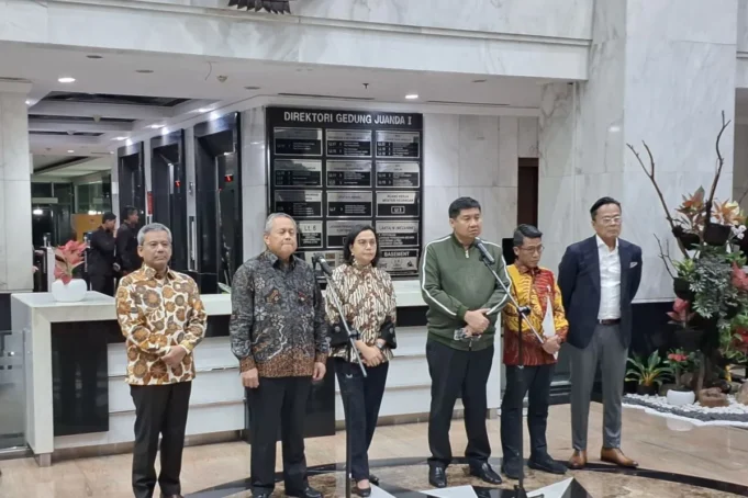 Menteri Perumahan dan Kawasan Permukiman (PKP) Maruarar Sirait (Ara) bersama Menteri Keuangan Sri Mulyani, Gubernur Bank Indonesia (BI) Perry Warjiyo, Wakil Menteri Keuangan Suahazil Nazara dan Ketua Komisi XI DPR RI Misbakhun dalam Konferensi Pers di Gedung Kementerian Keuangan, Jakarta, Kamis (20/02/2025). (ANTARA/Muhammad Heriyanto)