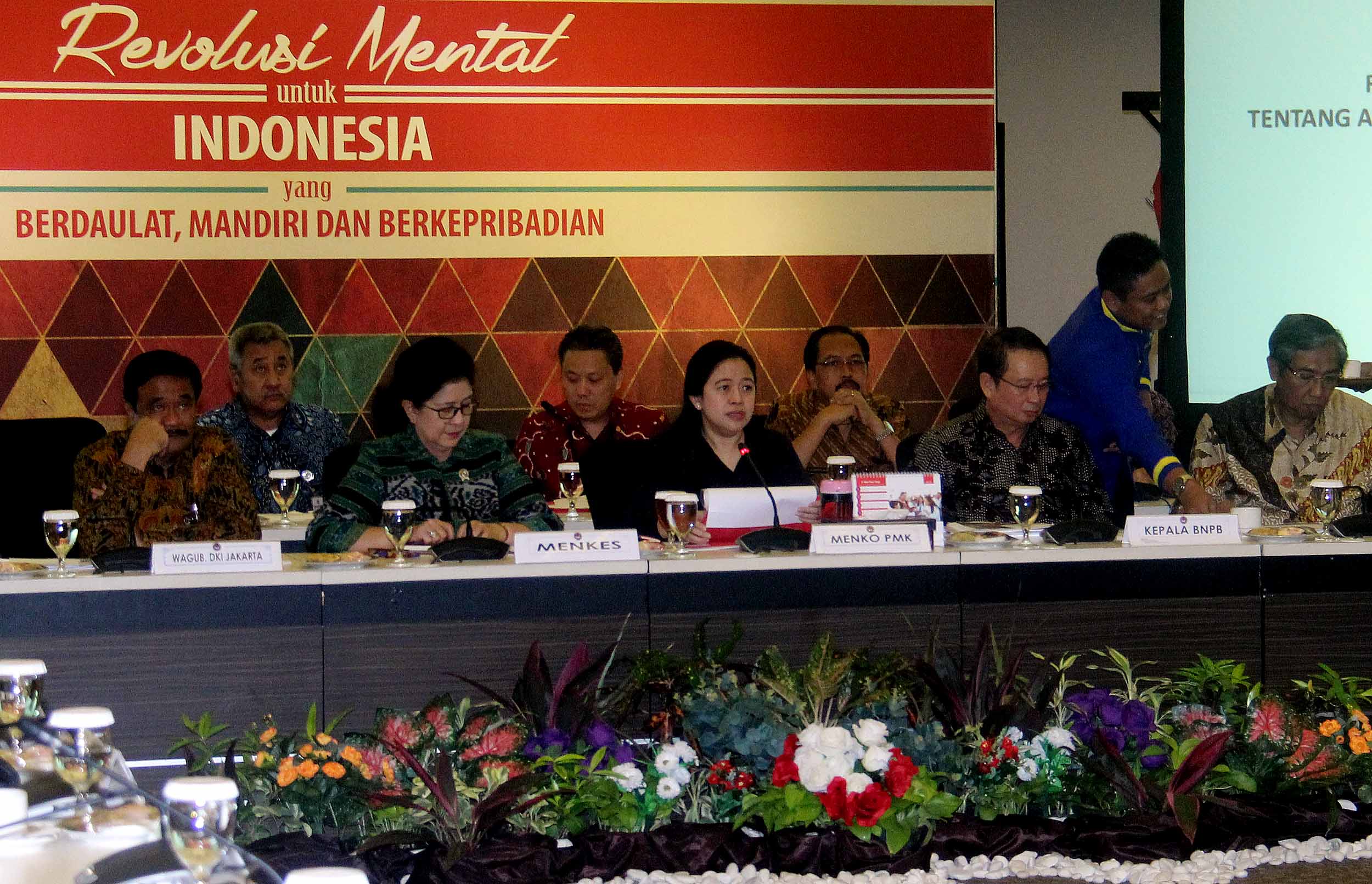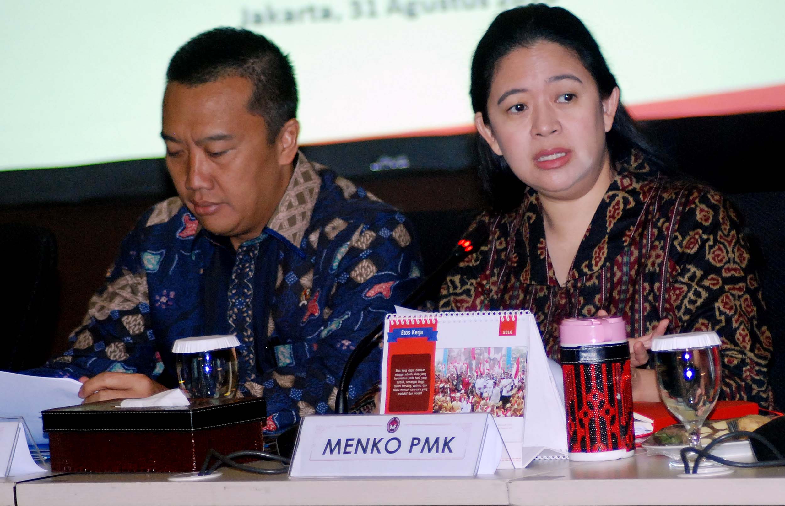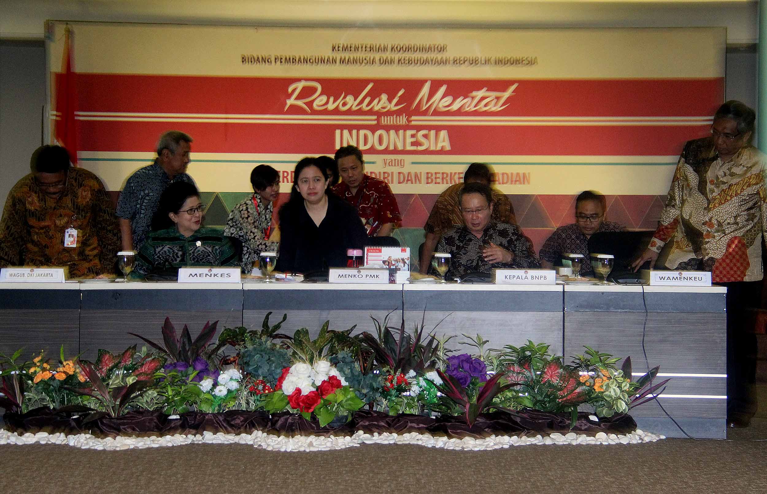 Menko PMK Puan Maharani (tengah) memimpin rakor yang di dampingi Wagub DKI Jakarta Djarot Saiful Hidayat, Menteri Kesehatan Nila Djuwita F. Moeloek, Kepala BNPB Willem Rampangilei, wakil Menteri Keuangan Mardiasmo, di kantor Kemenko PMK, Jakarta, Jumat (2/9/2016). Rapat koordinasi Tingkat Menteri membahas Antisipasi Bahaya Banjir dan Tanah Longsor tahun 2016