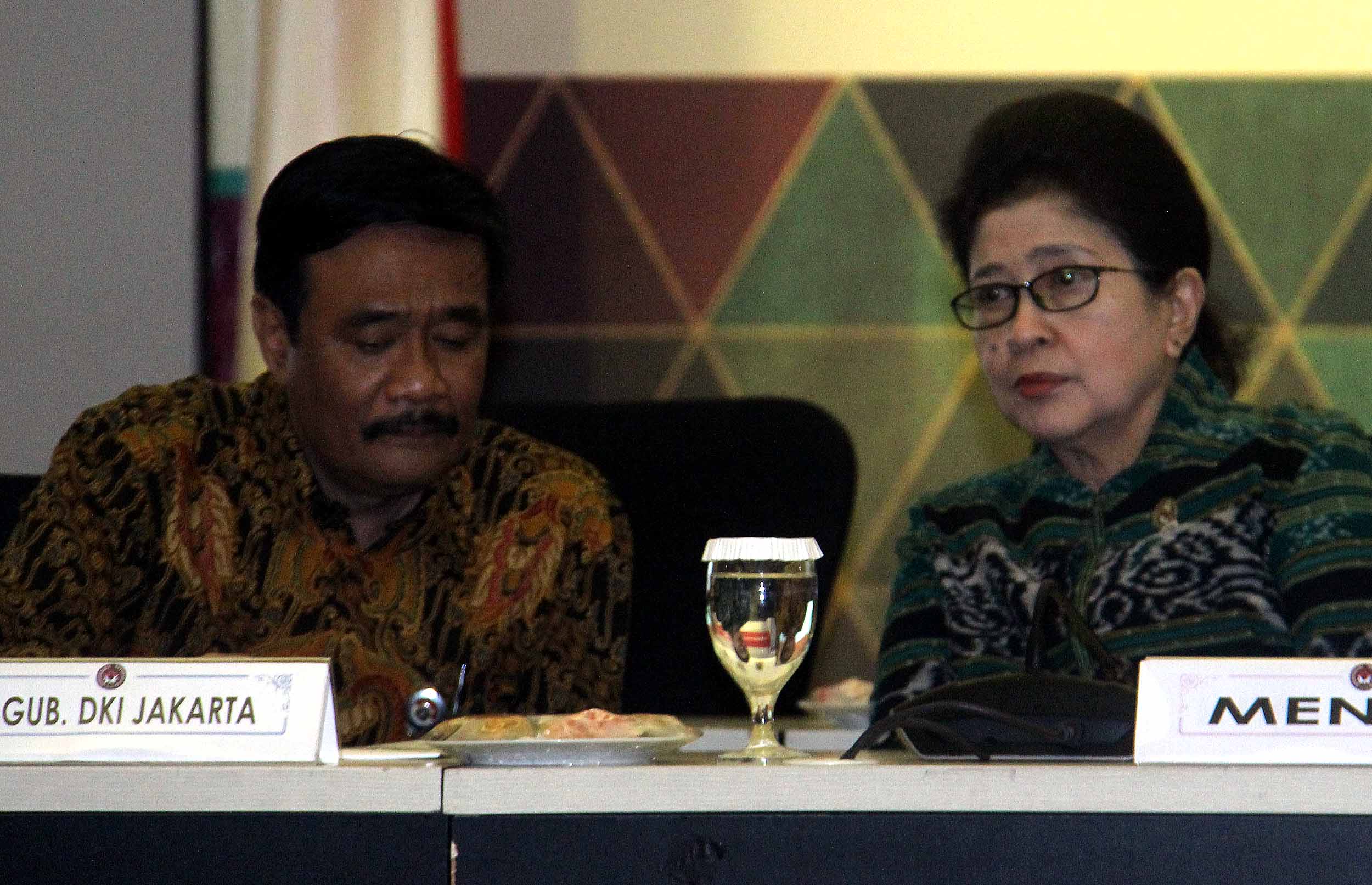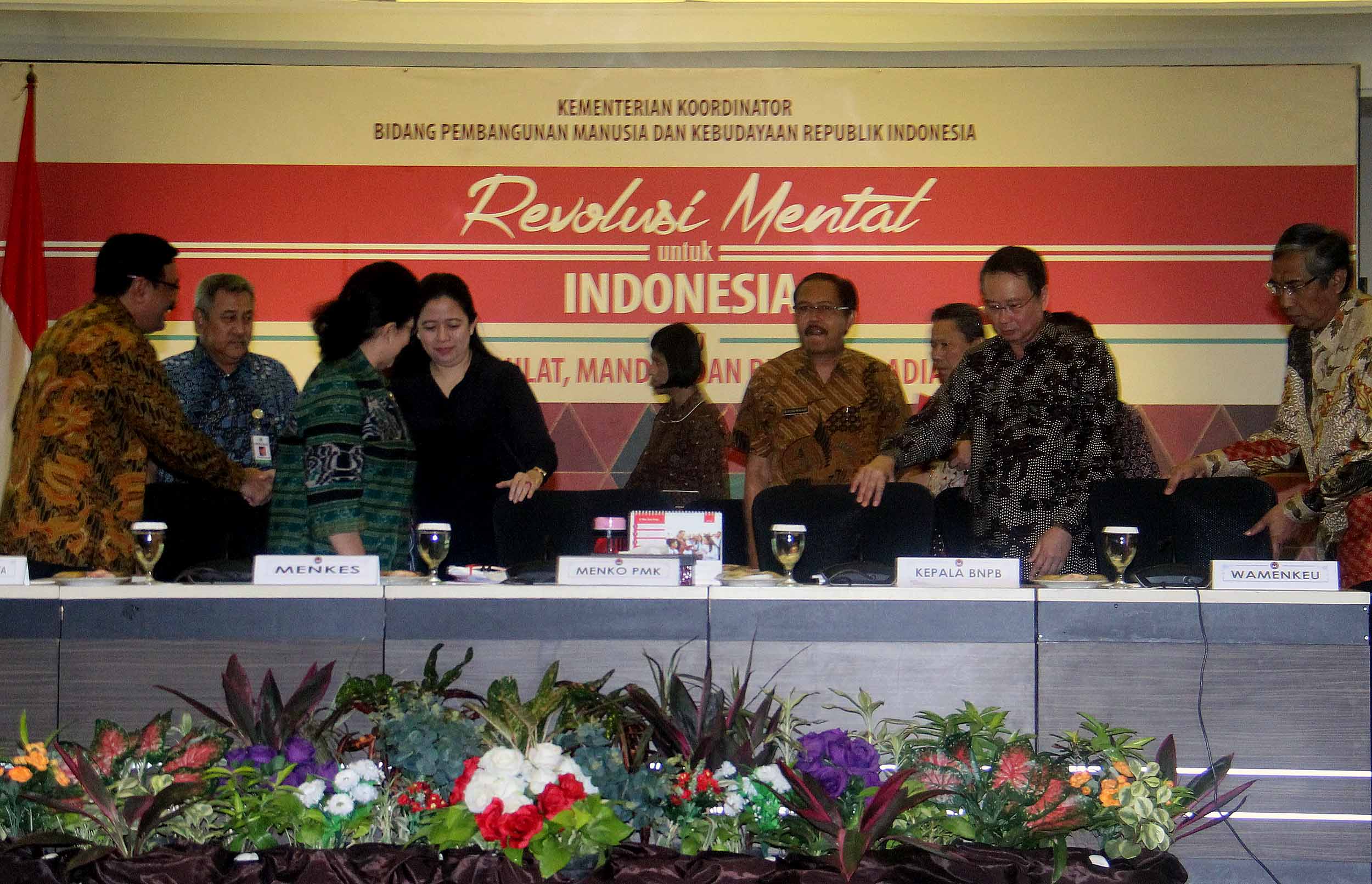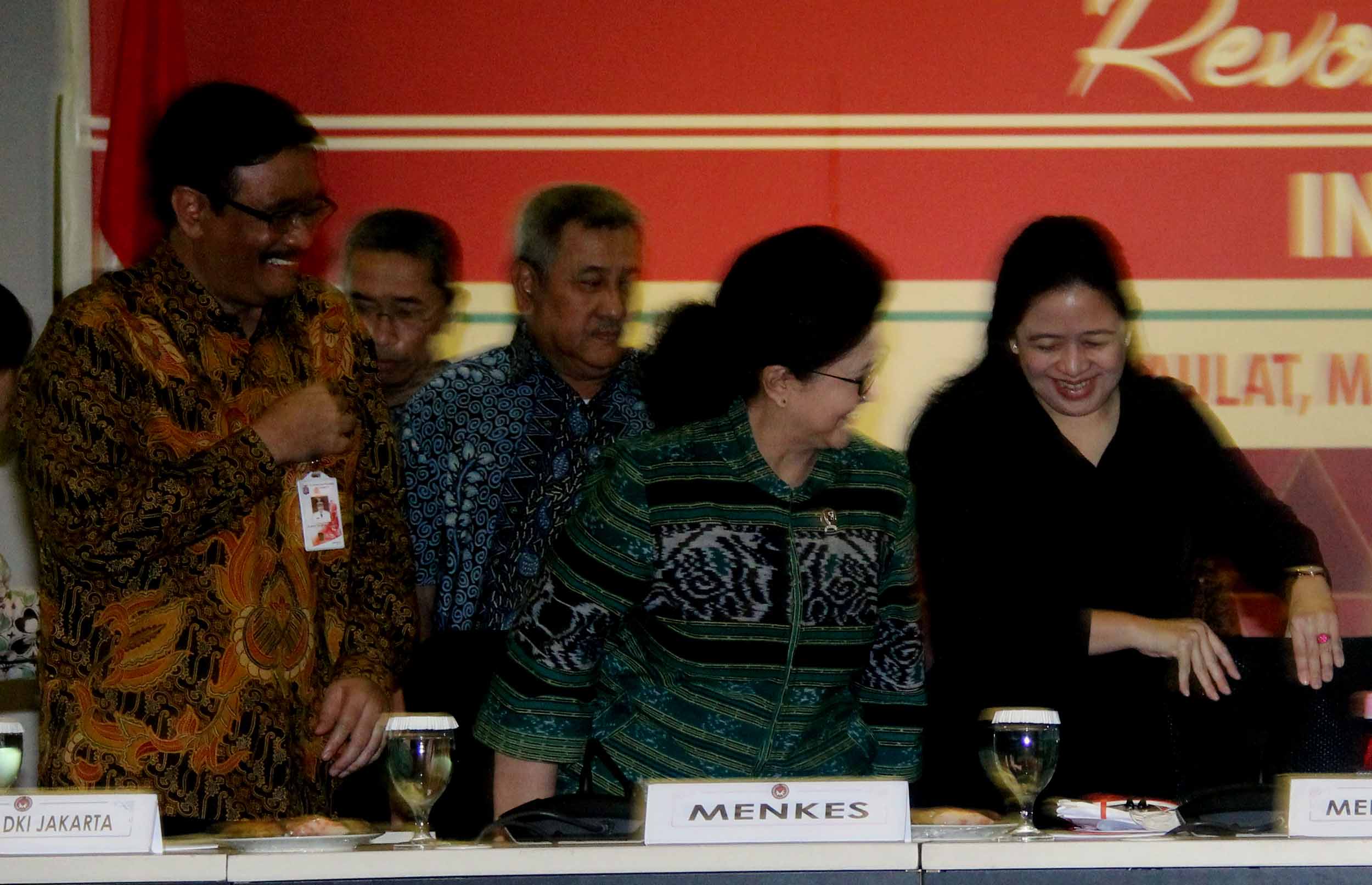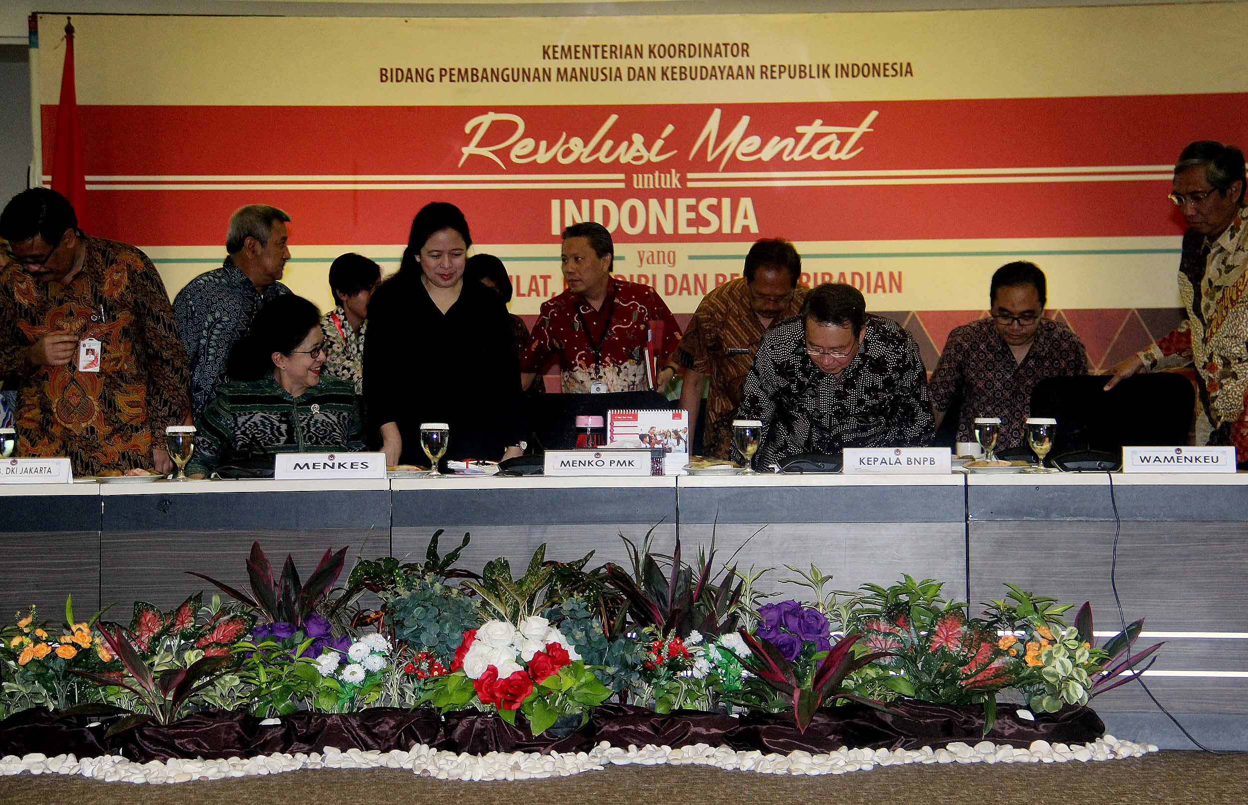 Menko PMK Puan Maharani (tengah) memimpin rakor yang di dampingi Wagub DKI Jakarta Djarot Saiful Hidayat, Menteri Kesehatan Nila Djuwita F. Moeloek, Kepala BNPB Willem Rampangilei, wakil Menteri Keuangan Mardiasmo, di kantor Kemenko PMK, Jakarta, Jumat (2/9/2016). Rapat koordinasi Tingkat Menteri membahas Antisipasi Bahaya Banjir dan Tanah Longsor tahun 2016