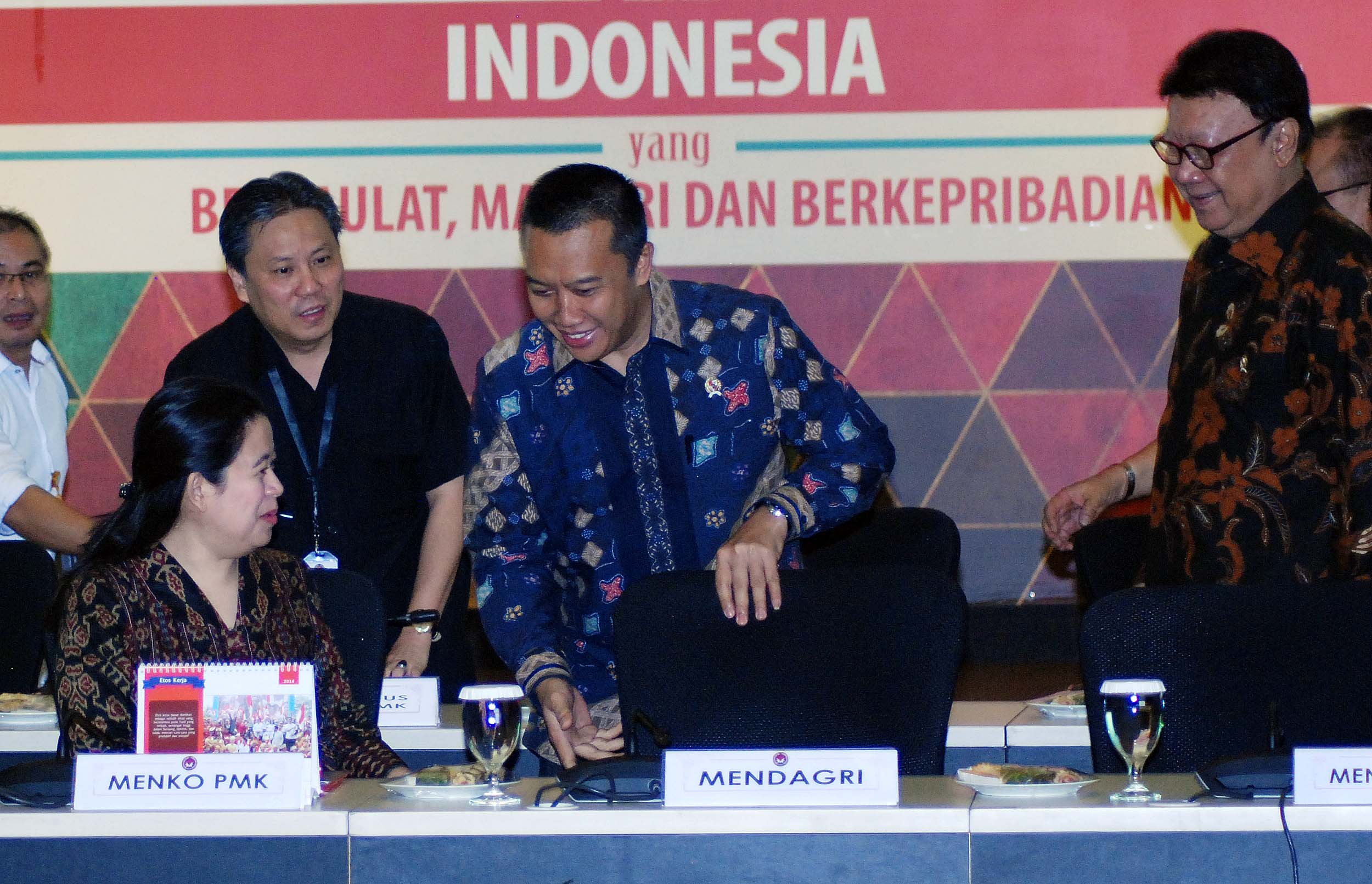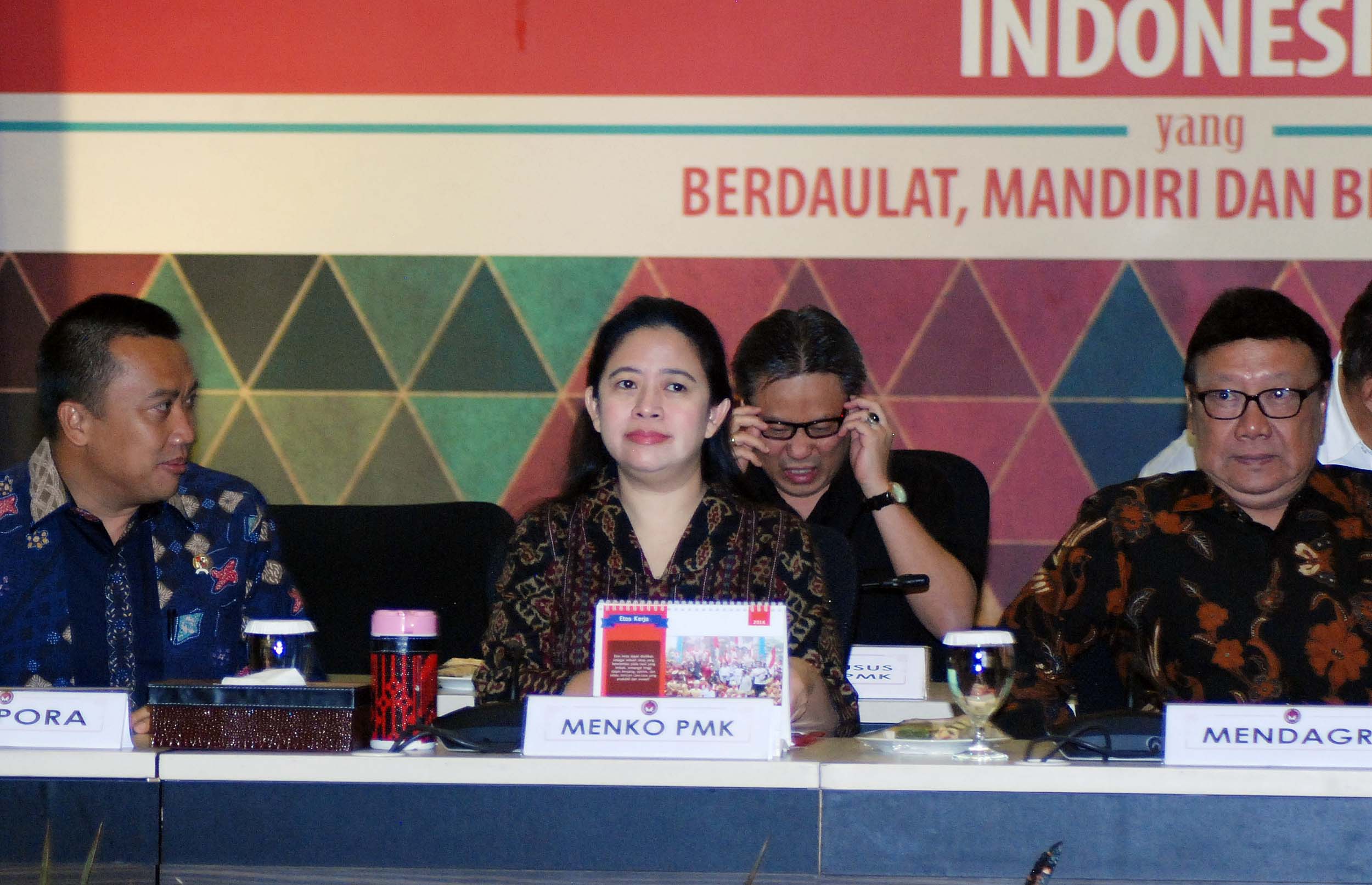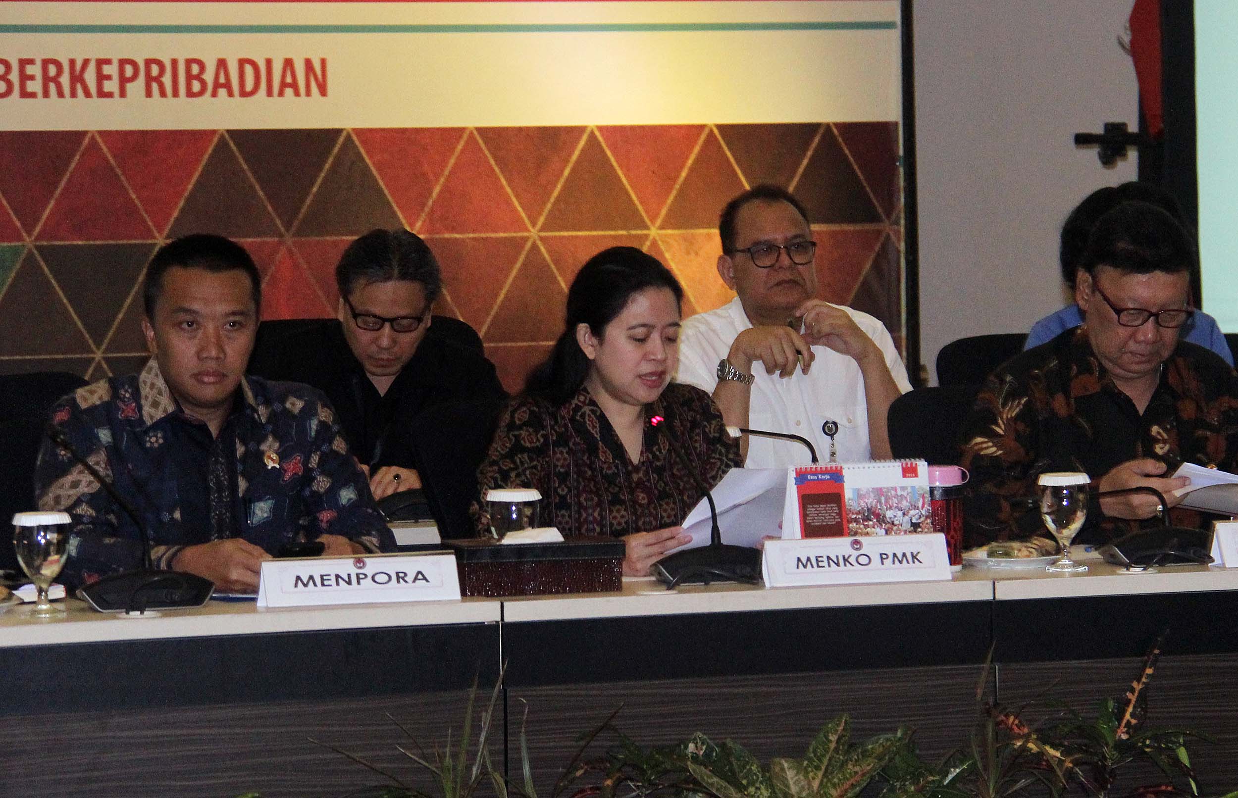 Menko PMK Puan Maharani (tengah) didampingi Menpora Imam Nahrawi (kiri) dan Mendagri Tjahjo Kumolo (kanan) saat Rapat Koordinasi (Rakor) menjelang Asean Games di kantor PMK, Jakarta, Rabu (31/8/2016). Rakor Tingkat Menteri yang dihadiri Menpora dan Mendagri membahas persiapan penyelenggaraan Asean Games pada tahun 2018.