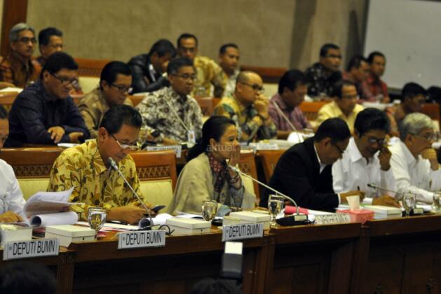 Menteri BUMN Rini Soemarno saat mengikuti rapat kerja dengan Komisi VI DPR RI di Gedung DPR RI, Senayan, Jakarta, Kamis (10/1/2015). Raker tersebut membahas anggaran tahun 2016.