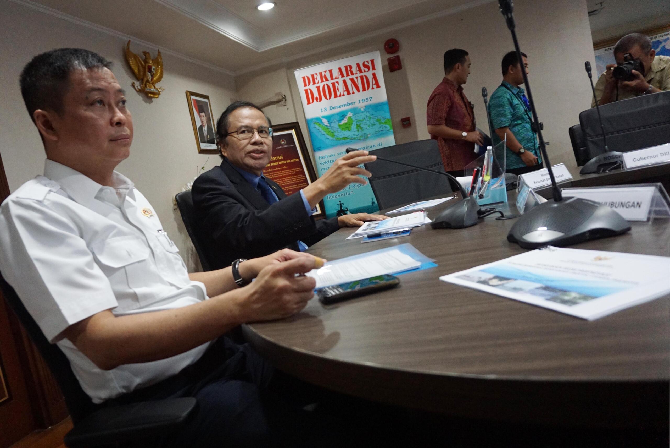 Menteri Koordinator Maritim Dan Sumber Daya Rizal Ramli (kedua kiri) bersama Menteri Perhubungan Ignatius Jonan (kiri) memimpin Rapat Koordinasi penanganan reklamasi Pantai Utaran Jakarta di Gedung Kemenko Maritim, Jakarta, Kamis (30/6). Rakor tersebut membahas soal nasib moratorium reklamasi Pantai Utara Jakarta. ANTARA FOTO/Teresia May/foc/16.