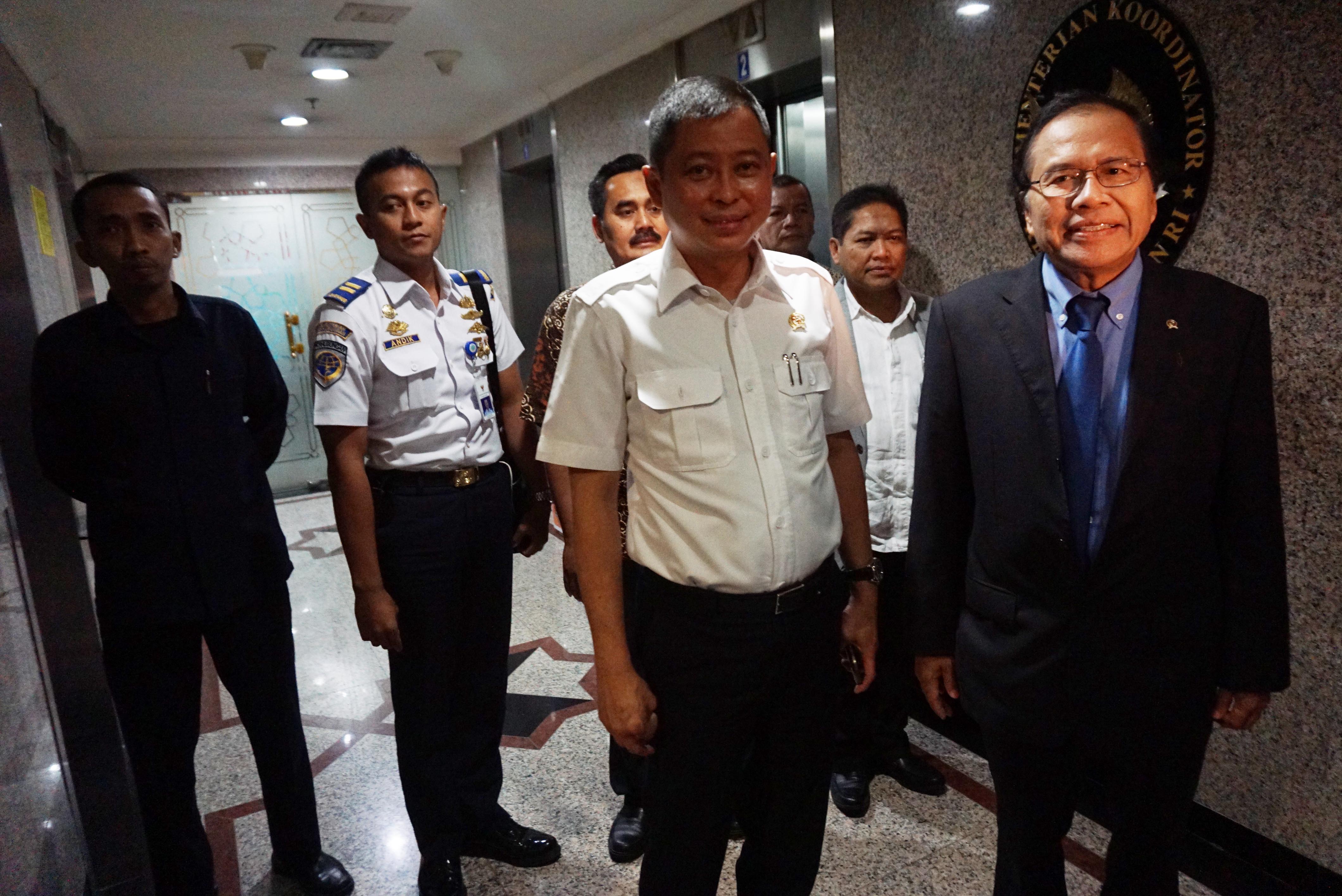 Menteri Koordinator Maritim Dan Sumber Daya Rizal Ramli (kanan) bersama Menteri Perhubungan Ignatius Jonan (kedua kanan) bersiap memimpin Rapat Koordinasi penanganan reklamasi Pantai Utaran Jakarta di Gedung Kemenko Maritim, Jakarta, Kamis (30/6). Rakor tersebut membahas soal nasib moratorium reklamasi Pantai Utara Jakarta. ANTARA FOTO/Teresia May/foc/16.