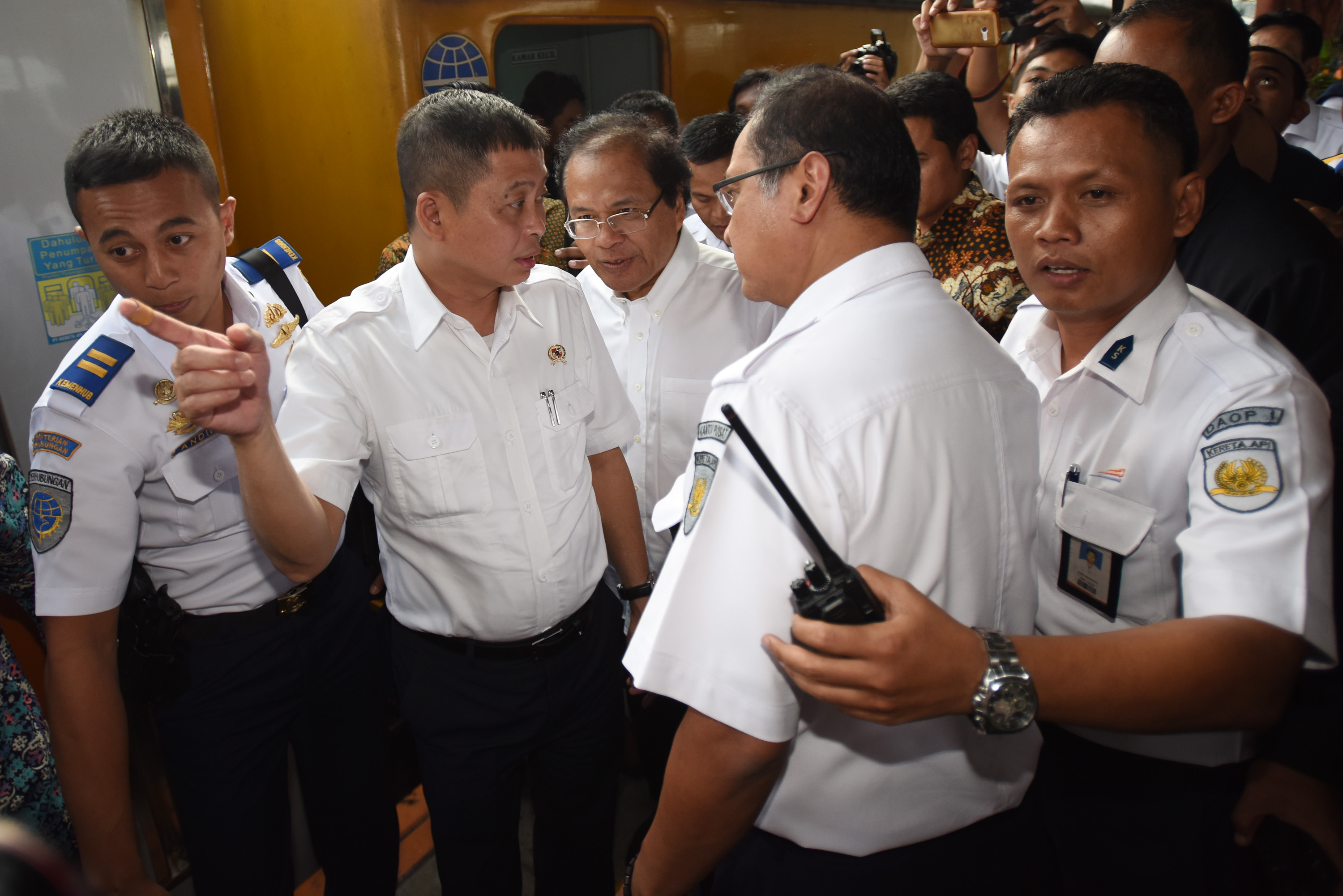 Menko Maritim dan Sumber Daya Rizal Ramli (tengah) didampingi Menhub Ignasius Jonan (kiri) dan Dirut KAI Edi Sukmoro (kedua kiri) menyapa pemudik saat melepas keberangkatan mudik gratis pengguna sepeda motor menggunakan Kereta Api Brantas tujuan Pasar Senen-Kediri di Stasiun Pasar Senen, Jakarta, Rabu (29/6). Kemenhub memberangkatkan 15 ribu pemudik motor menggunakan kereta api dan 12 ribu lainnya menggunakan bus selama arus mudik 2016 untuk mengurangi volume kendaraan di jalan raya. ANTARA FOTO/Wahyu Putro A/kye/16