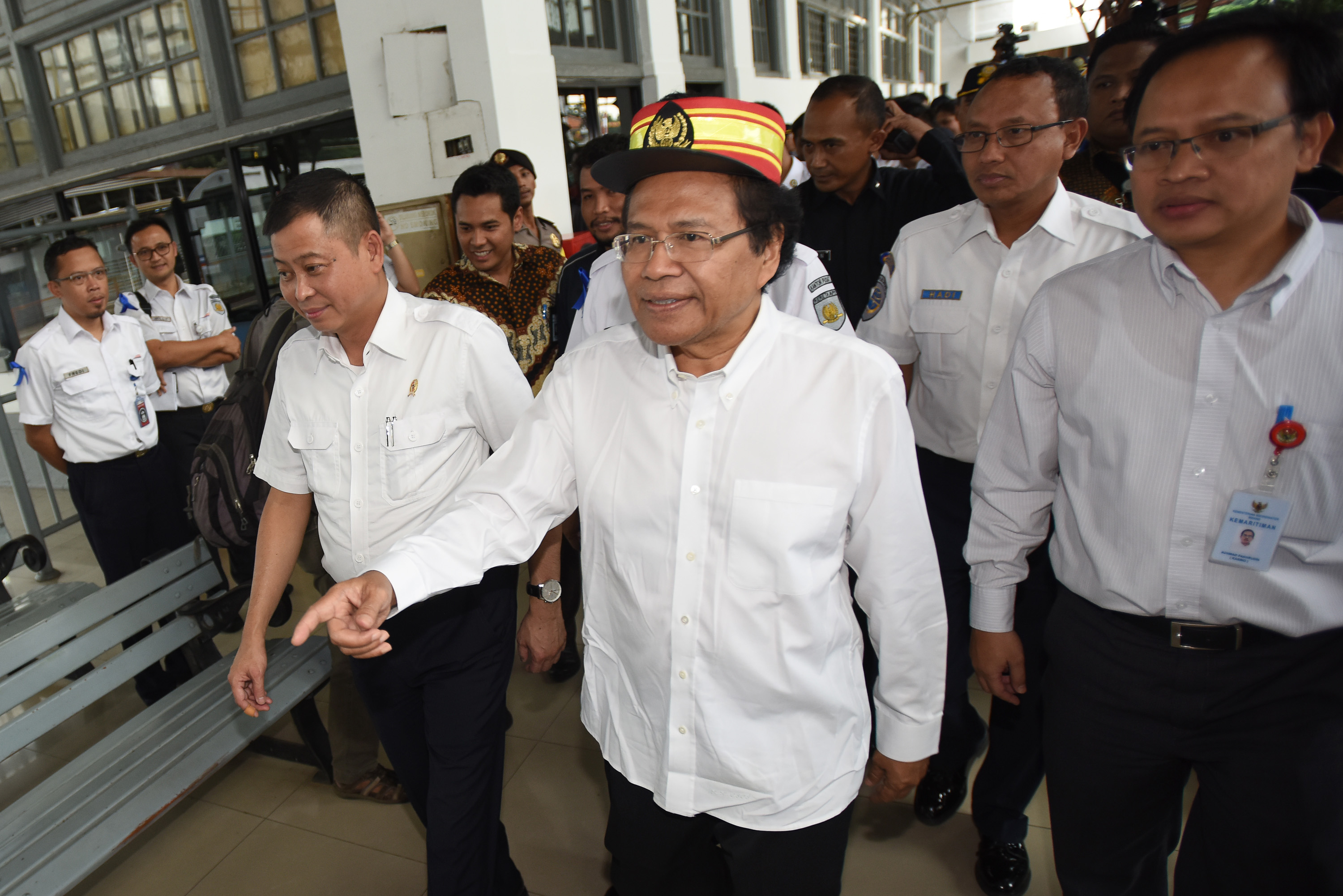 Menko Maritim dan Sumber Daya Rizal Ramli (tengah) didampingi Menhub Ignasius Jonan (kiri) berjalan seusai melepas keberangkatan mudik gratis pengguna sepeda motor menggunakan Kereta Brantas tujuan Pasar Senen-Kediri di Stasiun Pasar Senen Jakarta, Rabu (29/6). Kemenhub memberangkatkan 15 ribu pemudik motor menggunakan kereta api dan 12 ribu lainnya menggunakan bus selama arus mudik 2016 untuk mengurangi volume kendaraan di jalan raya. ANTARA FOTO/Wahyu Putro A/kye/16