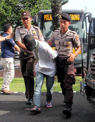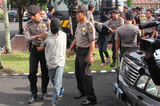 Anggota Polres Rejang Lebong menggiring 6 dari 7 orang tersangka anak - anak kedalam ruang Polres Rejang lebong saat diadakan pertemuan tertutup dengan Menteri Pemberdayaan Perempuan dan Perlindungan Anak (PPPA) Yohana Yembise Kabupaten Rejanglebong, Bengkulu, (5/5). Menteri PPPA Yohana Yembise menyatakan agar tersangka yang berstatus anak-anak sesuai dengan Undang Undang (UU) Perlindungan Anak agar dihukum maksimal 10 tahun dan direhabilitasi serta hukuman seumur hidup bagi tersangka dewasa agar menimbulkan efek jera dan juga akan percepatan pembahasan RUU Kebiri. ANTARA FOTO/David Muharmansyah/pd/16