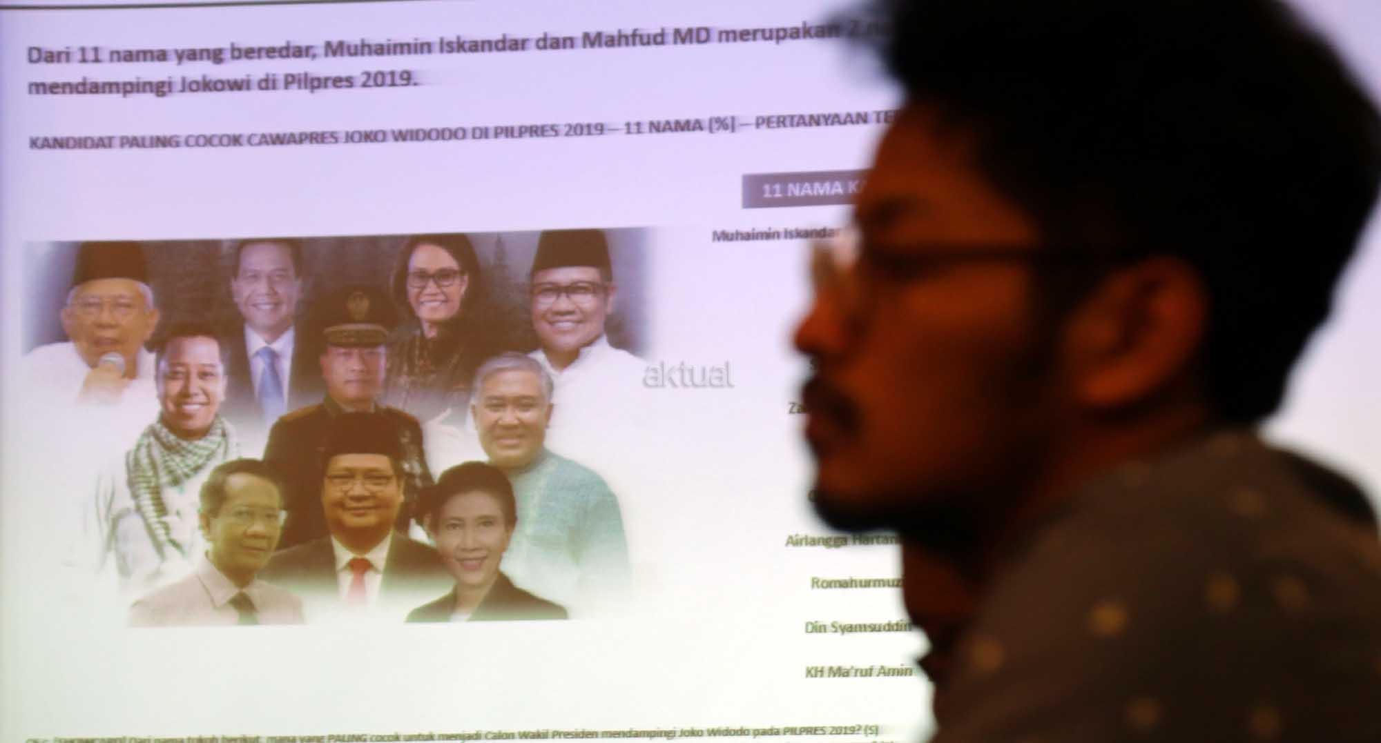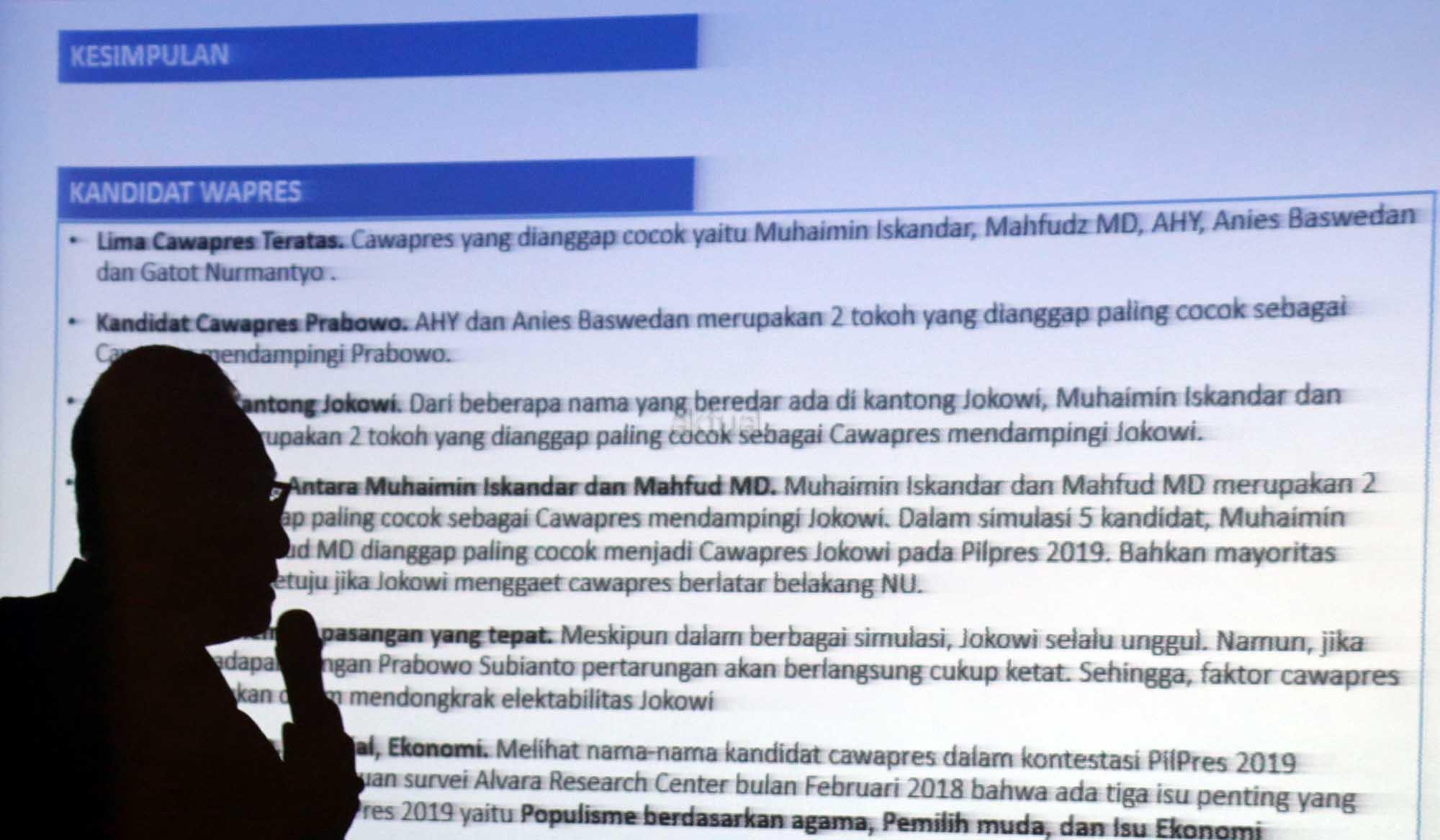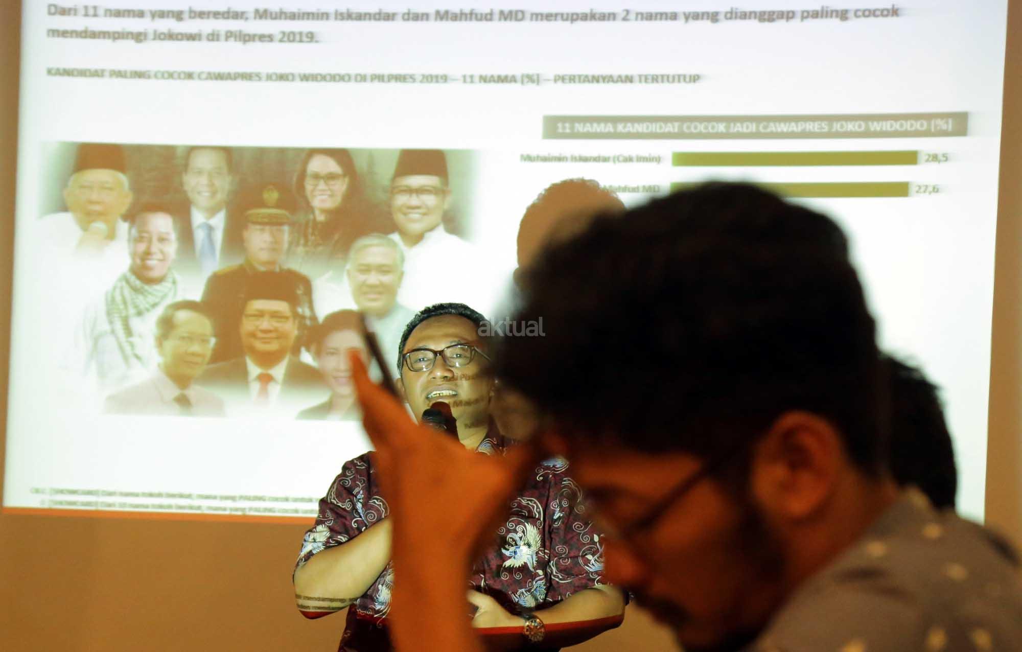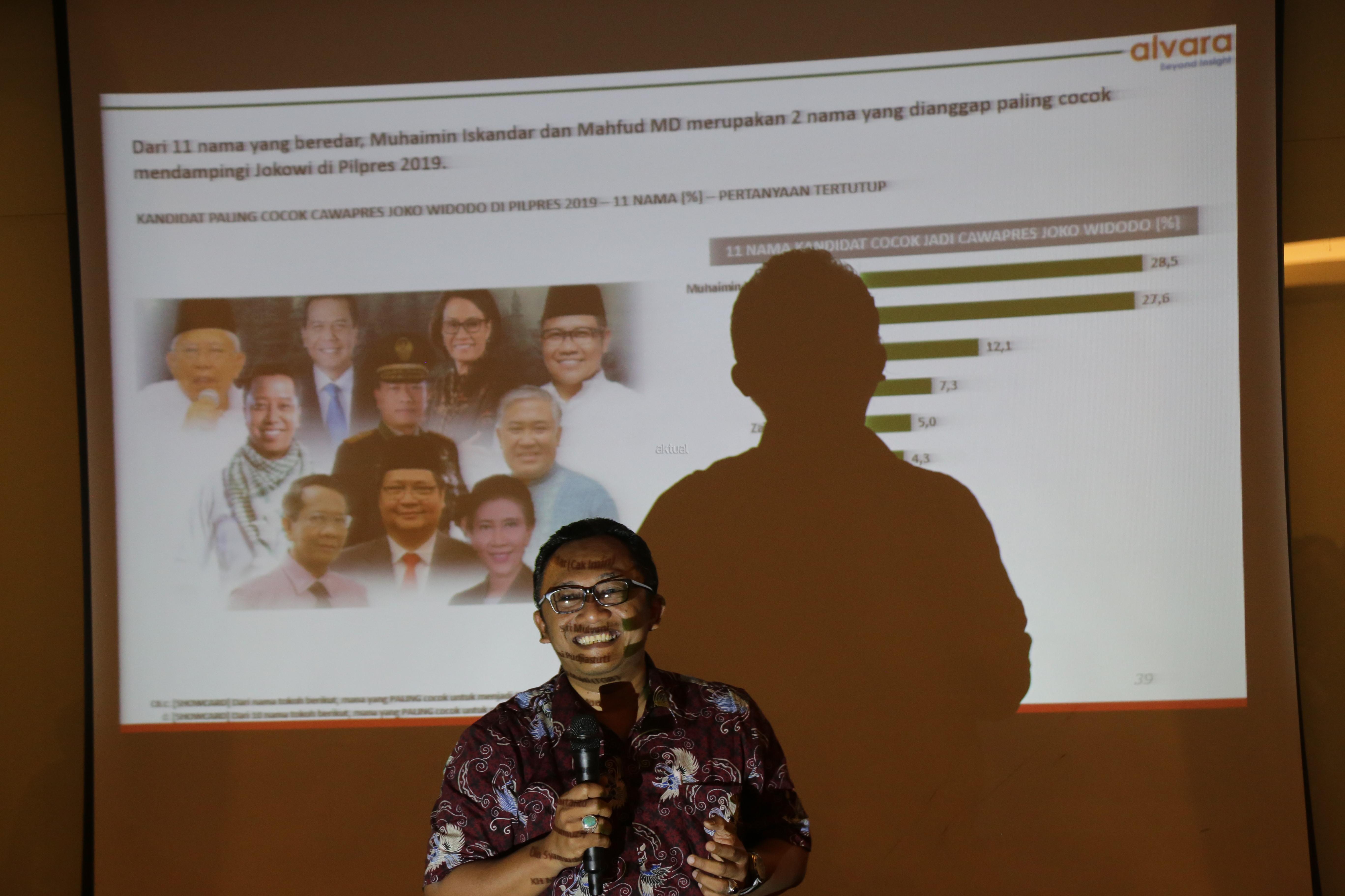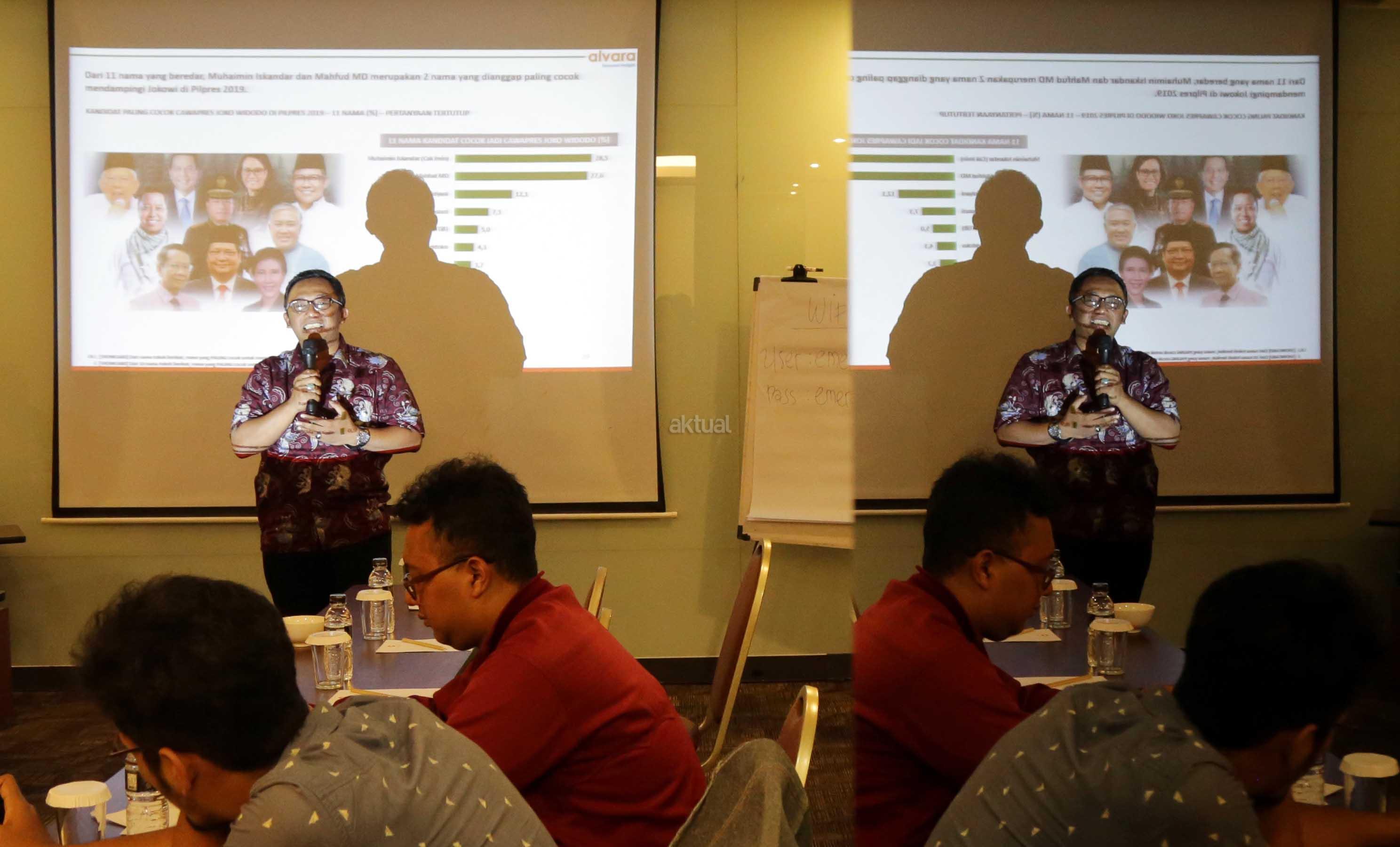 Alvara Research Canter saat pemaparan hasil survey Alvara di Jakarta, Jumat (3/8/2018). Pemilu 2019 akan menjadi panggung pertarungan bagi partai-partai besar, dari sisi popularitas partai-partai besar masih sangat dominan, seperti PDIP (95,6%), Partai Golkar (91,9%), Partai Gerindra (91,4%) dan Partai Demokrat (87,0%) belum tergoyahkan dan mendominasi tingkat popularitas partai di Indonesia. Sedangkan untuk capres di sisi popularitas Joko Widodo (97,7%) sedangkan Prabowo Subianto (96,8%). AKTUAL/Tino Oktaviano