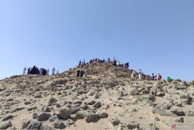 Puluhan jamaah haji dari berbagai negara termasuk Indonesia tampak menaiki Bukit Rumat, mereka berfoto bahkan ada yang berdoa di atas bukit batu tersebut.