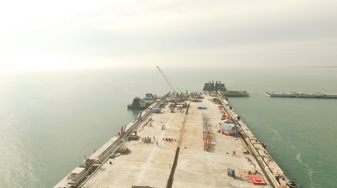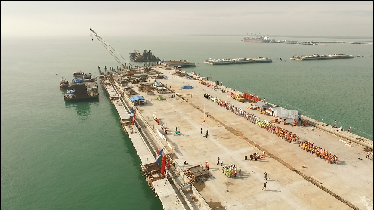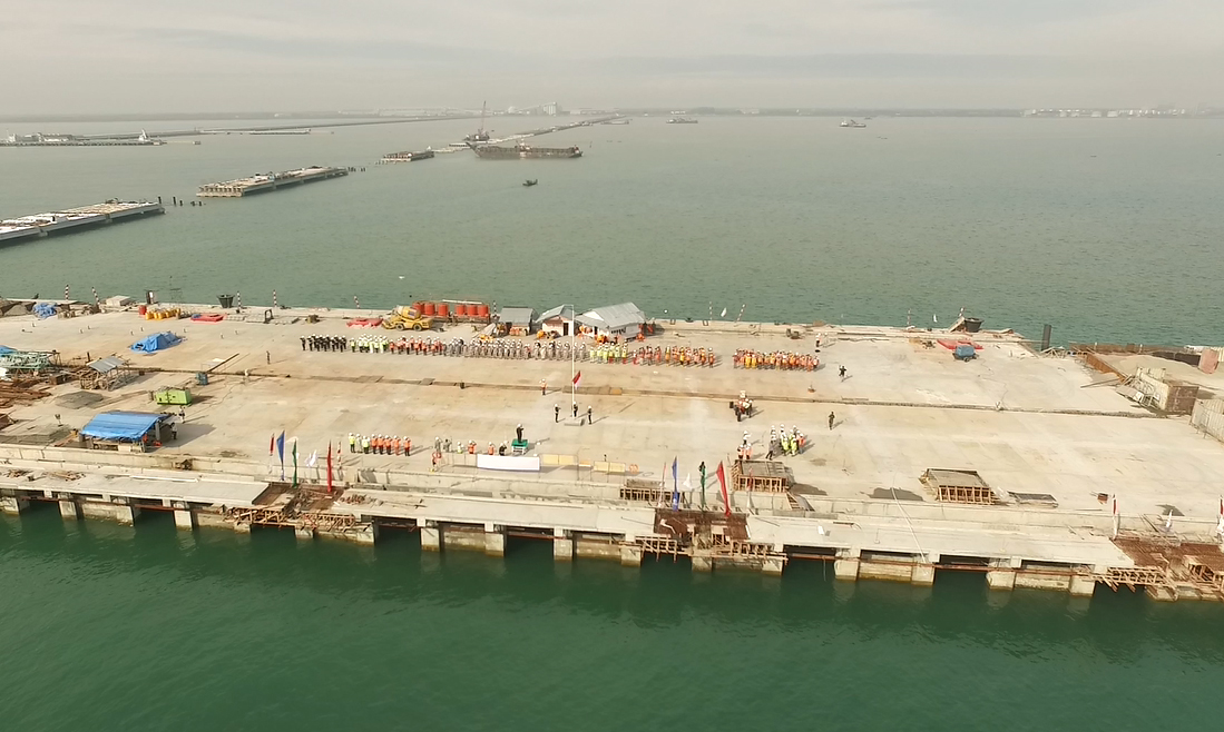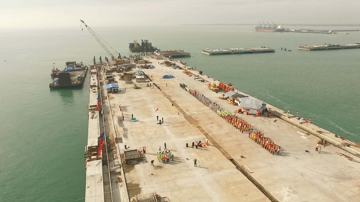 Karyawan PT Prima Multi Terminal (PMT) mengibarkan bendera di proyek pembangunan dermaga Pelabuhan Kuala Tanjung yang berjarak 3000 meter dari pantai di Kabupaten Batubara, Sumatera Utara, Kamis (17/8). Tiga BUMN yakni Pelindo I, PT PP dan Waskita Karya melalui anak usahanya PT Prima Multi Terminal tengah menyelesaikan pembangunan Pelabuhan Kuala Tanjung yang diproyeksikan menjadi pelabuhan terbesar yang memiliki kedalaman kolam hingga 17-19 meter dan menjadi hub Internasional di kawasan barat Indonesia. AKTUAL/IST