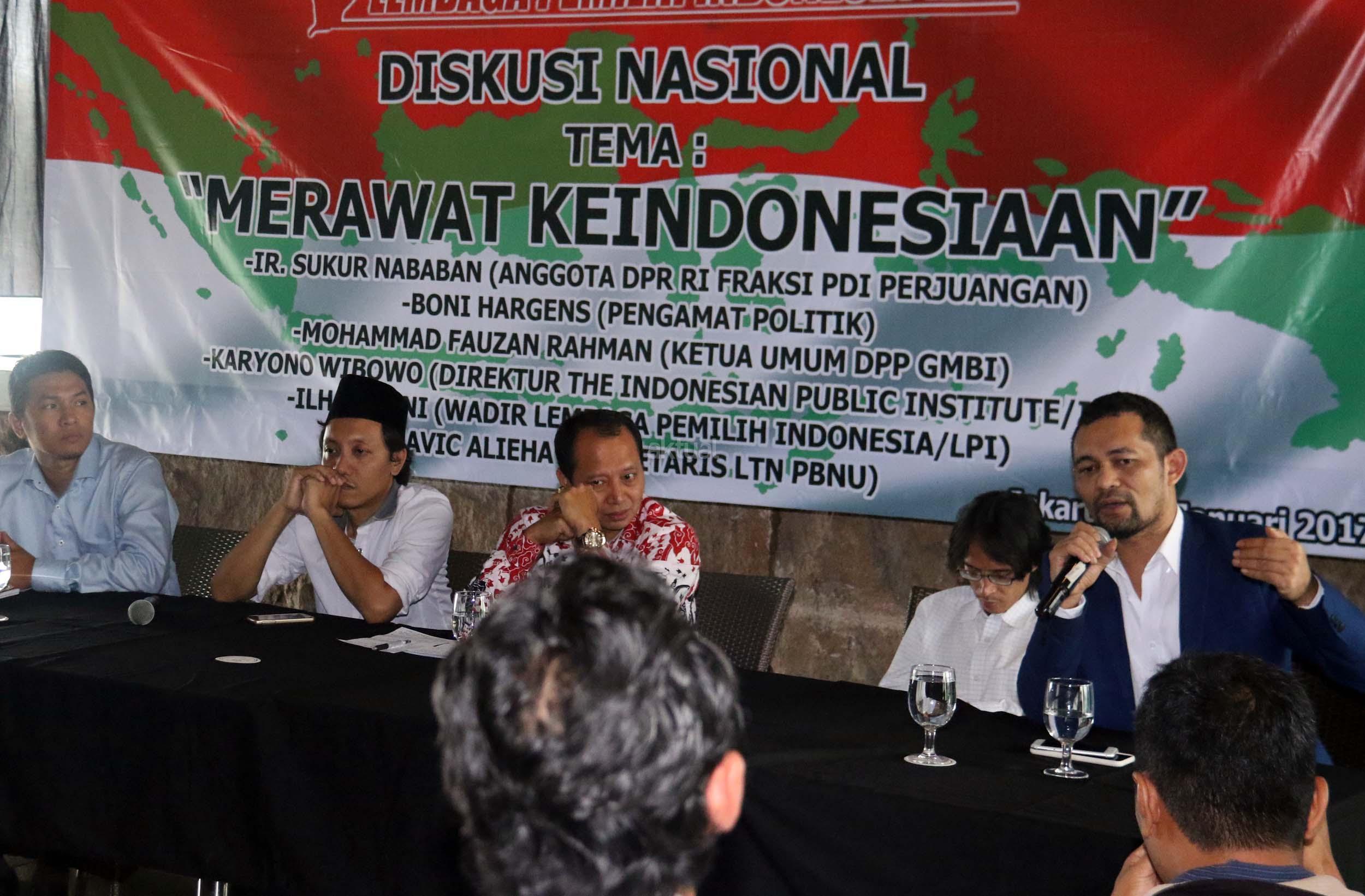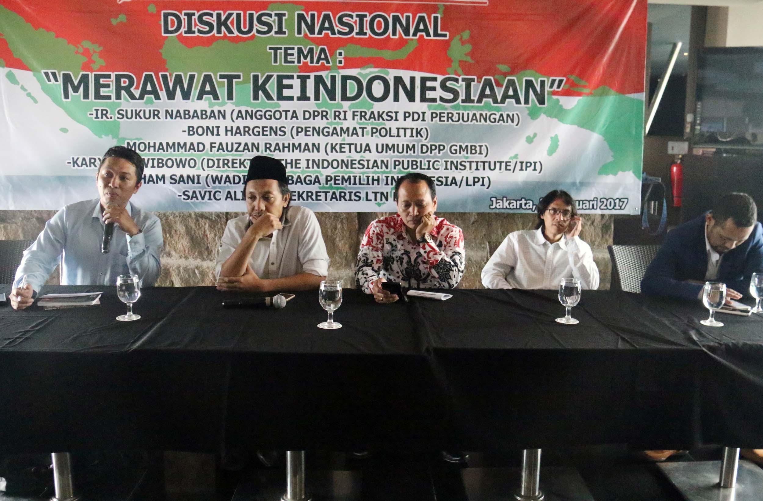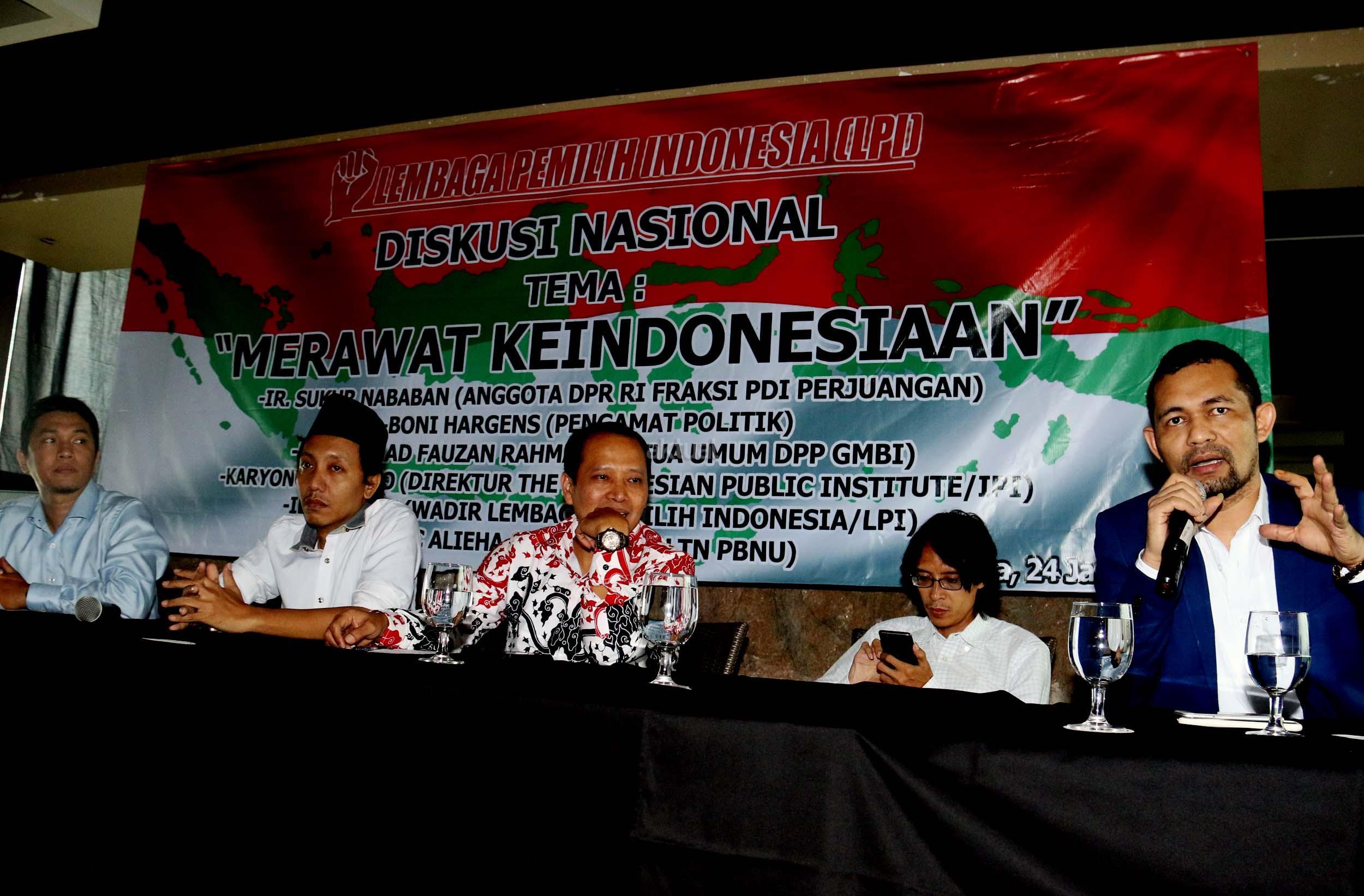 Kiri-kanan ; Wadir Lembaga Pemilih Indonesia/LPI Ilham Sani, moderator, Direktur The Indonesian Public Institute/IPI Karyono Wibowo, Sekretaris LTN PBNU Safic Alieha dan Pengamat Politik Boni Hargens menjadi pembicara Diskusi Nasional Merawat Keindonesiaan di Jakarta, Selasa (24/1/2017). Diskusi yang diselenggarakan Lembaga Pemilih Indonesia itu membahas kondisi terkini kebhinekaan NKRI.