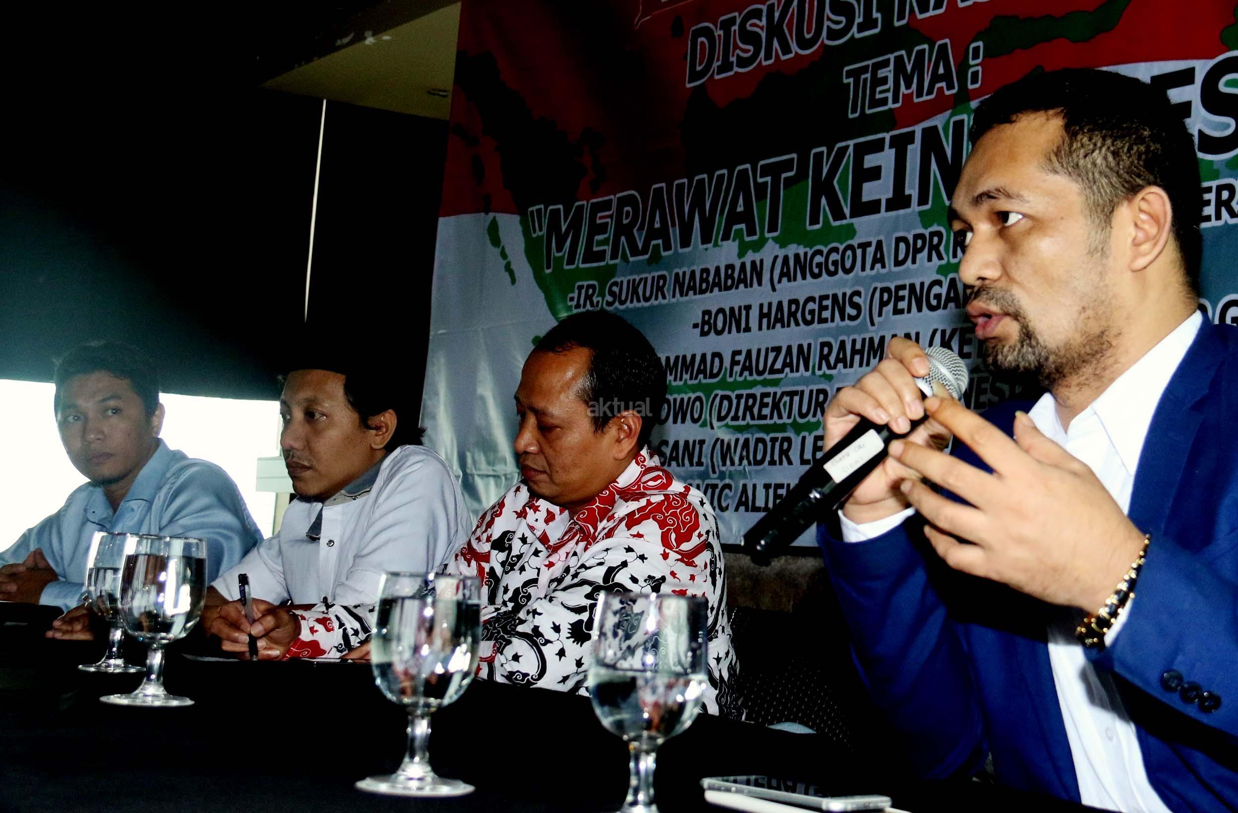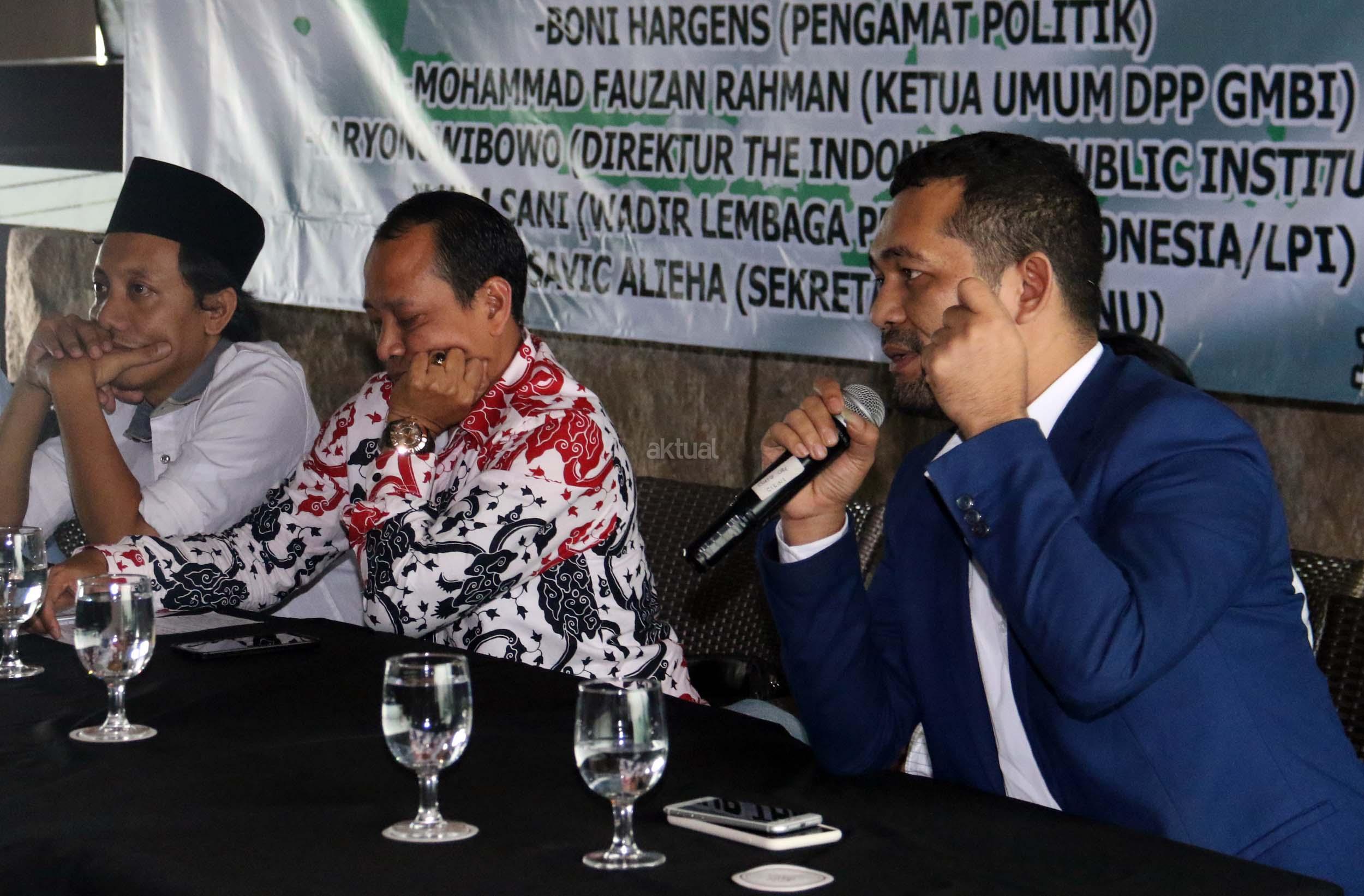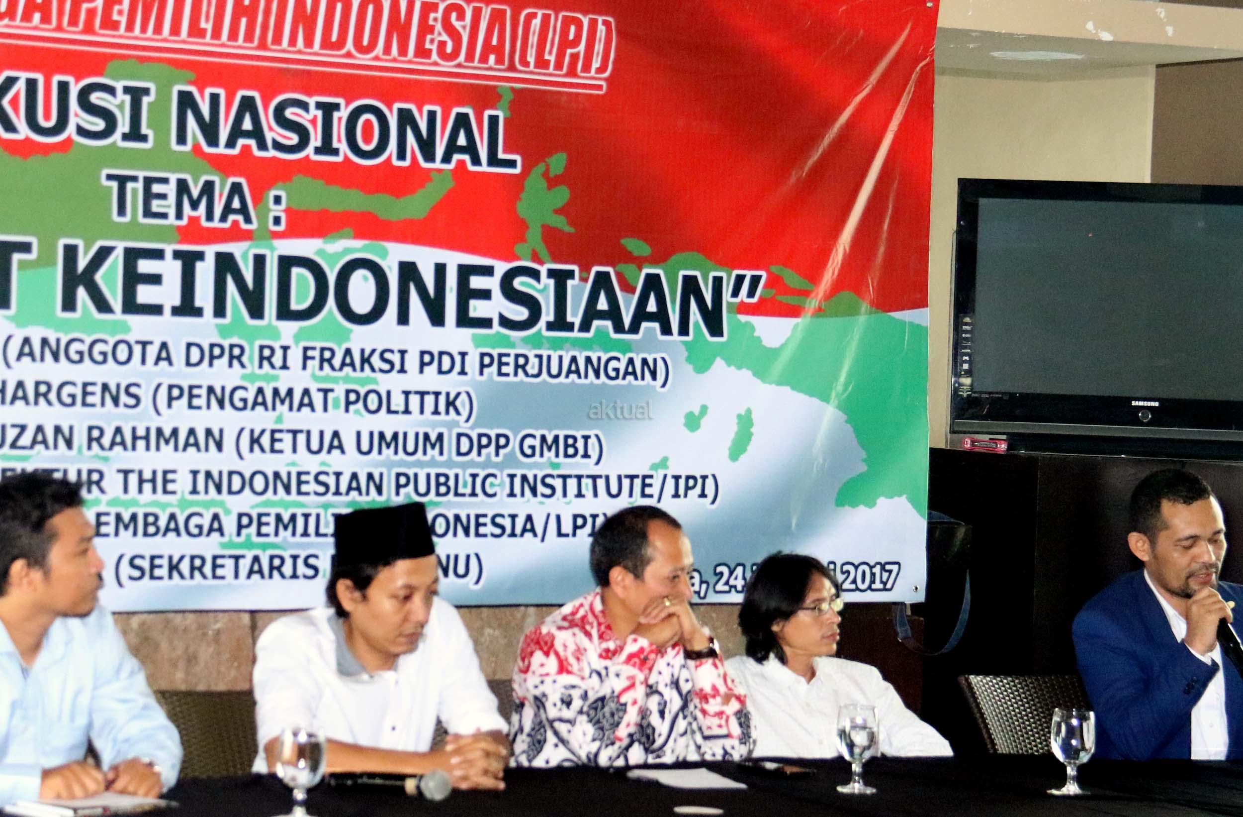 Kiri-kanan ; Wadir Lembaga Pemilih Indonesia/LPI Ilham Sani, moderator, Direktur The Indonesian Public Institute/IPI Karyono Wibowo, Sekretaris LTN PBNU Safic Alieha dan Pengamat Politik Boni Hargens menjadi pembicara Diskusi Nasional Merawat Keindonesiaan di Jakarta, Selasa (24/1/2017). Diskusi yang diselenggarakan Lembaga Pemilih Indonesia itu membahas kondisi terkini kebhinekaan NKRI.