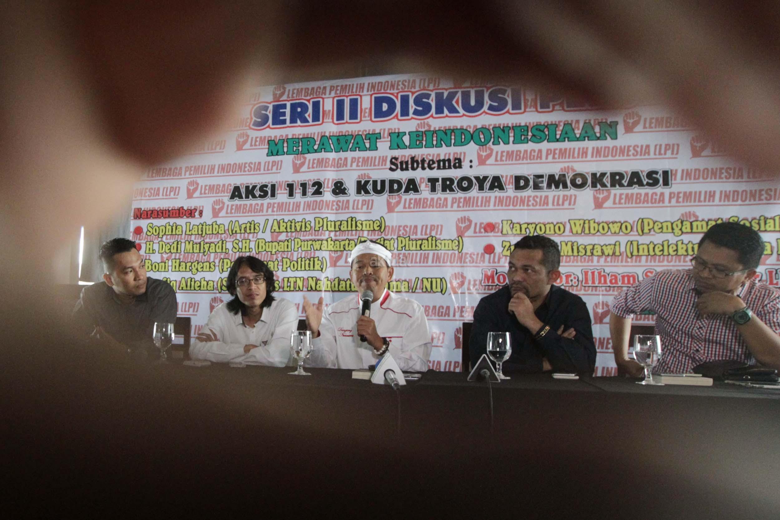 Bupati Purwakarta Dedi Mulyadi (tengah), berbicara saat diskusi publik Merawat Keindonesiaan yang diselenggarakan Lembaga Pemilih Indonesia (LPI) di Jakarta, Rabu (8/2/2017). Diskusi mengambil tema ‘Aksi 112 dan Kuda Troya Demokrasi. AKTUAL/Munzir