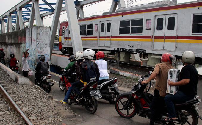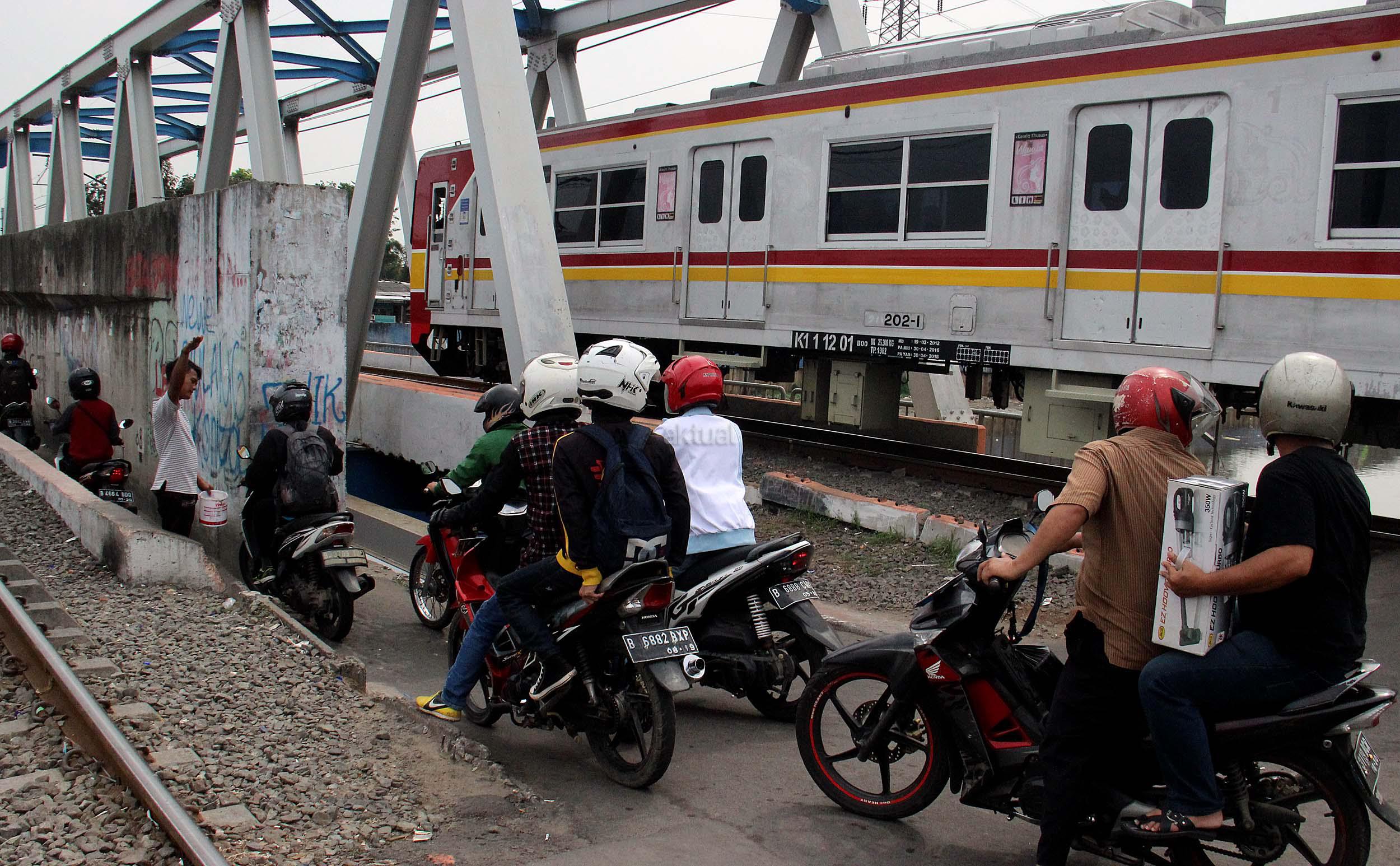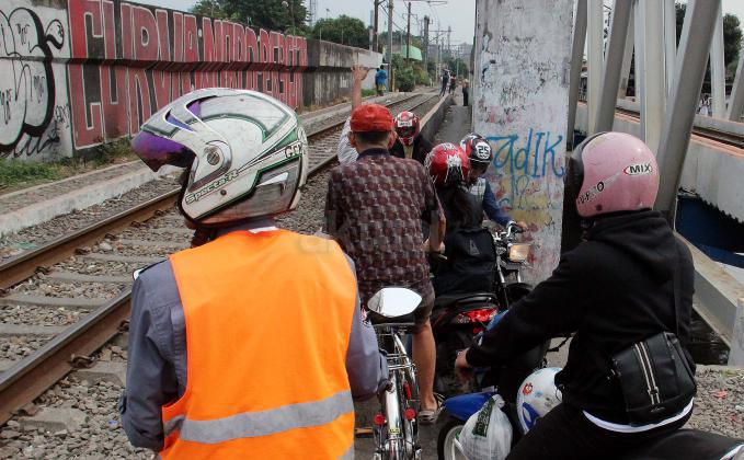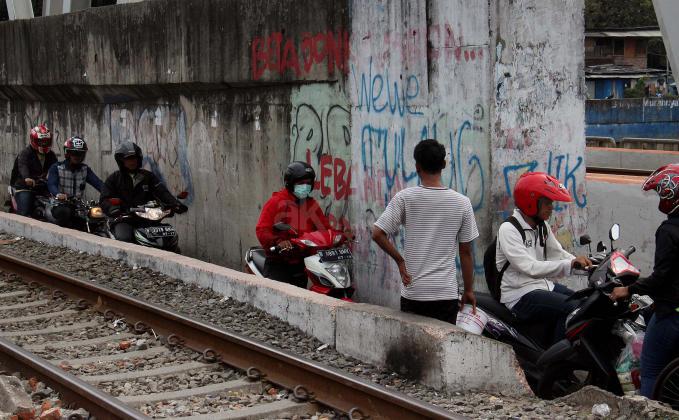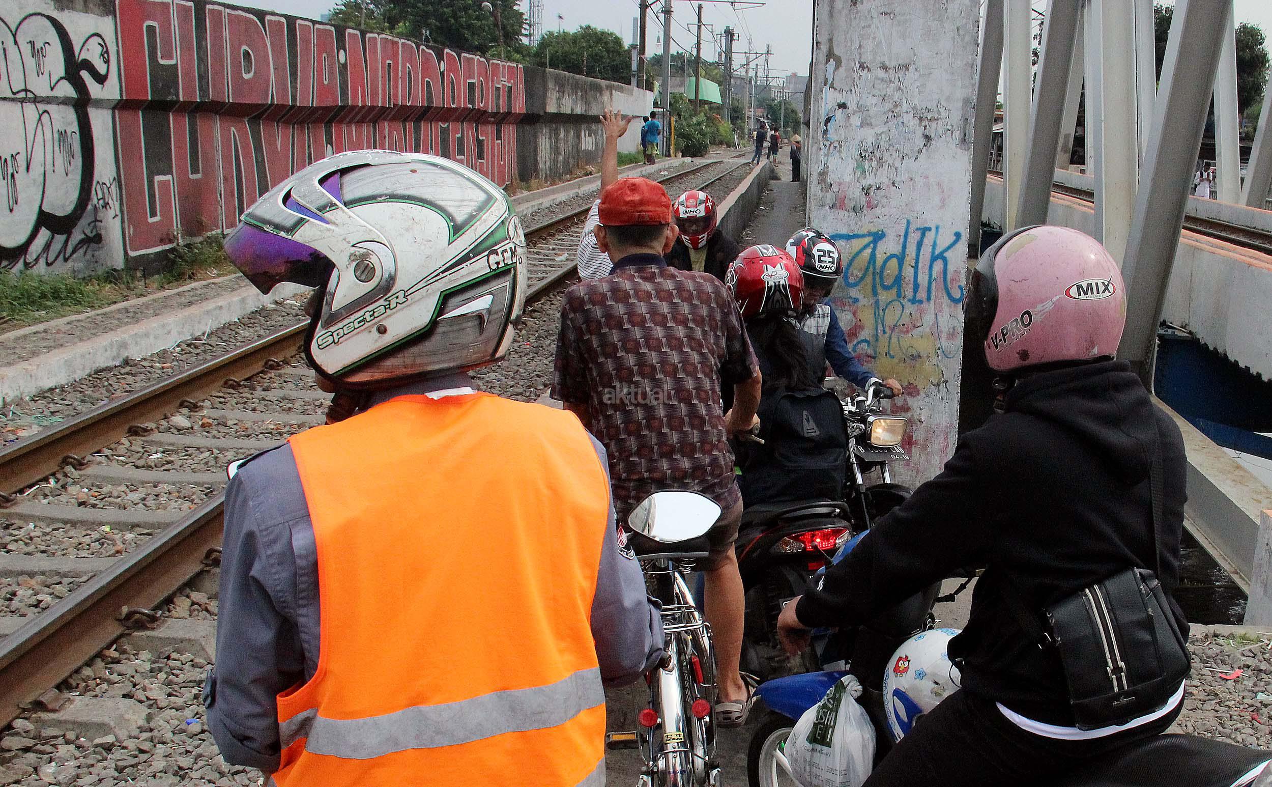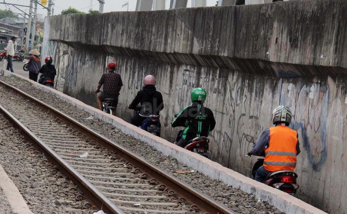 Sejumlah motor melintas disebelah jalur perlintasan kereta api dikawasan Duri Pulo di Jakarta, Senin(20/6/2016). Jarak yang dekat antara jalur motor dan jalur kereta tanpa disadari dapat membahayakan keselamatan pengendara.
