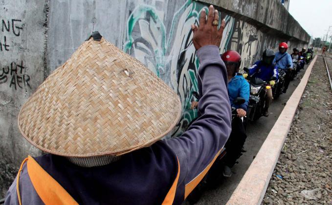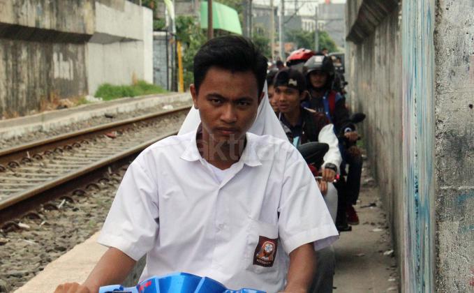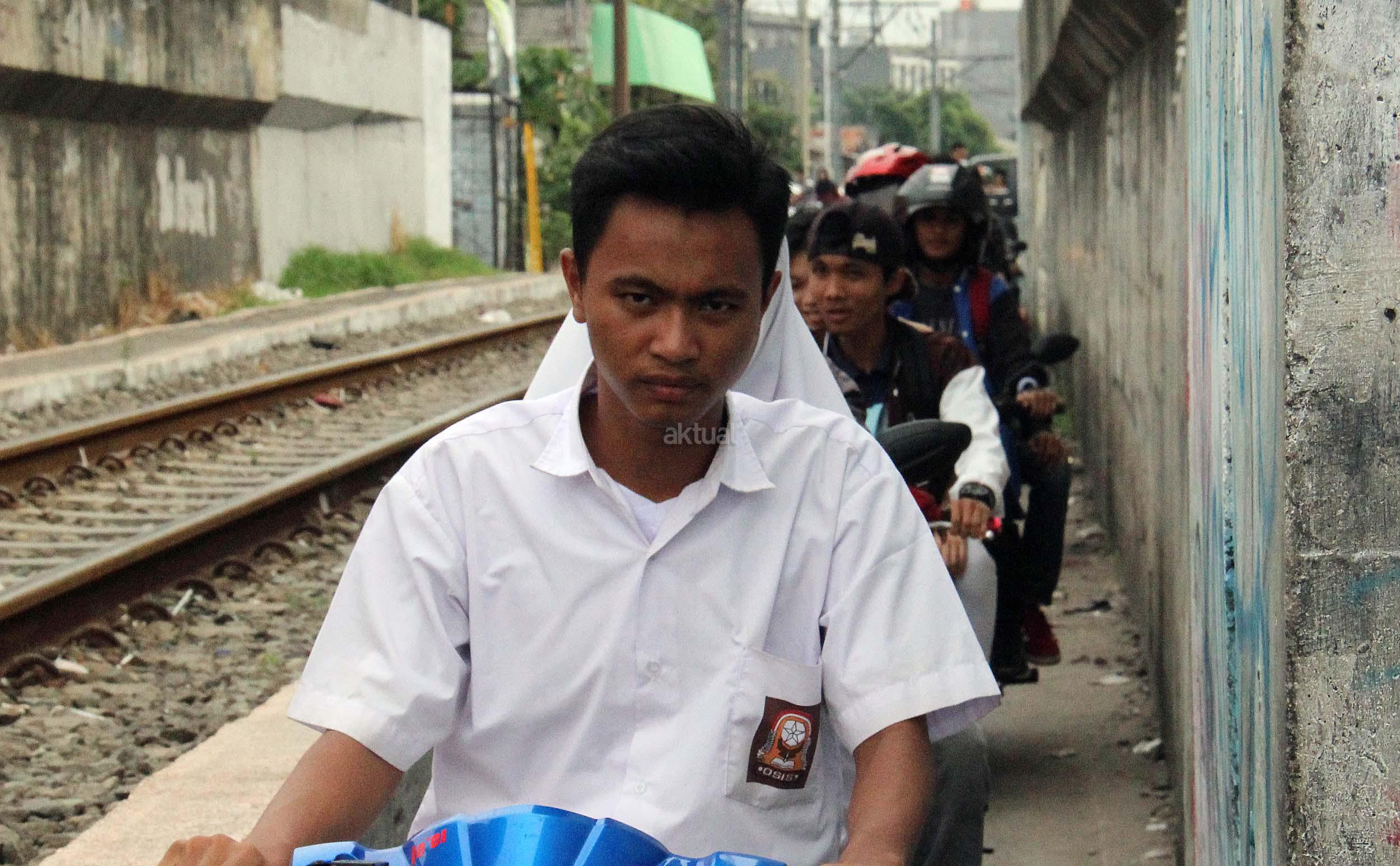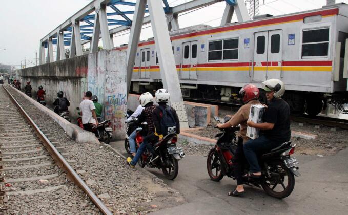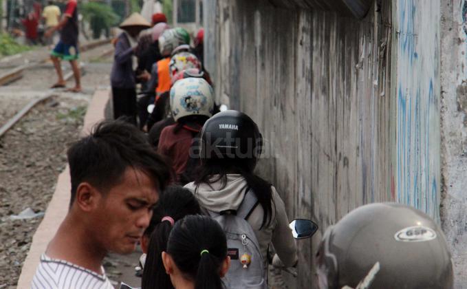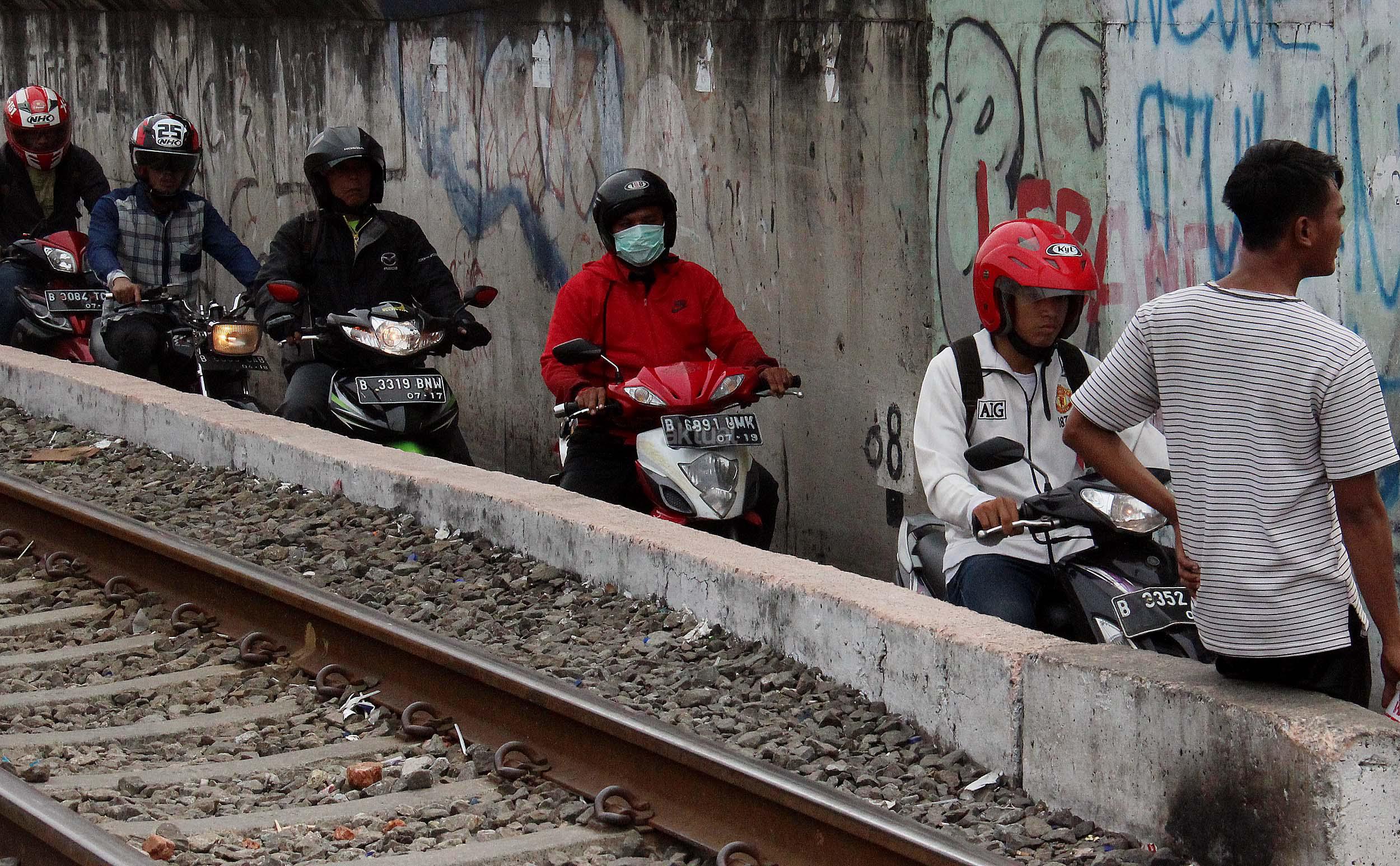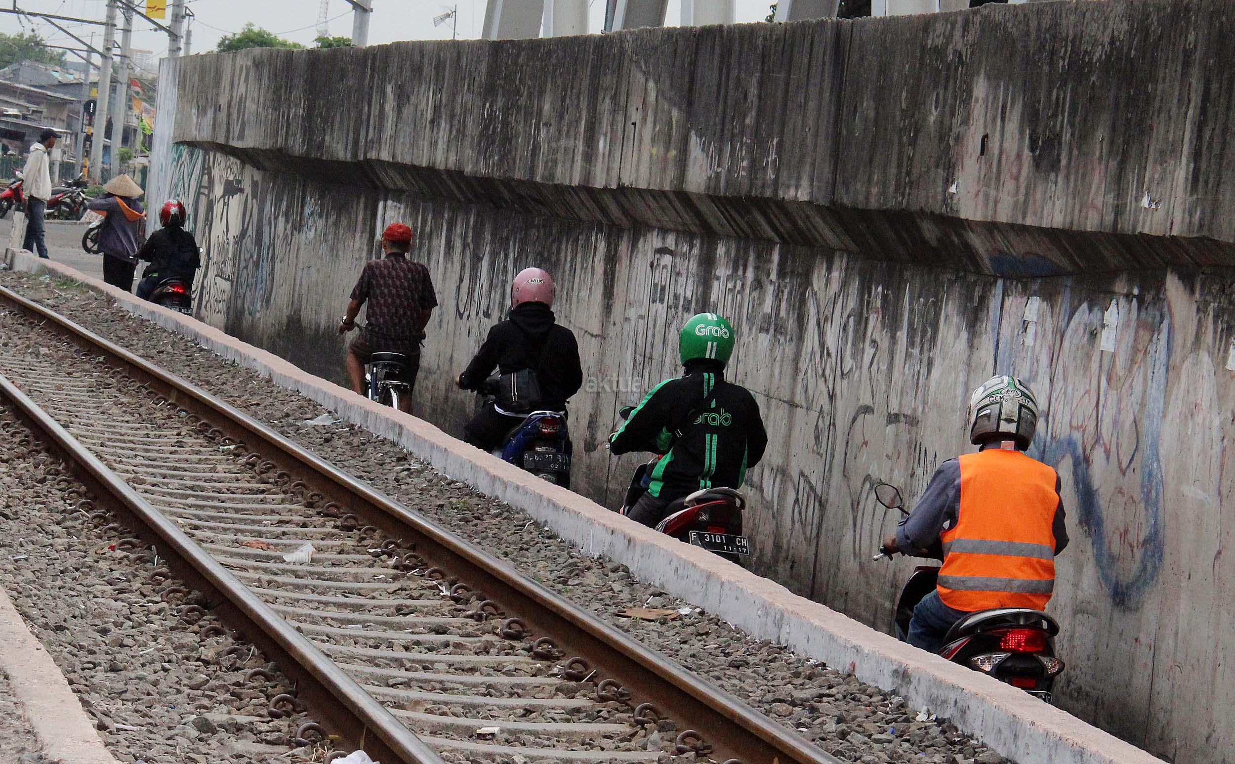 Sejumlah motor melintas disebelah jalur perlintasan kereta api dikawasan Duri Pulo di Jakarta, Senin(20/6/2016). Jarak yang dekat antara jalur motor dan jalur kereta tanpa disadari dapat membahayakan keselamatan pengendara.