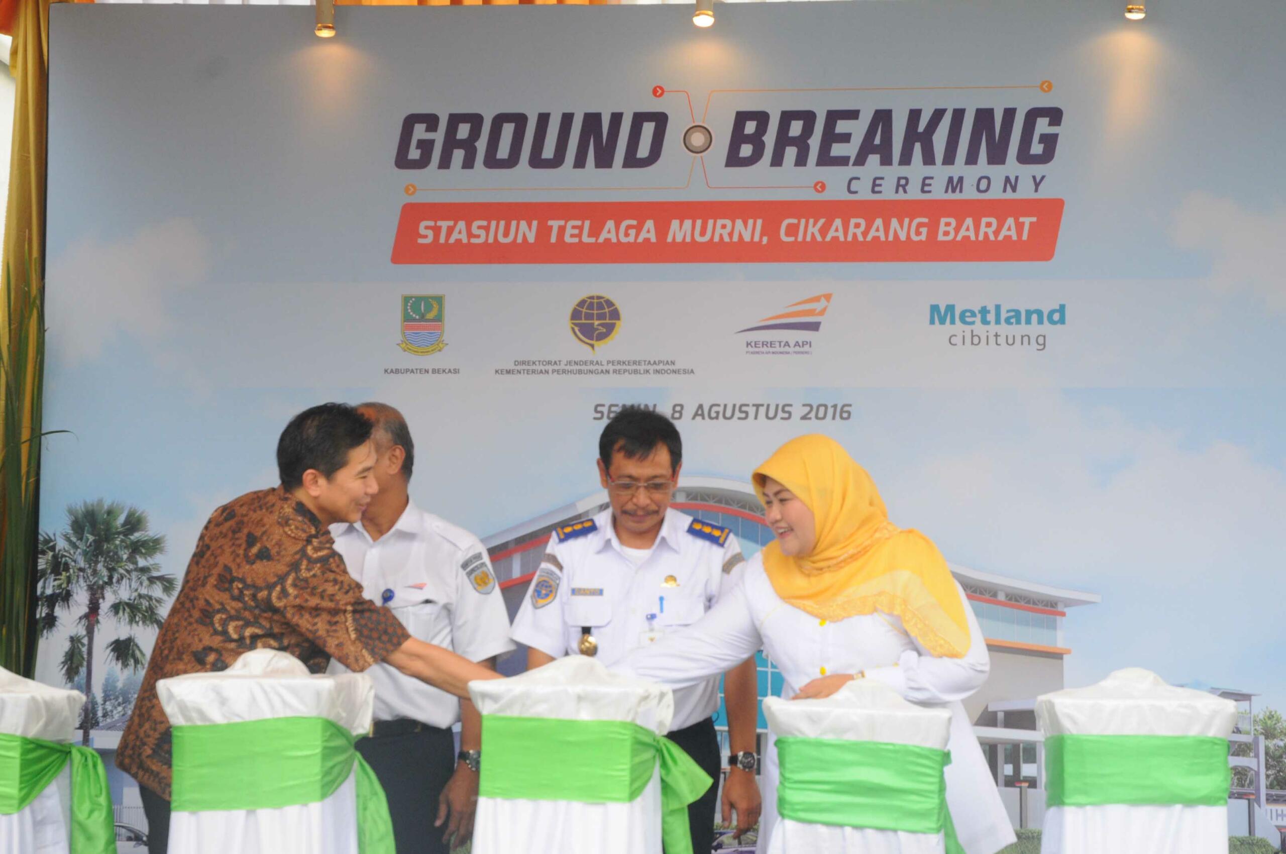 (dari kiri ke kanan) Direktur Prasarana Perkeretaapian Kementrian Perhubungan, Danto Restyawan, Kepala Badan Pengelola Transportasi Jabodetabek Kementerian Perhubungan ,Elly Sinaga,Bupati Kabupaten Bekasi, Neneng Hasanah Yasin, Komisaris PT Metropolitan Land Tbk, Nanda Widya serta Presiden Direktur PT Metropolitan Land Tbk, Thomas JA bersama sama mengacungkan jempol seusai peresmian dimulainya pembangunan stasiun kereta Telaga Murni di Cikarang Barat, Bekasi, Senin (8/8). Pembangunan stasiun ini diestimasikan akan membuat 77 persen commuter beralih menggunakan moda transportasi kereta api. AKTUAL/EKO S HILMAN