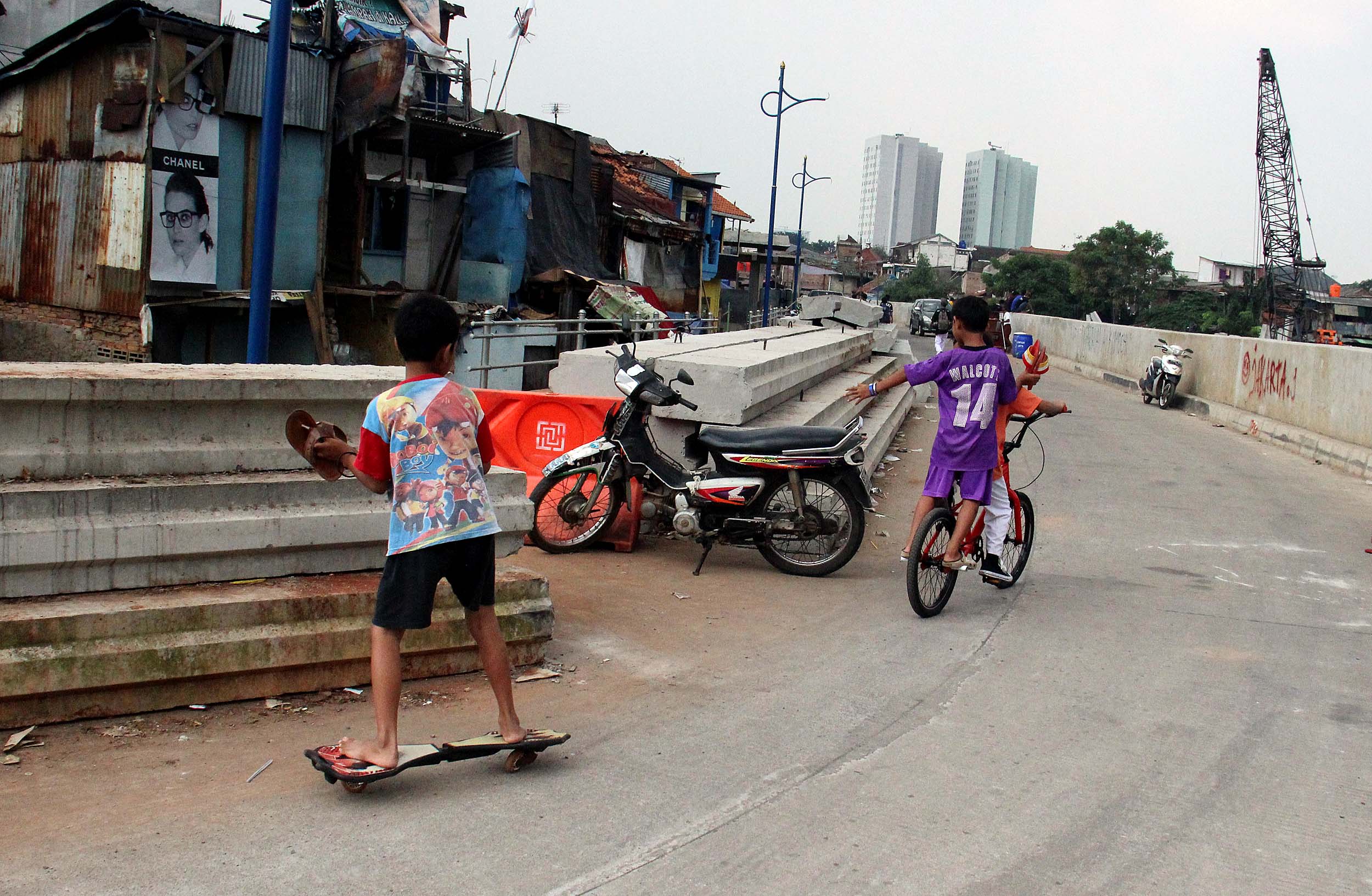Seorang anak bermain sepatu roda melintas di jalan inspeksi yang berada di Kampung Pulo, Jakarta Timur, Selasa (9/8/2016). Anak-anak bermain di jalan inspeksi Kampung Pulo memanfaatkan jalan dan bantaran sungai sebagai tempat bermain. Minimnya lahan bermain menjadi penyebab anak-anak memilih tempat tersebut
