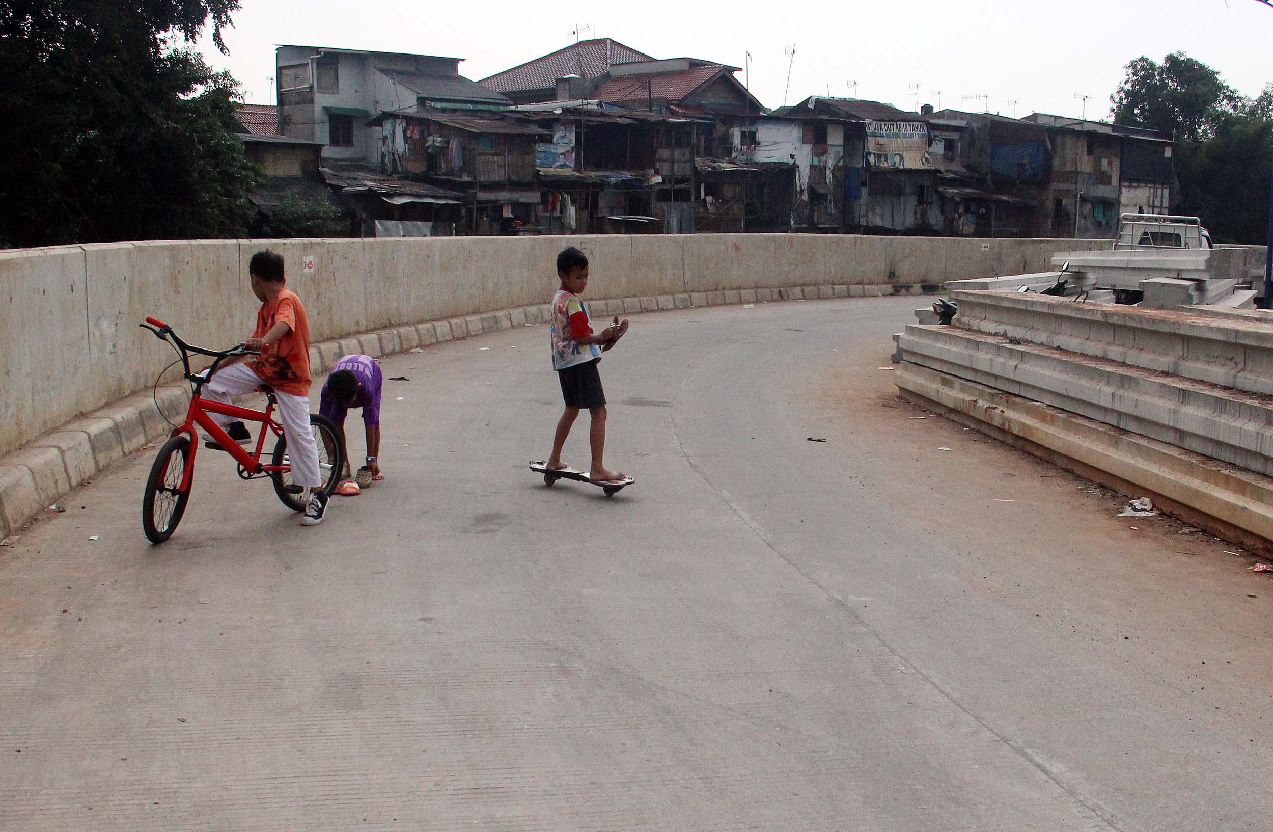 Anak-anak bermain di jalan inspeksi Kampung Pulo memanfaatkan jalan dan bantaran sungai sebagai tempat bermain. Minimnya lahan bermain menjadi penyebab anak-anak memilih tempat tersebut