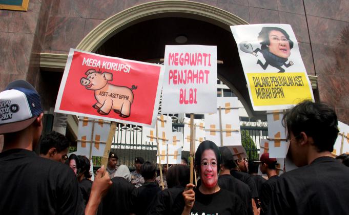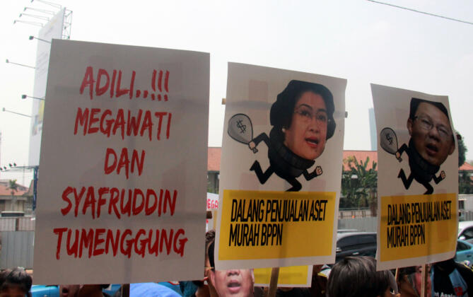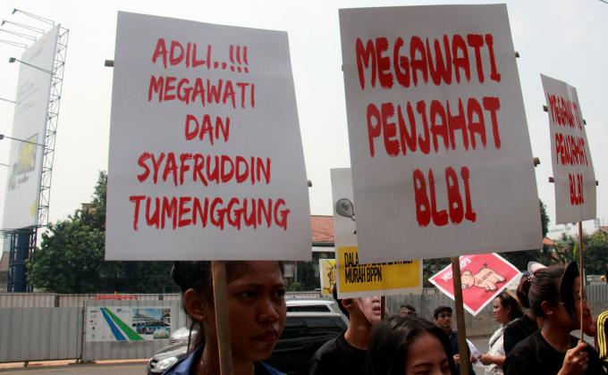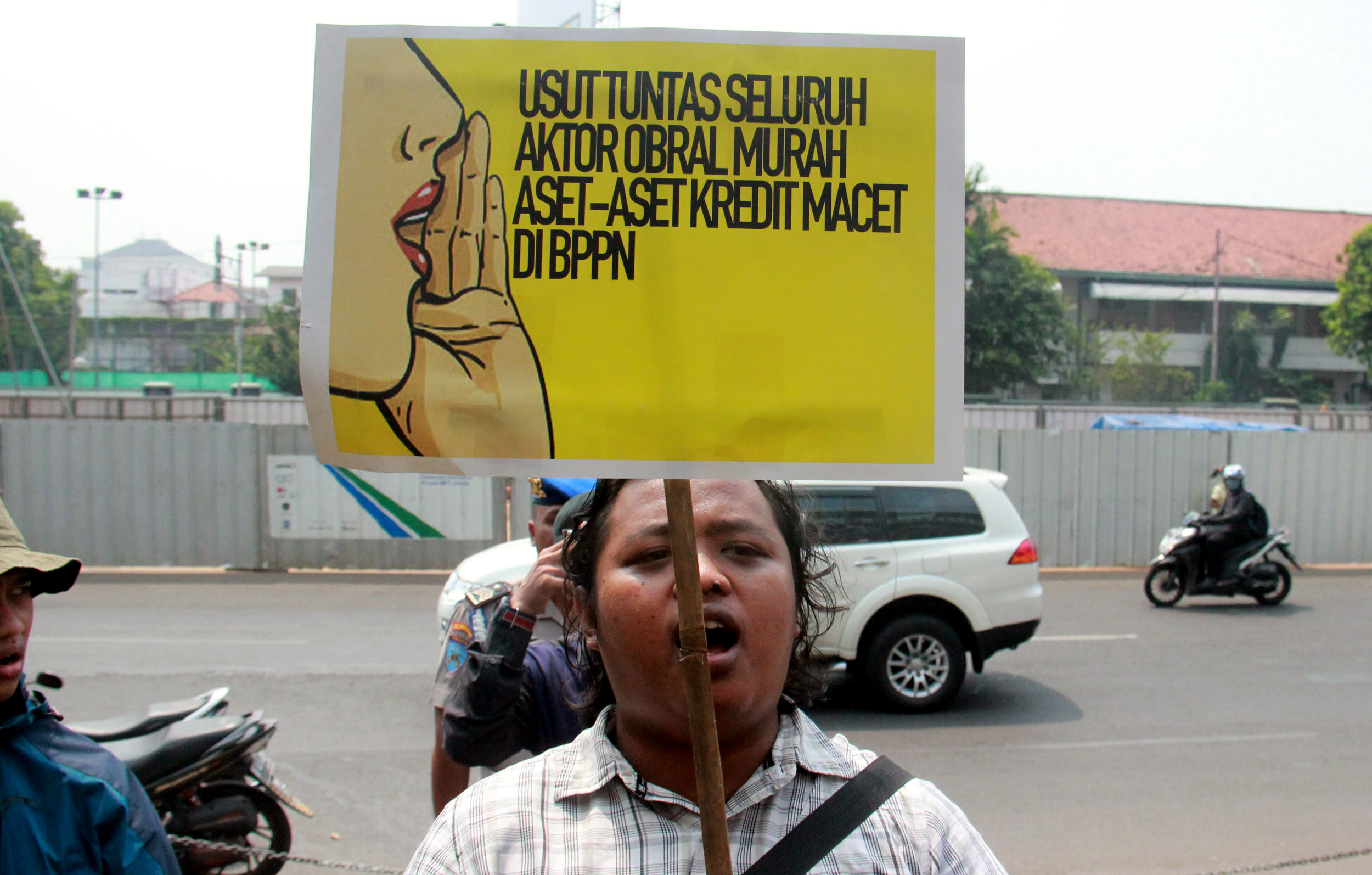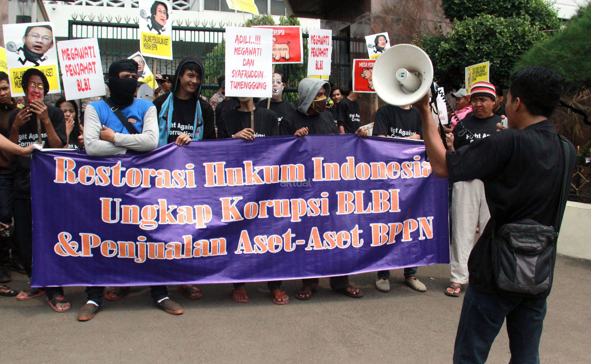 Ratusan aktivis yang tergabung dalam Pemuda Restorasi Anti Korupsi (PERAK) melakukan aksi di depan Kejaksaan Agung, terkait skandal korupsi BLBI dan Penjualan aset - aset BPPN yang merugikan negara ratusan triliun, di Jakarta, Rabu (9/9/2015). Dalam aksinya Perak mendesak Kejagung untuk berani mengungkap dan menangkap mega skandal korupsi BLBI dan penjualan ases-aset BPPN yang melibatkan Presiden ke 5 Megawati Soekarnoputri, Syarifudin Tumenggung dan mantan Menteri BUMN Laksamana Soekardi.