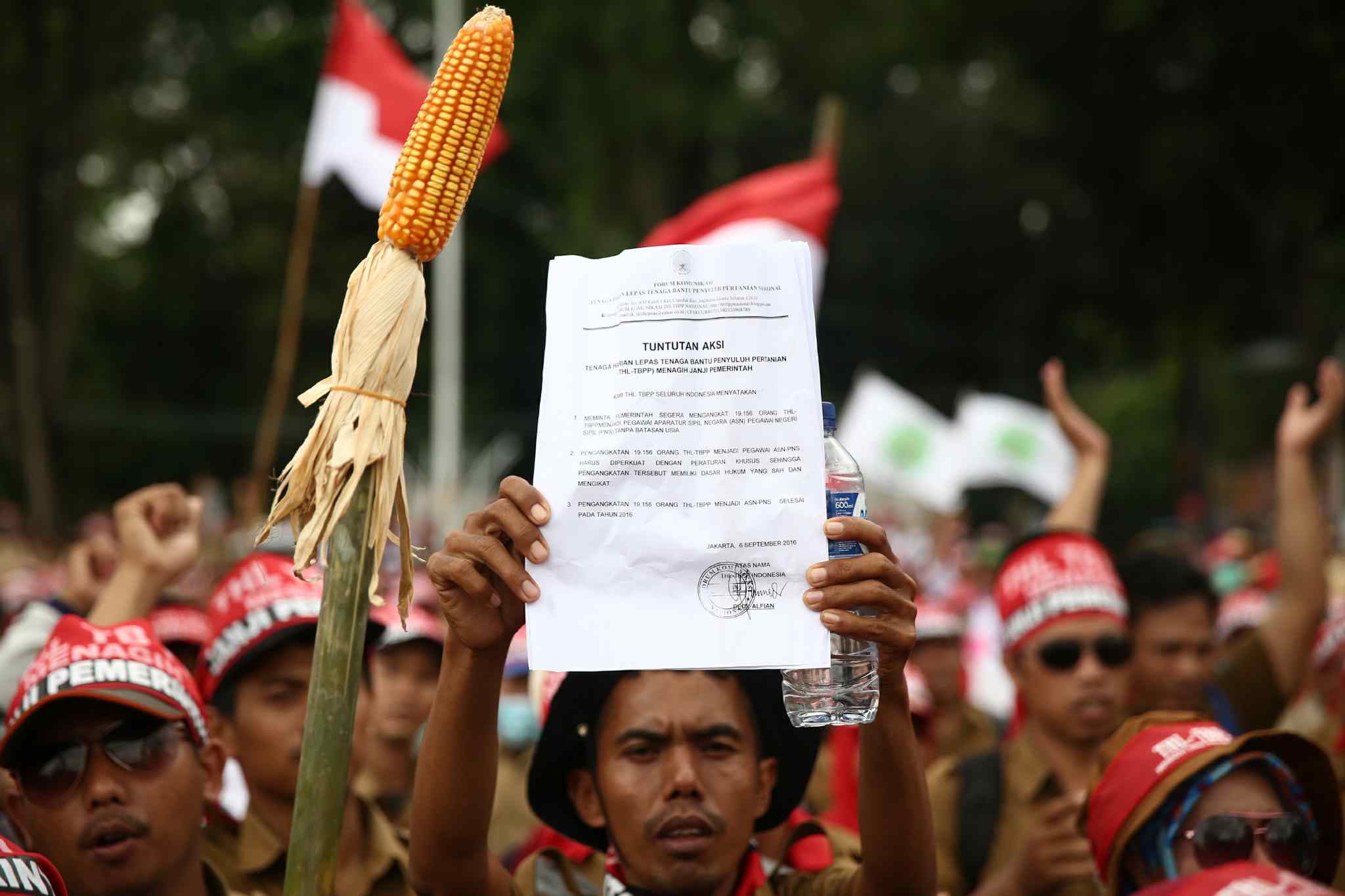 Ratusan Tenaga Harian Lepas Tenaga Bantu Penyuluh Pertanian (THL TBPP) menggelar aksi unjuk rasa di depan Istana Merdeka, Jakarta, Rabu (7/9). Dalam aksinya mereka meminta pemerintah segera mengangkat 19.156 orang THL-TBPP. AKTUAL/TINO OKTAVIANO