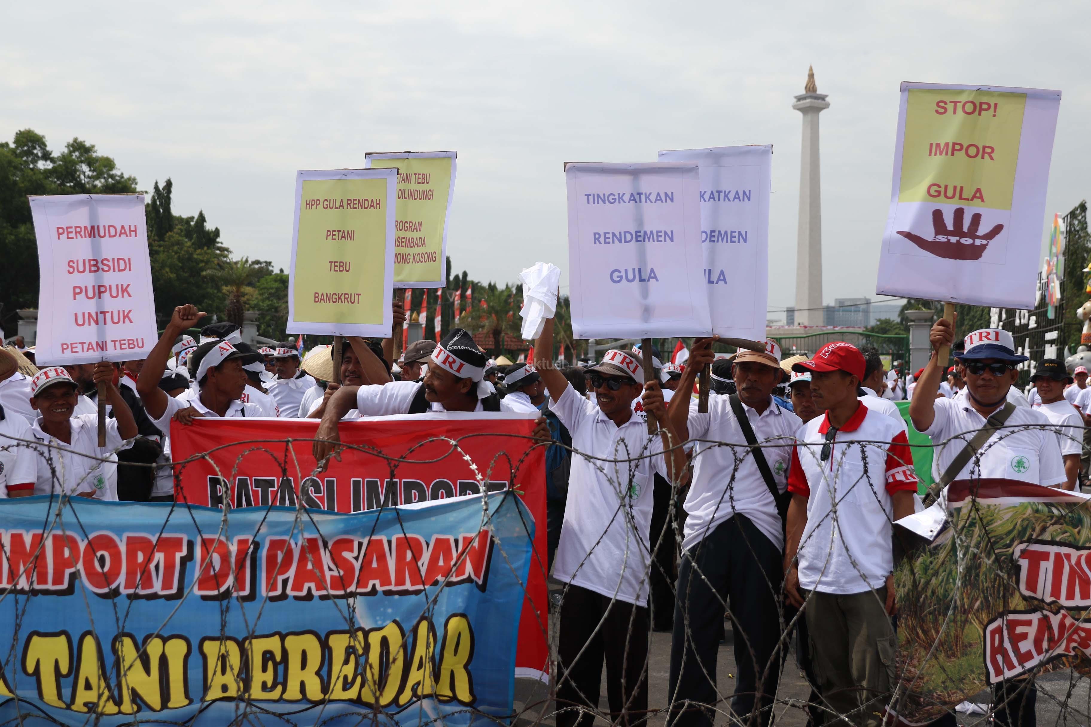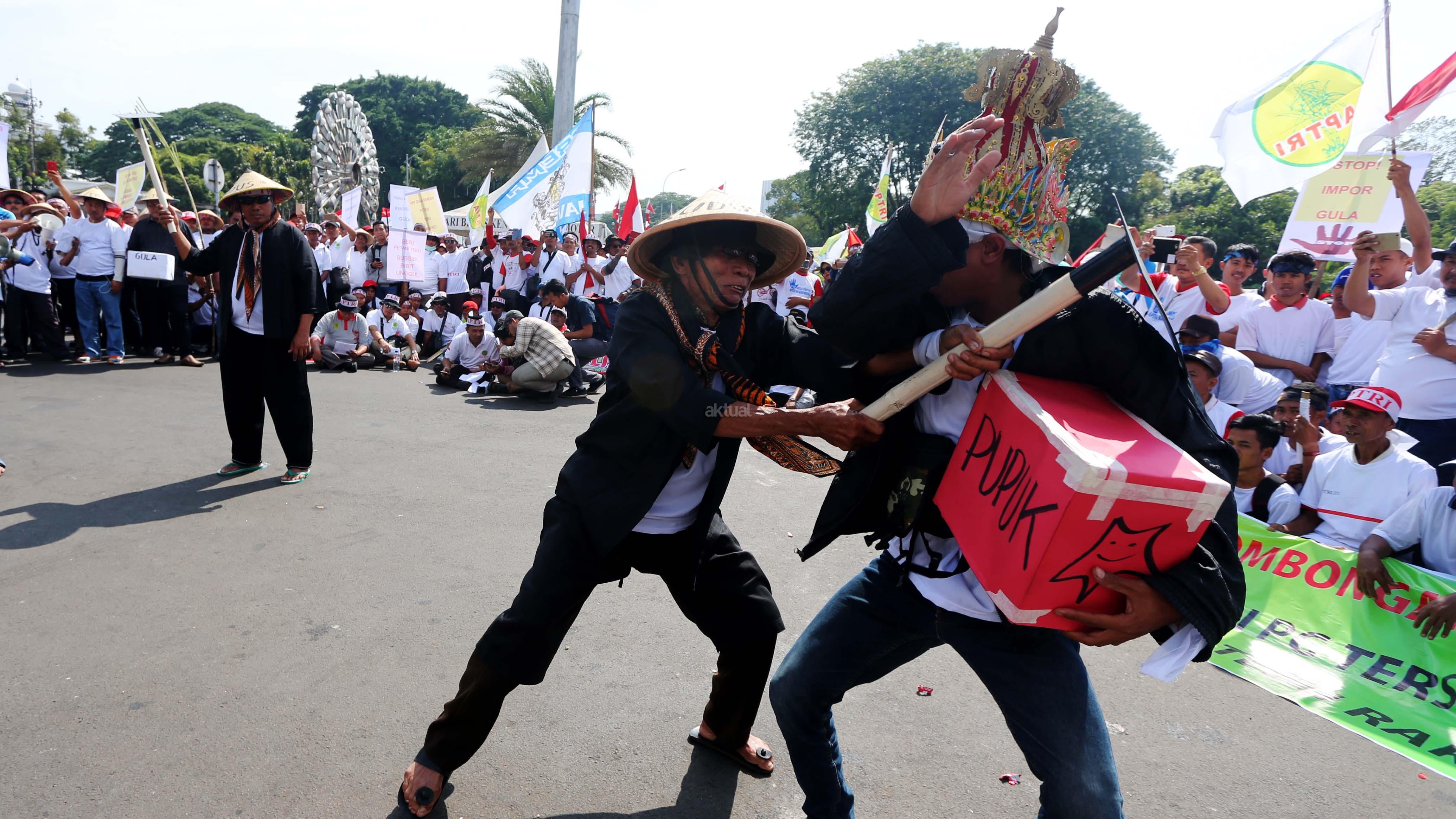 Ribuan petani tebu dari berbagai daerah beunjukrasa di Taman Pandang Istana, Jalan Medan Merdeka Barat, Senin (28/8). Petani menuntut kenaikan harga gula dan meminta pemerintah menghentikan impor gula. Dalam aksinya, petani melakukan unjuk teatrikal dengan menghamburkan sekarung gula rafinasi. Juga penggambaran mafia gula yang dikalahkan para. AKTUAL/Tino Oktaviano