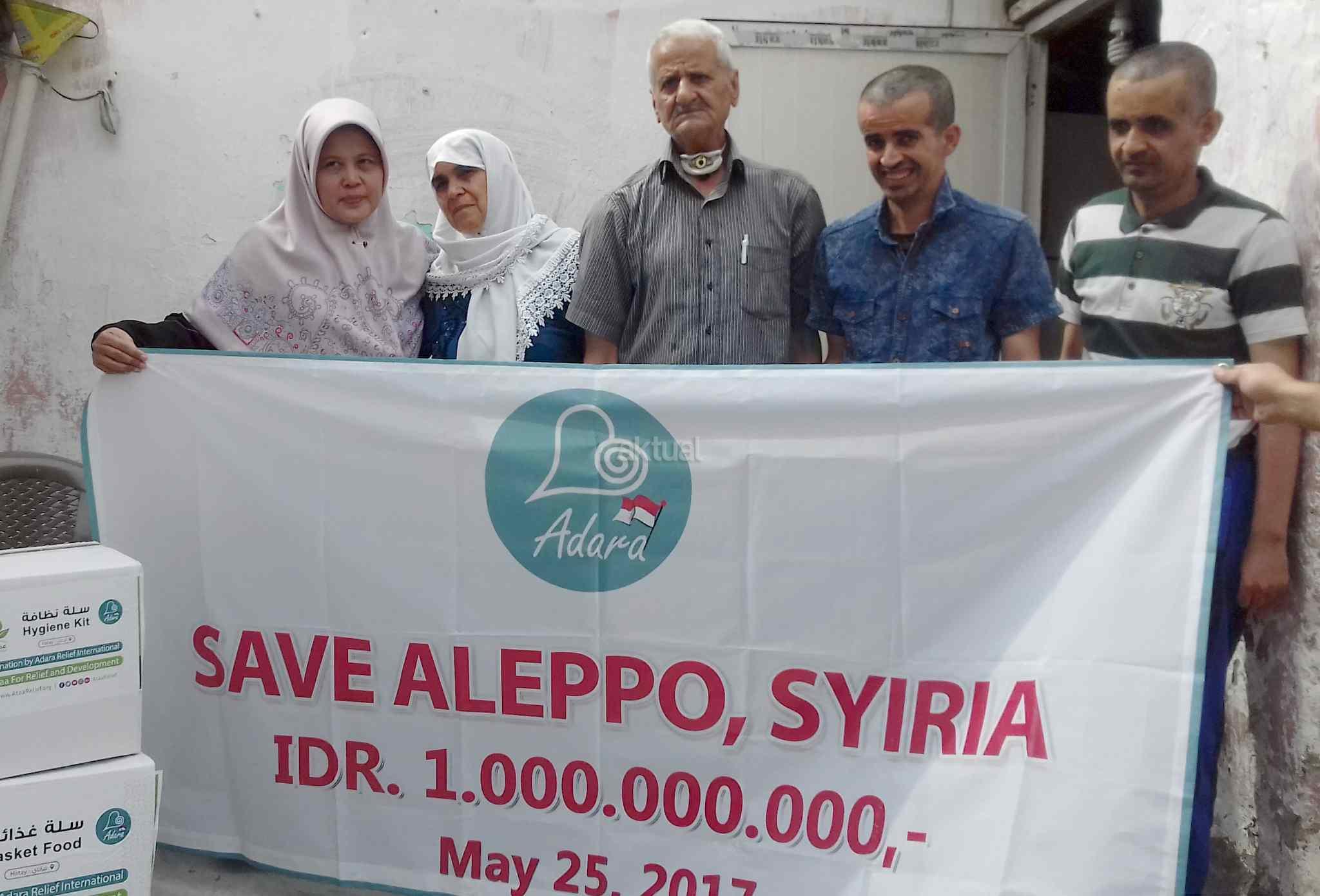 Ketua Adara Relief International, Nurjanah Hulwani menyerahkan bantuan kepada pengungsi Suriah asal Aleppo dan Idlib di Kota Antakya, Provinsi Hatay Turki, Kamis (25/5/2017). Total bantuan yang diserahkan senilai Rp 1 miliar. Bantuan untuk warga Suriah, khususnya Aleppo dan Idlib, diserahkan melalui lembaga sosial kemanusiaan Athaa’ Relief yang berkantor di Istanbul Turki. AKTUAL/HO
