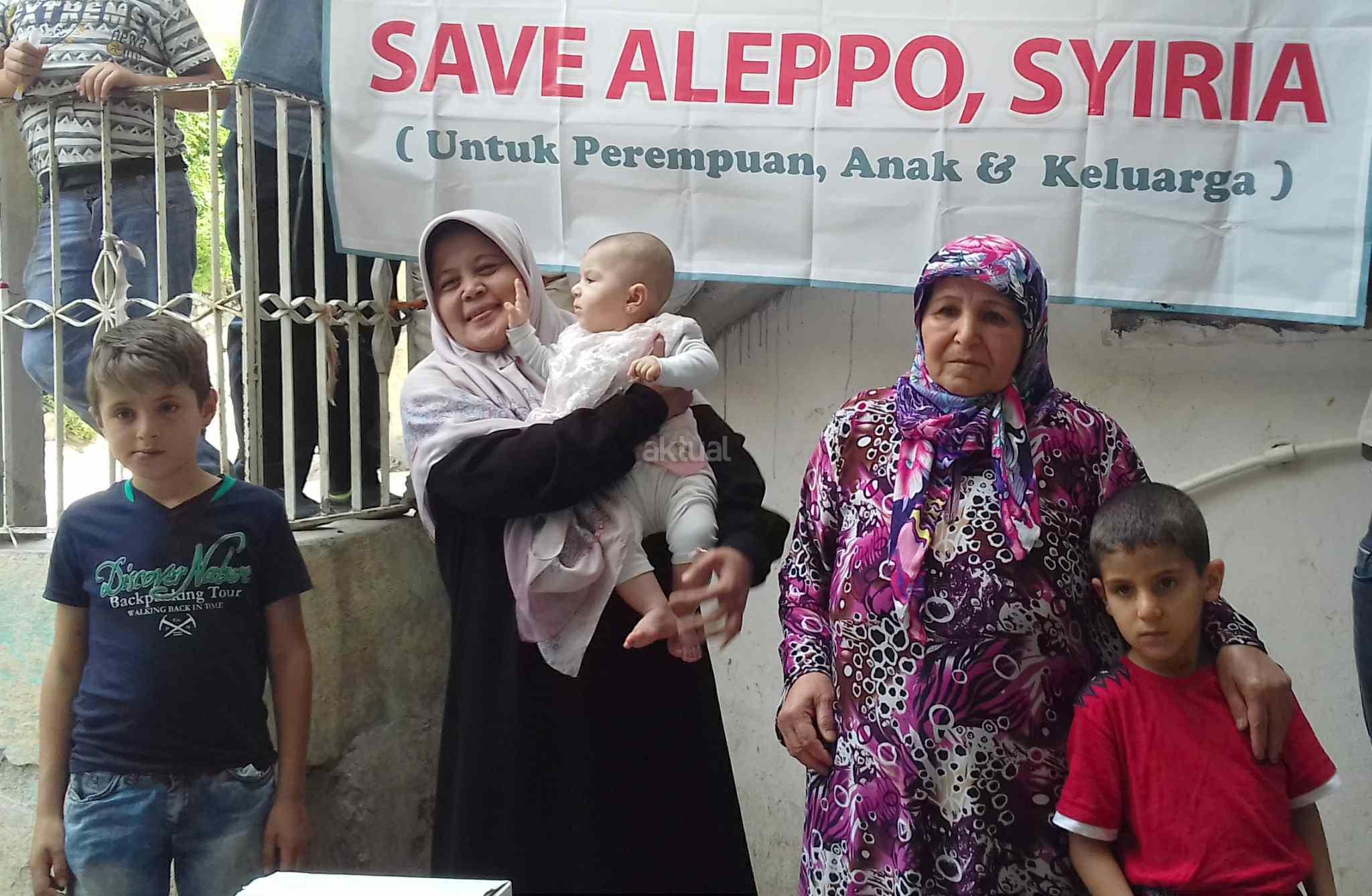 Ketua Adara Relief International, Nurjanah Hulwani (menggendong bayi) menyerahkan bantuan kepada pengungsi Suriah asal Aleppo dan Idlib di Kota Antakya, Provinsi Hatay Turki, Kamis (25/5/2017). Total bantuan yang diserahkan senilai Rp 1 miliar. Bantuan untuk warga Suriah, khususnya Aleppo dan Idlib, diserahkan melalui lembaga sosial kemanusiaan Athaa’ Relief yang berkantor di Istanbul Turki. AKTUAL/HO