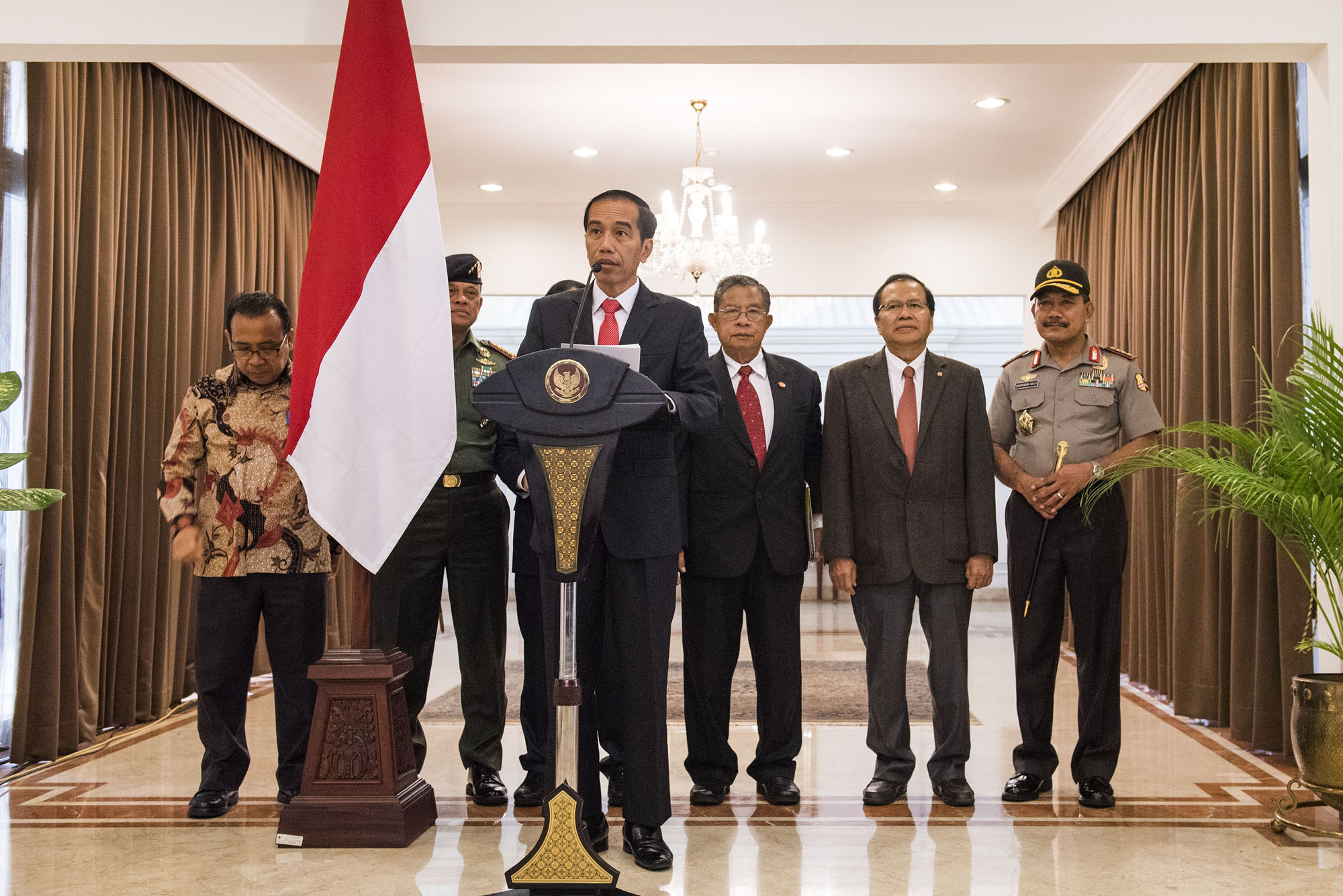 Presiden Joko Widodo (tengah) didampingi Kapolri Jenderal Pol Badrodin Haiti (kanan), Menteri Koordinator Kemaritiman dan Sumber Daya Rizal Ramli (kedua kanan), Menteri Koordinator Perekonomian Darmin Nasution (ketiga kanan), Panglima TNI Jenderal TNI Jenderal Gatot Nurmantyo (kedua kiri) dan Menteri Sekretariat Negara Pratikno (kiri) memberikan keterangan kepada wartawan sebelum kunjungan kenegaraan di Bandara Internasional Halim Perdanakusumah, Jakarta, Jumat (11/9). Joko Widodo akan melaksanakan kunjungan kenegaraan ke Arab Saudi, Qatar, dan Uni Emirat Arab untuk pembicaraan kerja sama di bidang ekonomi. ANTARA FOTO/M Agung Rajasa/Spt/15.