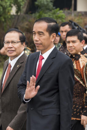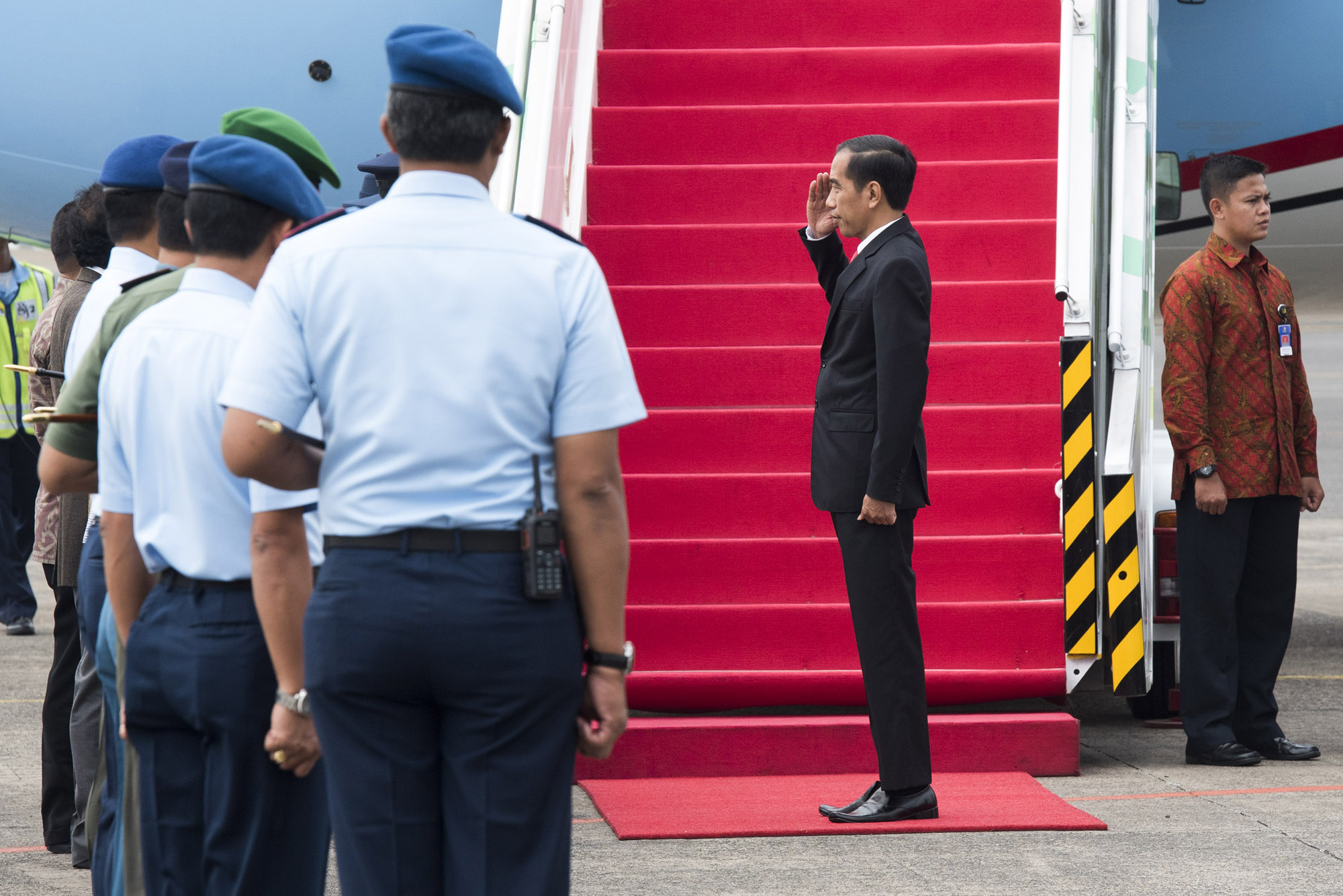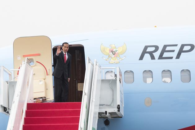 Presiden Joko Widodo membalas hormat sebelum memasuki pesawat kepresidenan di Bandara Internasional Halim Perdanakusumah, Jakarta, Jumat (11/9). Joko Widodo akan melaksanakan kunjungan kenegaraan ke Arab Saudi, Qatar, dan Uni Emirat Arab untuk pembicaraan kerja sama di bidang ekonomi. ANTARA FOTO/M Agung Rajasa/Spt/15.