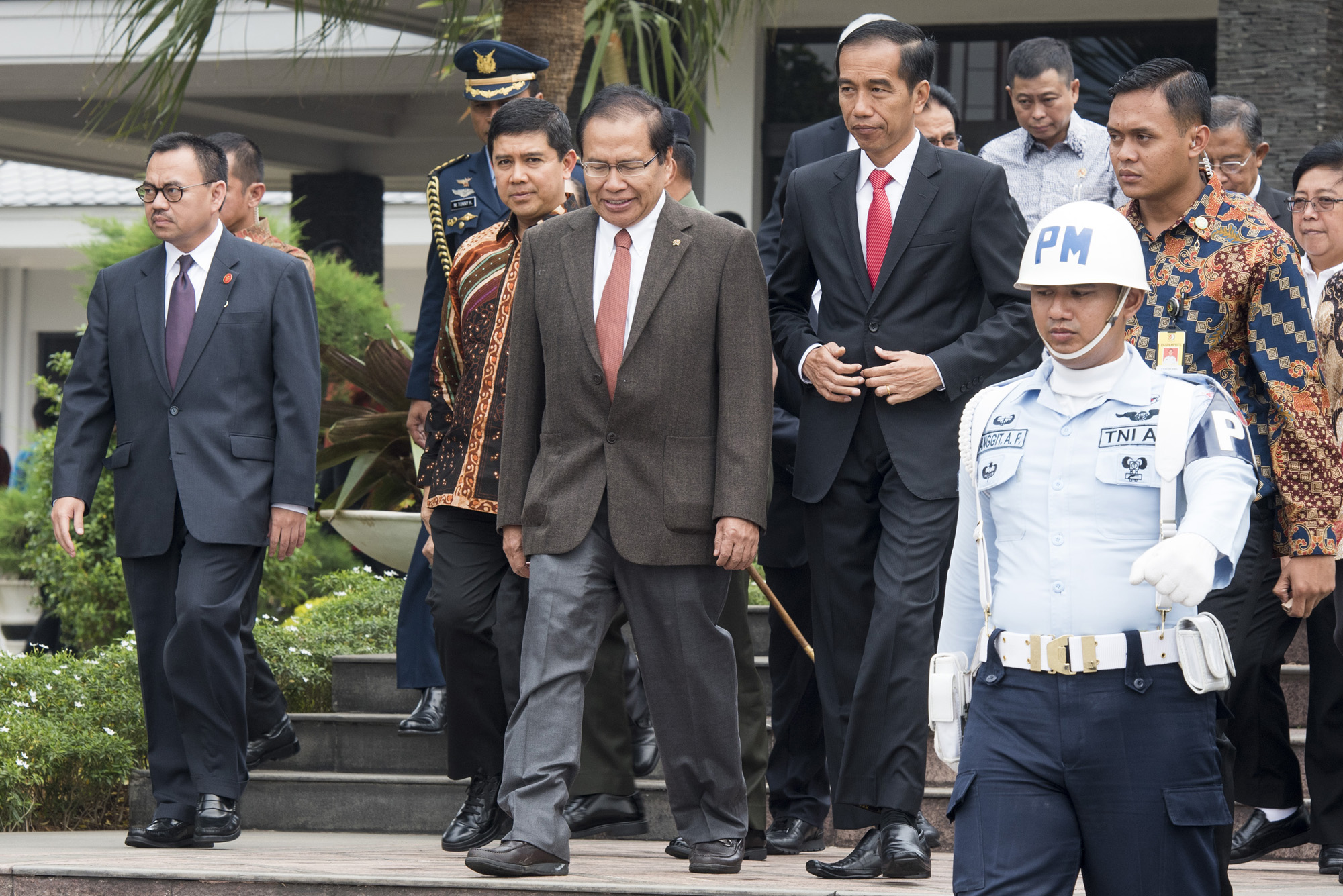 Presiden Joko Widodo (kedua kanan) didampingi Menko Bidang Maritim dan Sumber Daya Rizal Ramli (ketiga kiri), Menteri Pendayagunaan Aparatur Negara dan Reformasi Birokrasi Yuddy Chrisnandi (kedua kiri) dan Menteri ESDM Sudirman Said (kiri) berjalan menuju pesawat Kepresidenan sebelum kunjungan kenegaraan di Bandara Internasional Halim Perdanakusumah, Jakarta, Jumat (11/9). Joko Widodo akan melaksanakan kunjungan kenegaraan ke Arab Saudi, Qatar, dan Uni Emirat Arab untuk pembicaraan kerja sama di bidang ekonomi. ANTARA FOTO/M Agung Rajasa/Spt/15.