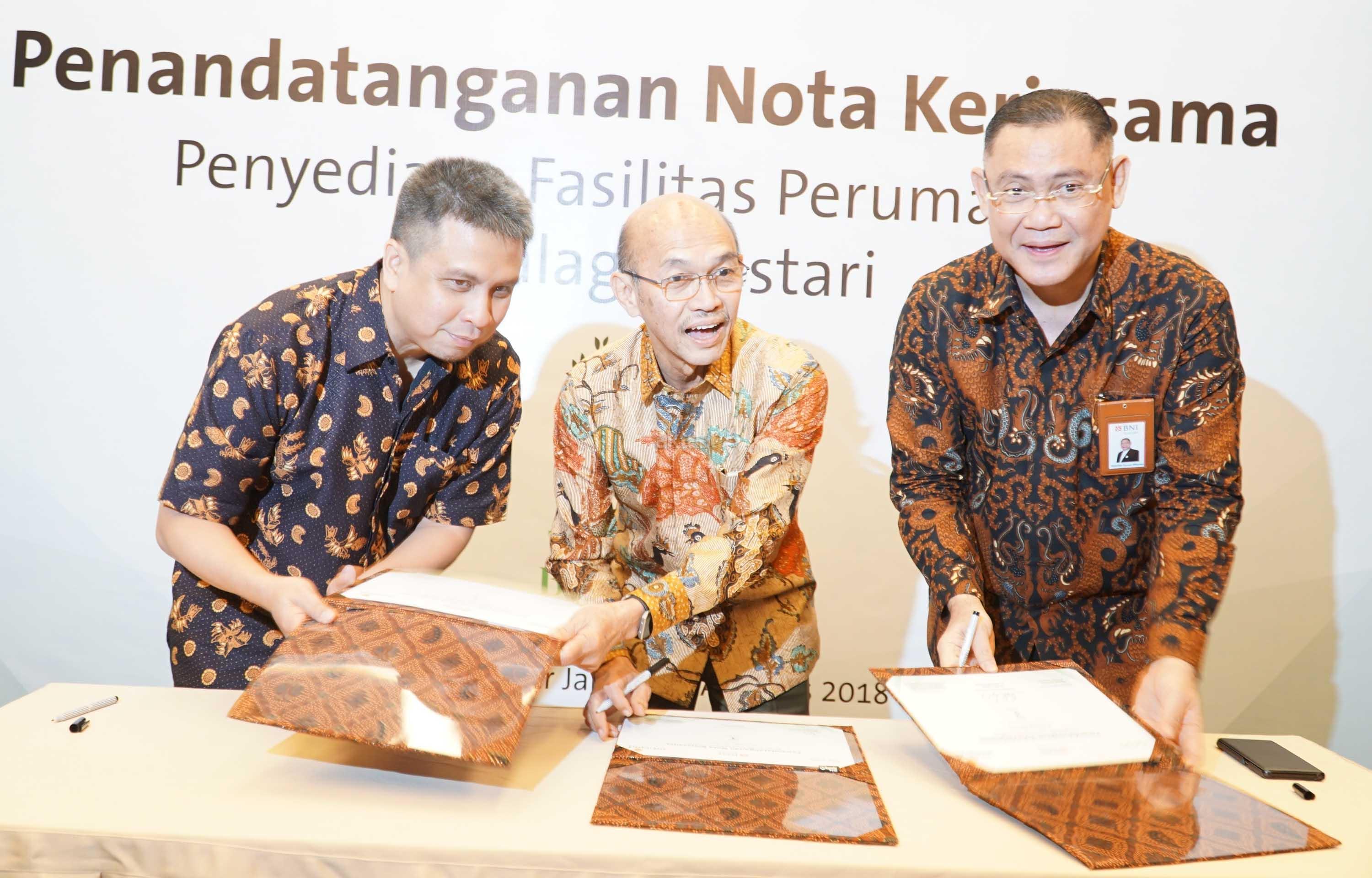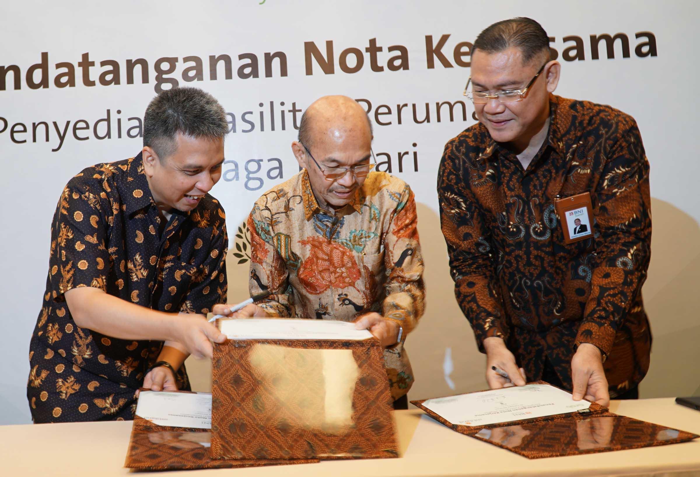 (Ki-Ka ) Ridzki Kramadibrata, Managing Director PT Grab Indonesia, Suhendro Prabowo, Wakil Presiden Direktur & COO PT Intiland Development Tbk, Abdullah Firman Wibowo, Direktur Utama PT Bank BNI Syariah saat melakukan penandatangan penyediaan fasilitas perumahan di Jakarta, Rabu (8/8). Perusahaan pengembang properti PT Intiland Development Tbk bersama PT Grab Indonesia dan PT Bank BNI Syariah menjalin sinergi kerjasama strategis berupa penyediaan fasilitas perumahan dan pembiayaan bagi para Mitra Grab Indonesia di Kawasan perumahan Talaga Bestari,Tangerang. Talaga Bestari merupakan salah satu pengembangan proyek kawasan hunian terpadu yang modern seluas 308 hektar yang dikembangkan Intiland. AKTUAL/Eko S Hilman