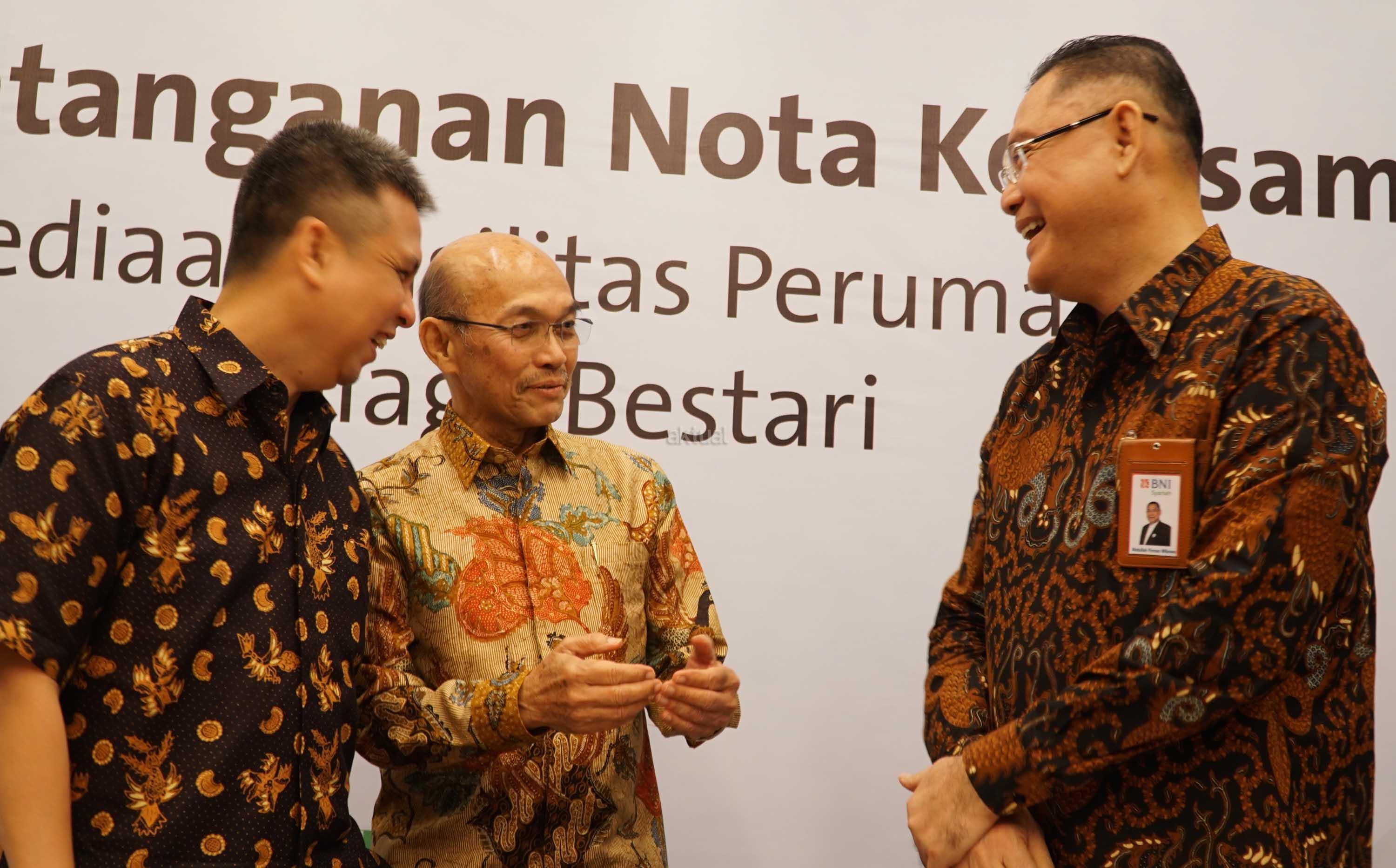 (Ki-Ka ) Ridzki Kramadibrata, Managing Director PT Grab Indonesia, Suhendro Prabowo, Wakil Presiden Direktur & COO PT Intiland Development Tbk, Abdullah Firman Wibowo, Direktur Utama PT Bank BNI Syariah berbincang usai melakukan penandatangan penyediaan fasilitas perumahan di Jakarta, Rabu (8/8). Perusahaan pengembang properti PT Intiland Development Tbk bersama PT Grab Indonesia dan PT Bank BNI Syariah menjalin sinergi kerjasama strategis berupa penyediaan fasilitas perumahan dan pembiayaan bagi para Mitra Grab Indonesia di Kawasan perumahan Talaga Bestari,Tangerang. Talaga Bestari merupakan salah satu pengembangan proyek kawasan hunian terpadu yang modern seluas 308 hektar yang dikembangkan Intiland. AKTUAL/Eko S Hilman